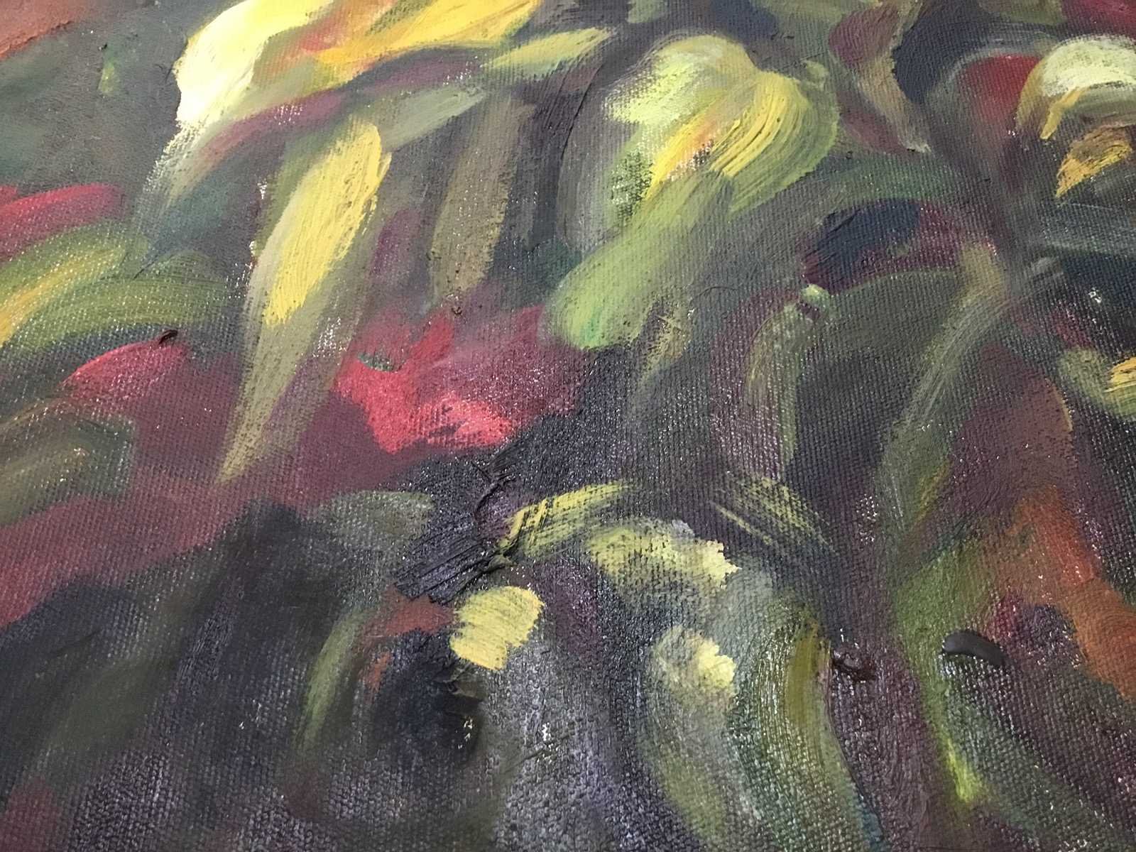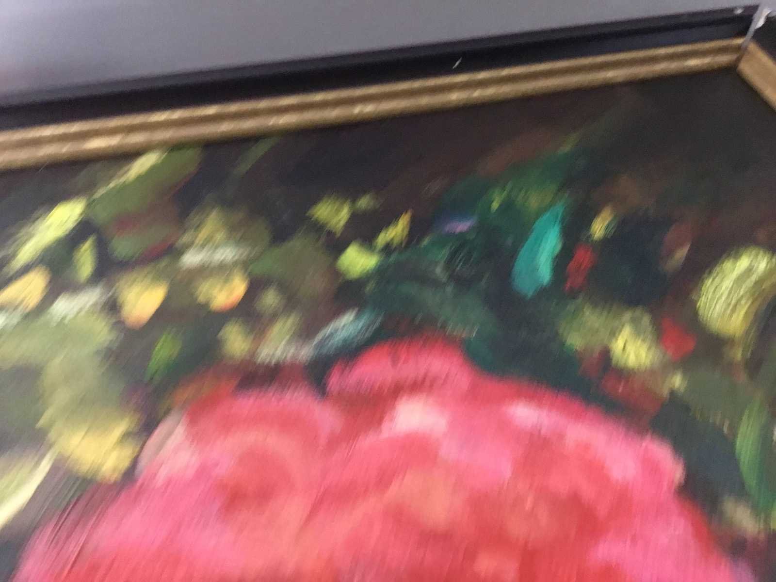 Het schilderij in een donkere lijst, met een bloemmotief in rode en groene tinten. Het betreft een artistiek kunstwerk op canvas, vermoedelijk een olieverfschilderij of acrylverfschilderij. Nee Titel van werk: Bloemen Hoogte: 84cm Breedte: 59cm Frame: true