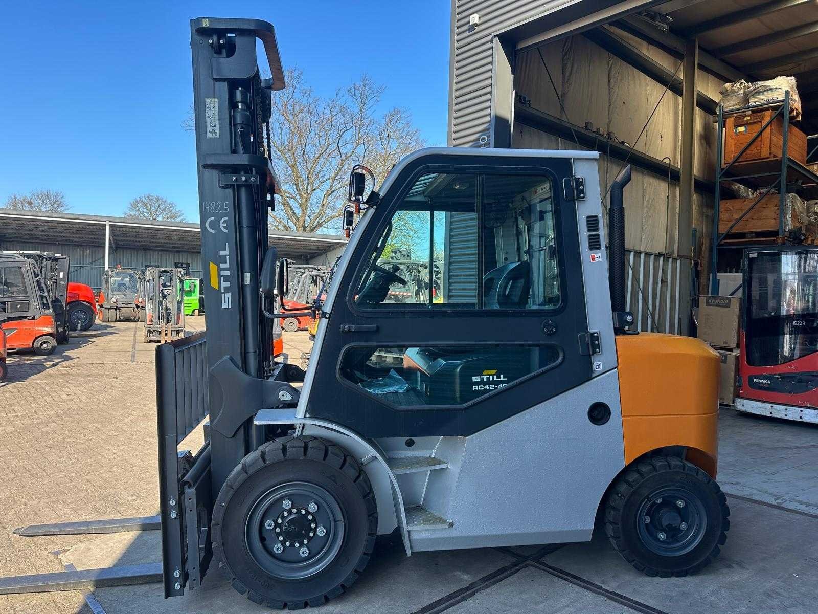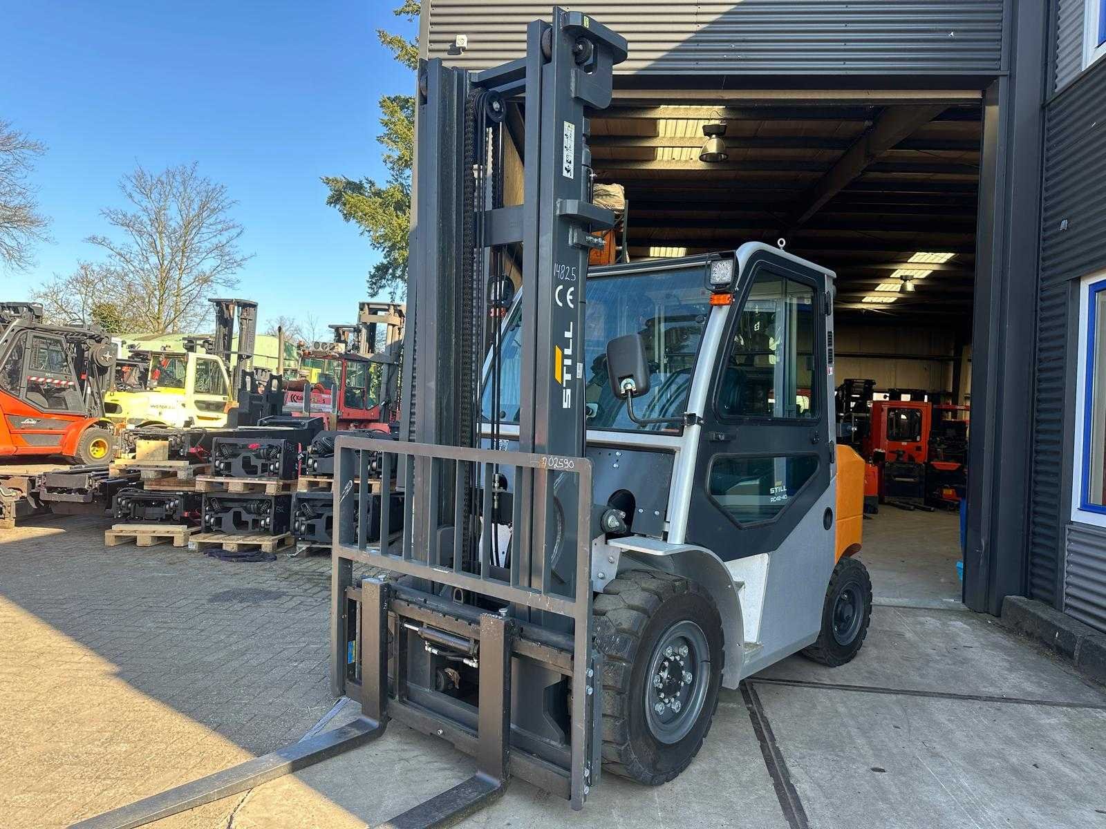 4de functie tot vorkenbord Nee Merk: Still Type: RC42-40 Bouwjaar: 2021 Brandstof: Diesel Mast: Duplex Aantal wielen: 4 Afgelezen urenstand: 16 Side-shift: true Duplex mast: true Eigen gewicht: 7150kg Hefvermogen: 4000kg Lepellengte: 1200mm Hefhoogte: 4000mm Vol rubber banden: true