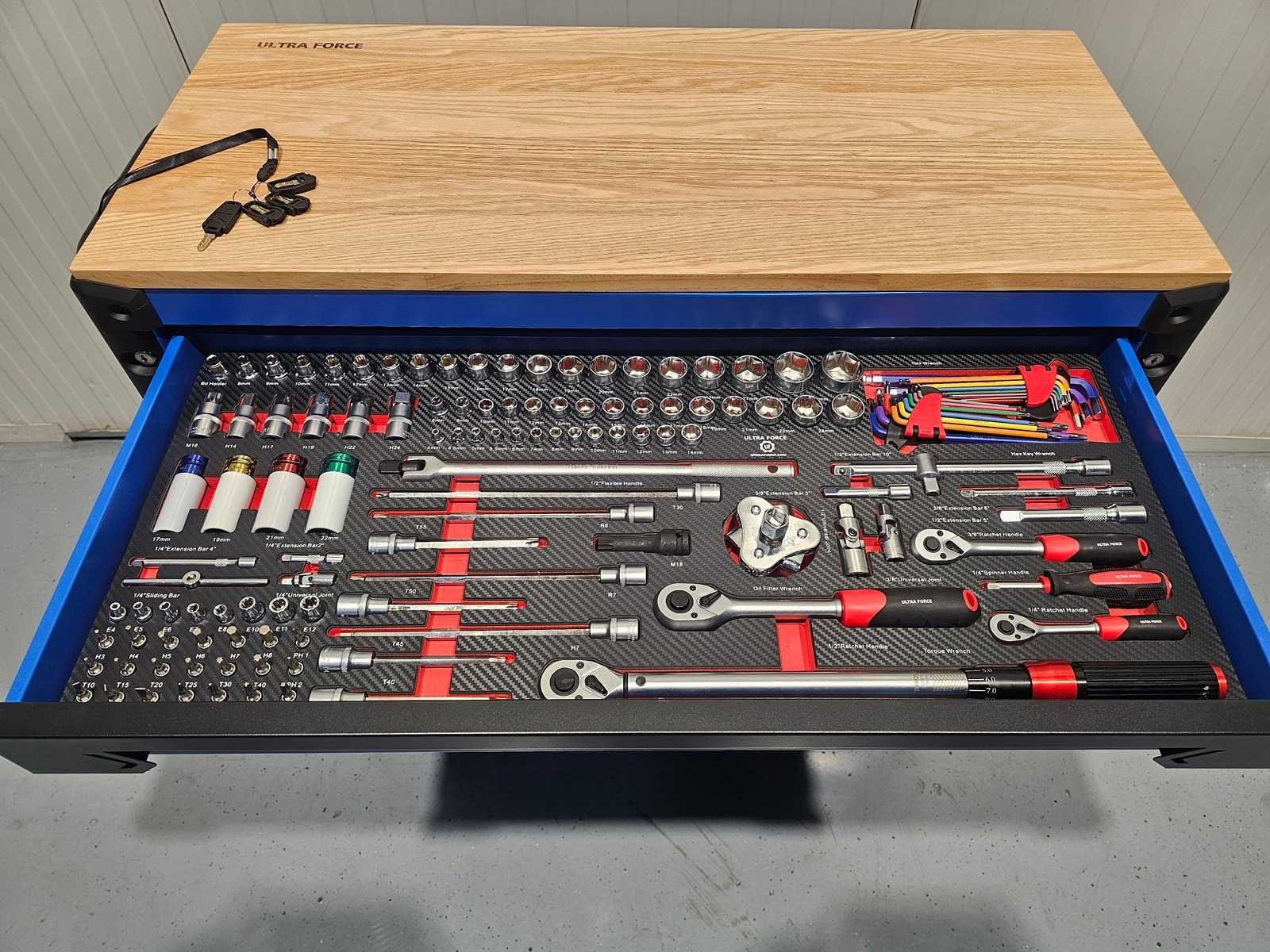 Professionele gereedschapswagen 12 laden, 293 pcs EN een 4 delige accu gereedschap set. Gereedschapswagen 12 laden waarvan 11 gevuld met 293 pcs gereedschap Heavy equipment. 600 kg laadvermogen. Softclose-mechanisme. 2 zwenkwielen en 4 sleutels. En een 4 delige accu gereedschap set: schroefmachine - slagmoersleutel - boormachine en slijper. Inclusief 2 accu's, oplader en diverse accessoires in koffer. Cordless power tools set Nee Merk: Ultra Force Equipment Type: Jumbo Gewicht: 132kg Lengte: 112cm Breedte: 50cm Hoogte: 103cm