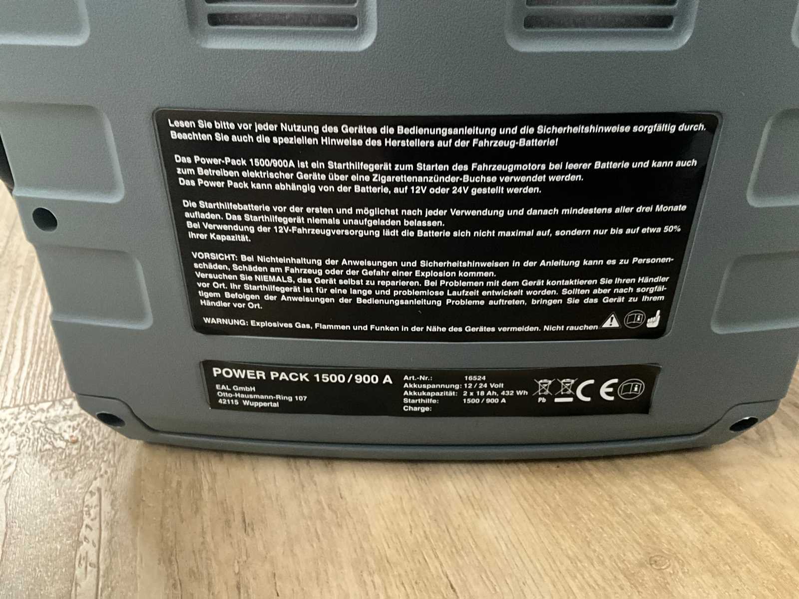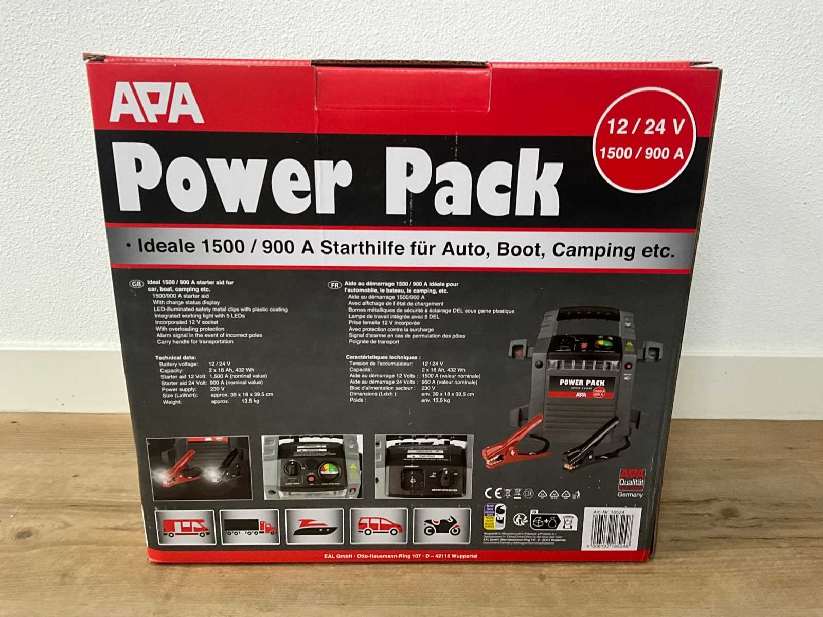 1500/900 Ampère; voorzien van geïntegreerde LED werklamp; inclusief 230 Volt oplader (netadapter) en 12 Volt autolader; ongebruikt in doos No Merk: A.P.A. Type: 12/24V Spanning: 24V Met starthulpfunctie: true Aansluiting: 230V