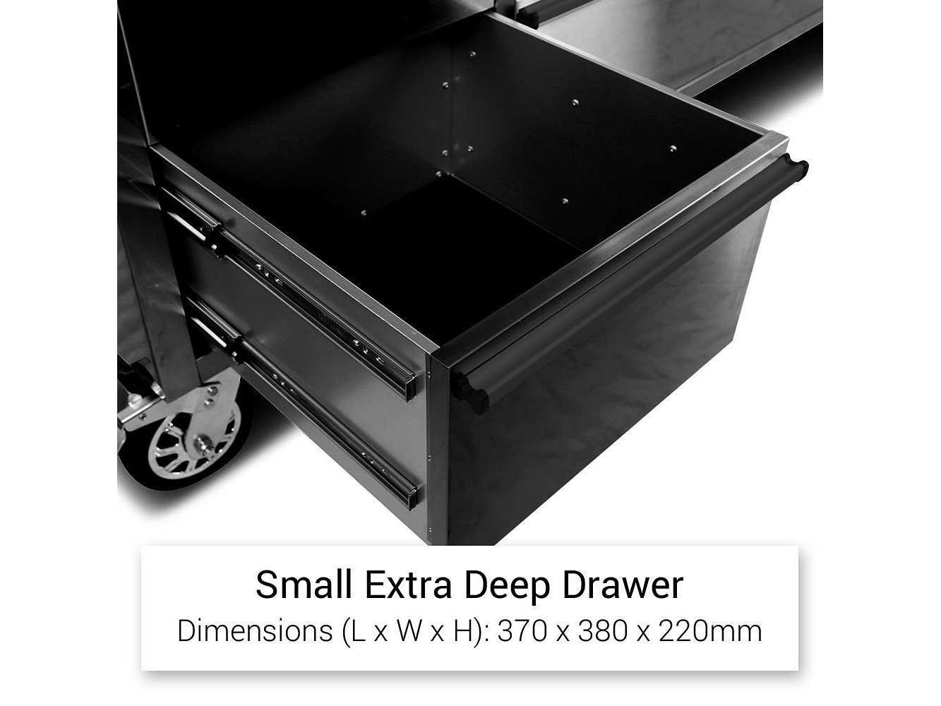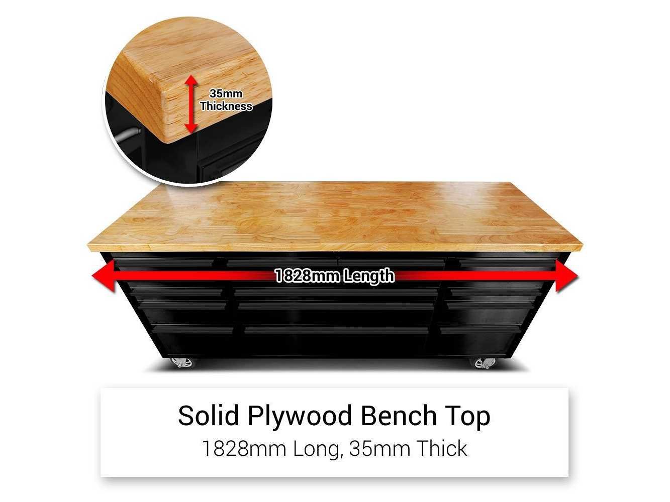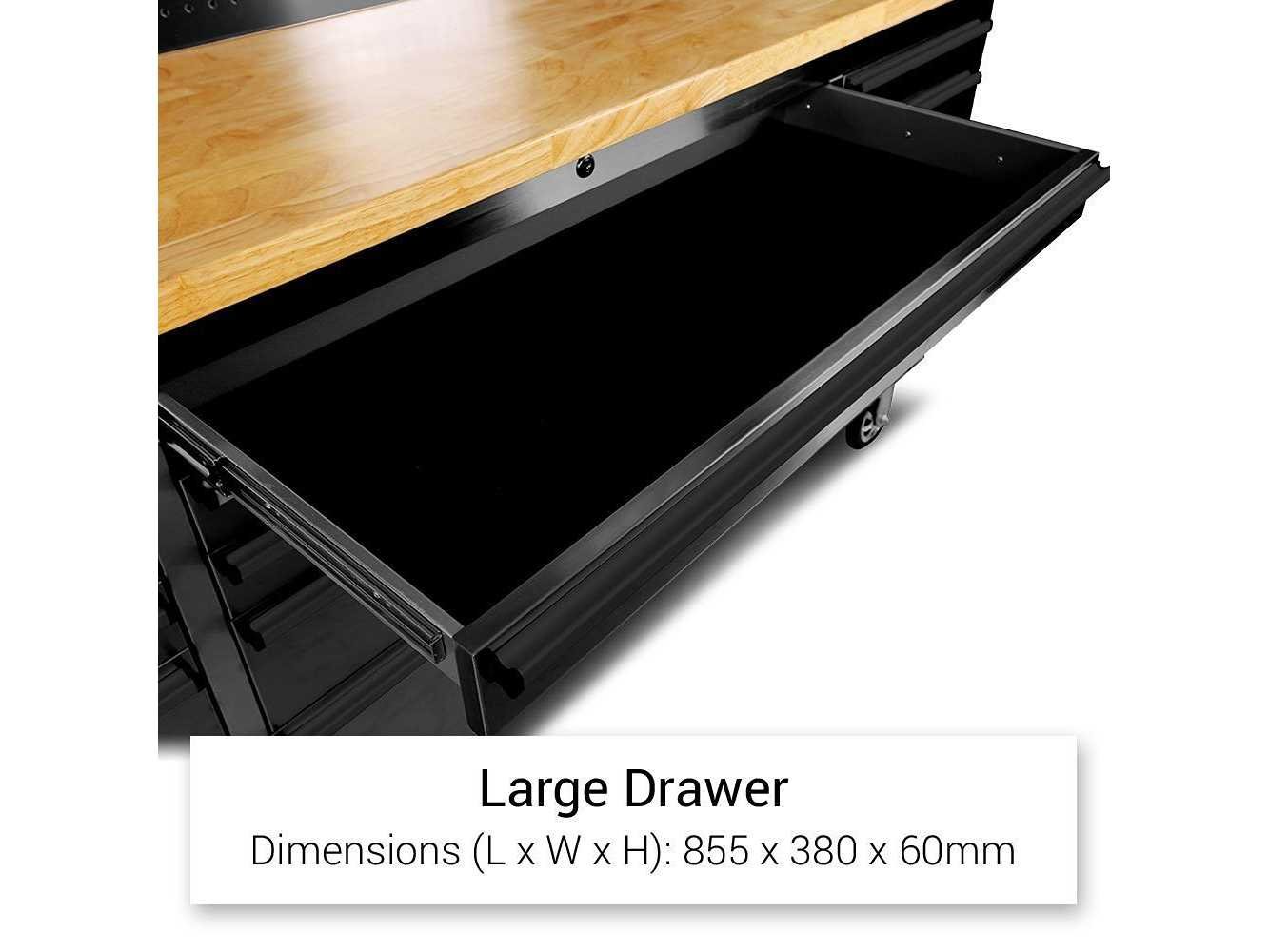 Breedte 180 cm Voorzien van poedercoating, luxe afgewerkt rubberhouten werkblad, 15 laden, 4 zwenkwielen (2 voorzien van rem), ongebruikt in doos. No Merk: Field Type: 7215 Black Premium Bouwjaar: 2025