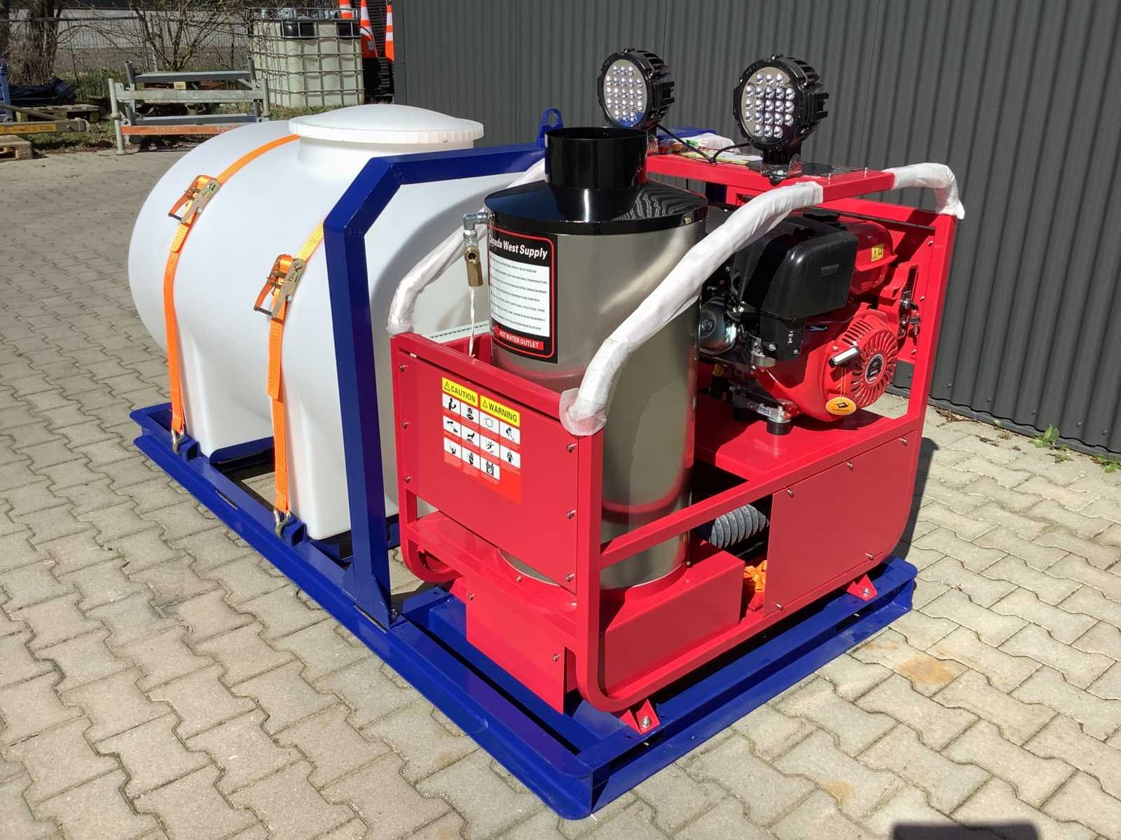 Voorzien van warmwater met 700 liter buffertank, instelbare temperatuur tot maximaal 90°C, RVS diesel gestookt brandersysteem, max. werkdruk 250 bar, 2x LED werklamp, watertank, hogedrukslang lengte 17 meter, hogedruk spuitlans,elektrische start, 15 pk 4-takt benzinemotor voor pomp, 4 extra nozzles, venturi ventiel aansluiting voor toevoeging chemische vloeistof, ongebruikt No Merk: Canadian West Type: Diesel Industrial Pressure Washer Bouwjaar: 2025 Maximale werkdruk: 250bar Temperatuurbereik max.: 90°c