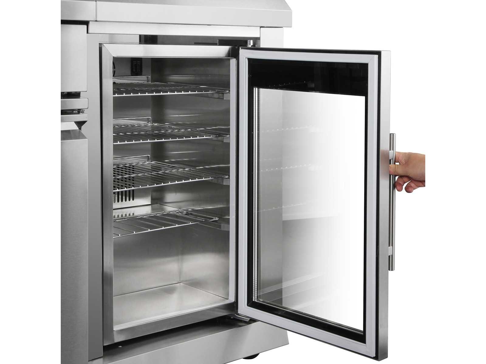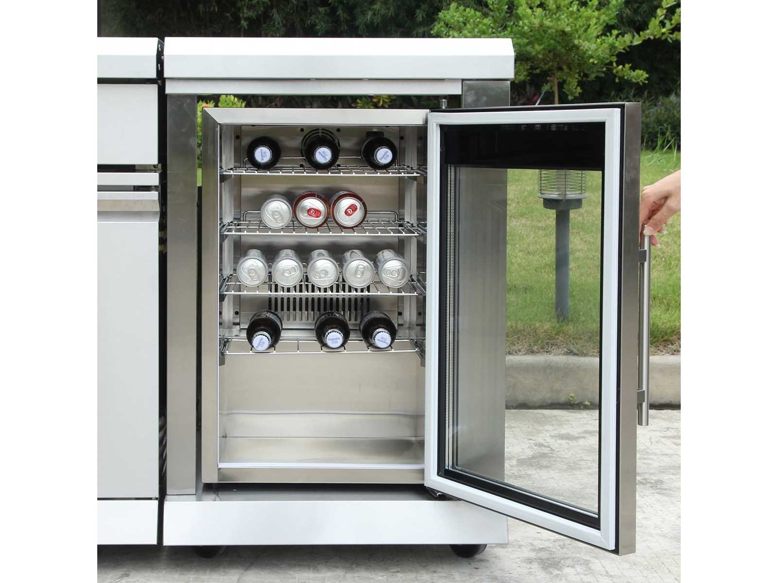 Modulair systeem, bestaande uit: RVS roestvrijstalen barbecue/grill, koelkast, spoelbak + keukenkraan, diverse kast- en opbergruimte. No Merk: Field Outdoor Model: De Luxe Stainless Product type: #2 Lengte: 59cm Breedte: 262cm Hoogte: 121cm Materiaal: RVS