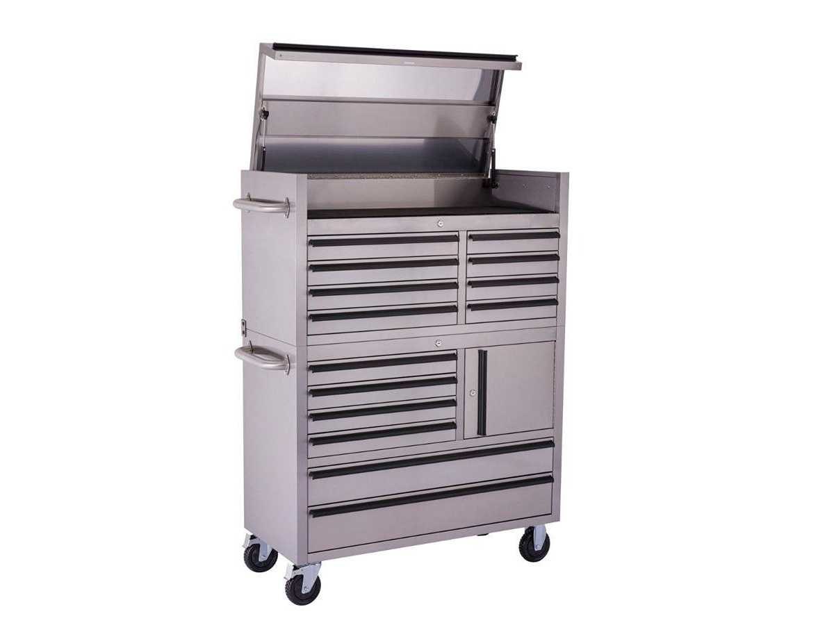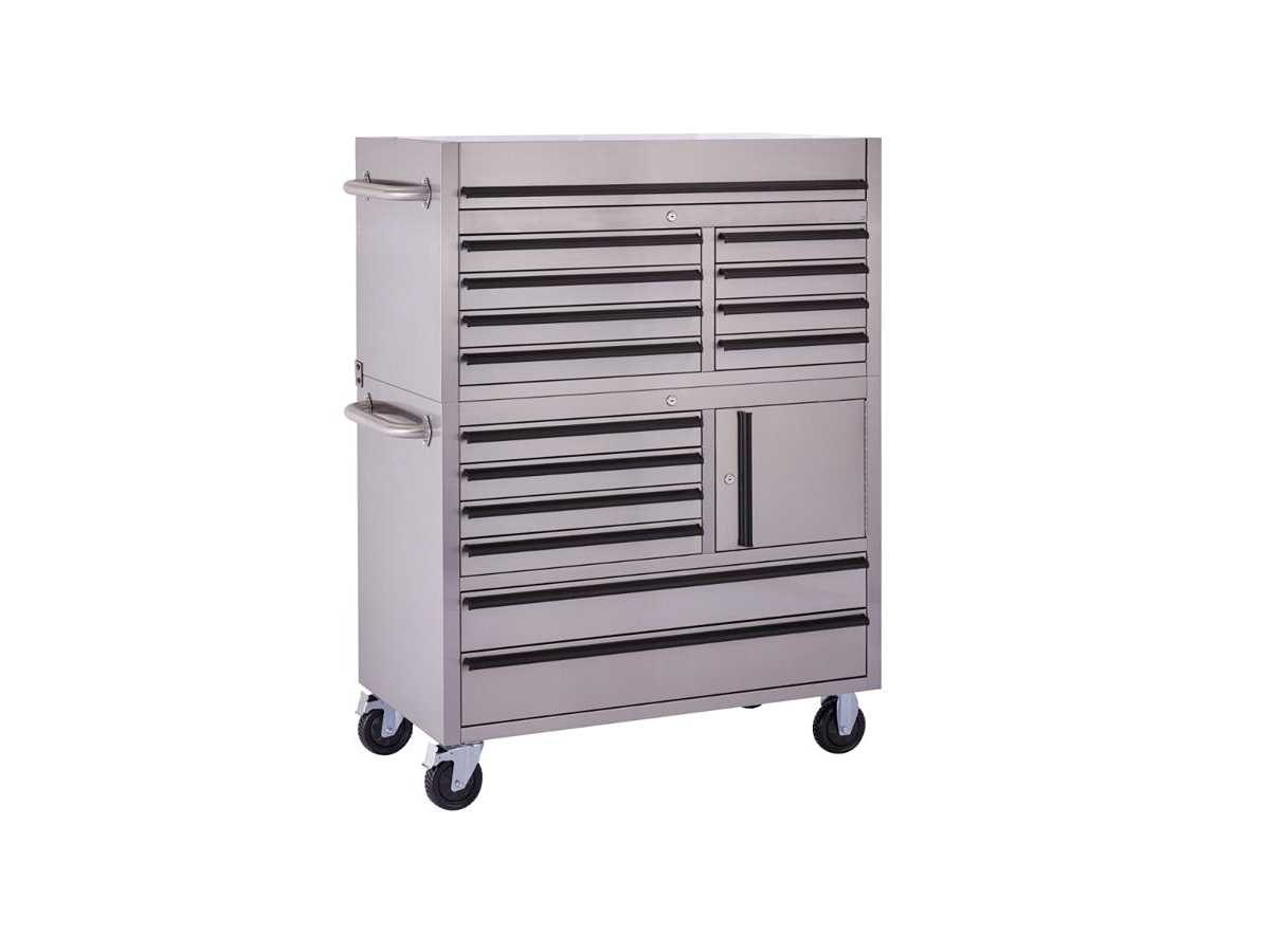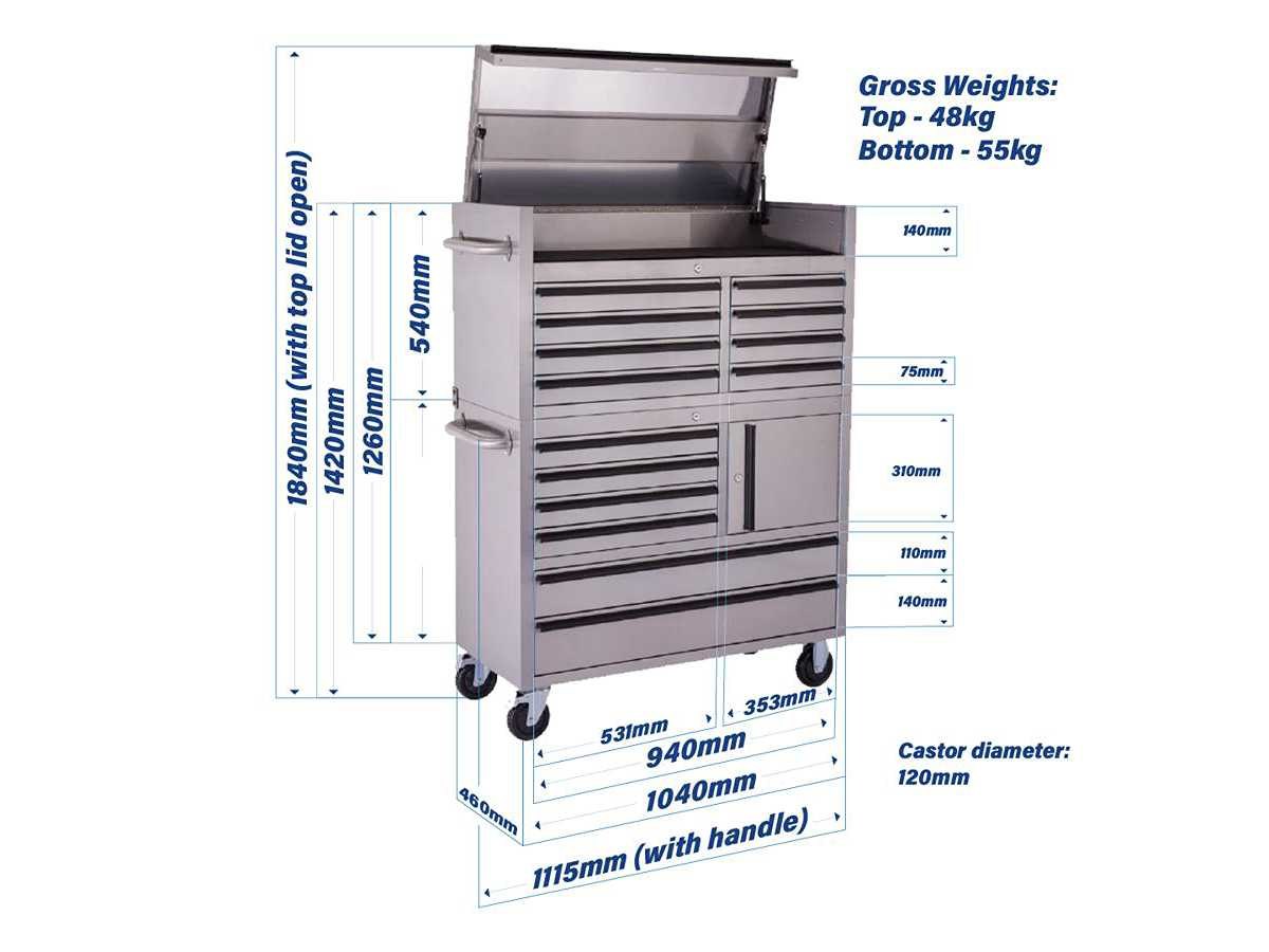 2-delig, breedte 105 cm Materiaal RVS Voorzien van 14 laden, 4 zwenkwielen (2 voorzien van rem), afsluitbaar met sleutel No Merk: Field Type: 4114 Inox Premium Bouwjaar: 2025