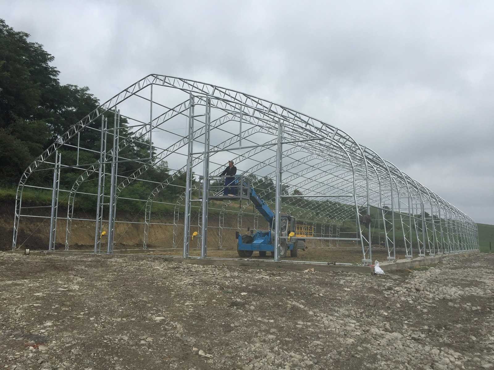Opslagshelter, voorzien van dubbel trussen-/buizensysteem; gegalvaniseerd; ruimte tussen bogen: 3050 mm; afmeting gording: Φ 76x2,0 mm; oprolbare deur met lier, afmeting: 5,49x4,89 meter; materiaal 610 gram PVC; kleur wit; inclusief montage handleiding No Merk: Field Industries Type: 7015028DP Bouwjaar: 2025 Totale afmeting L: 21350mm Totale afmeting Breedte: 45750mm Totale afmeting Hoogte: 8540mm