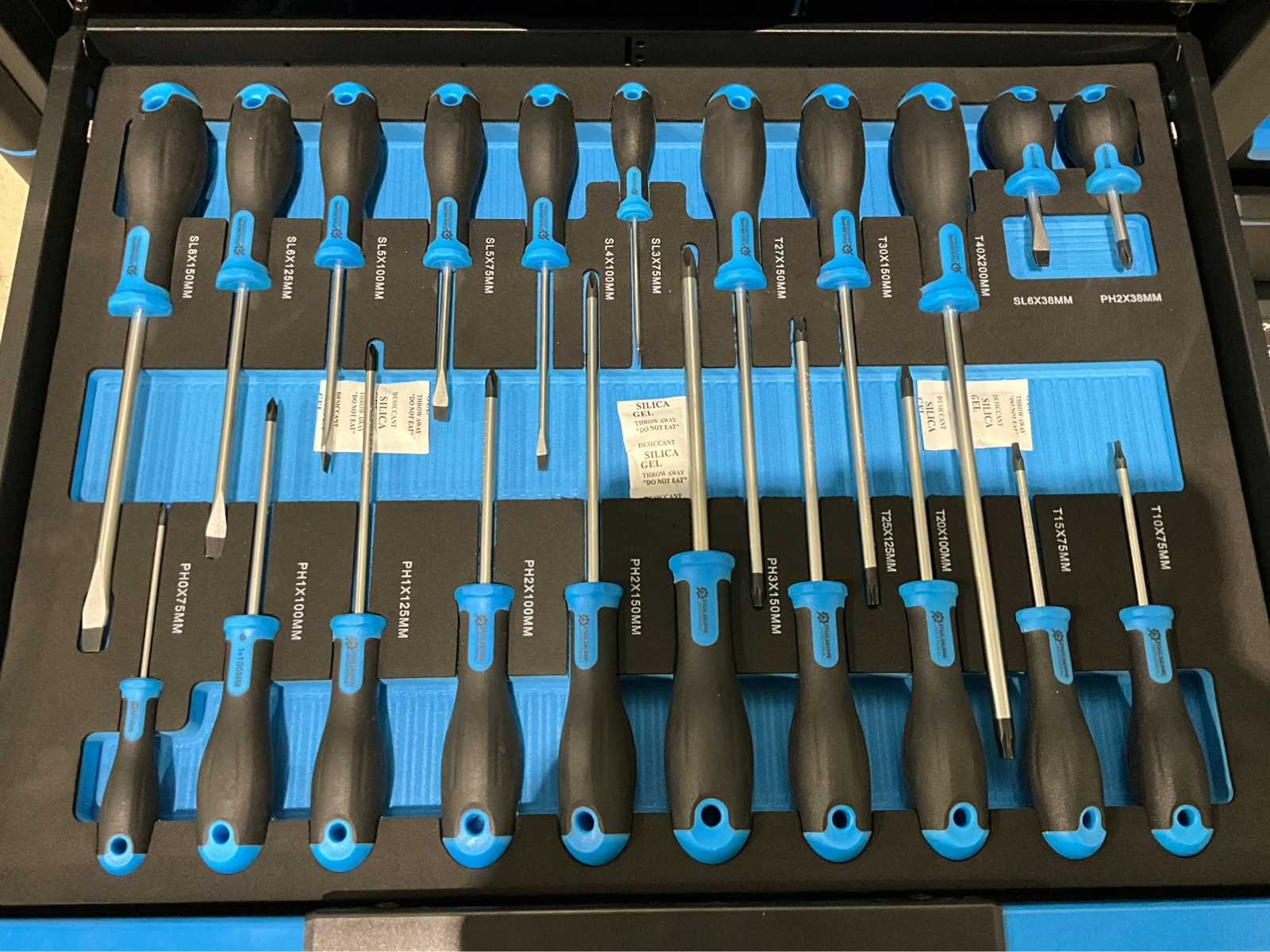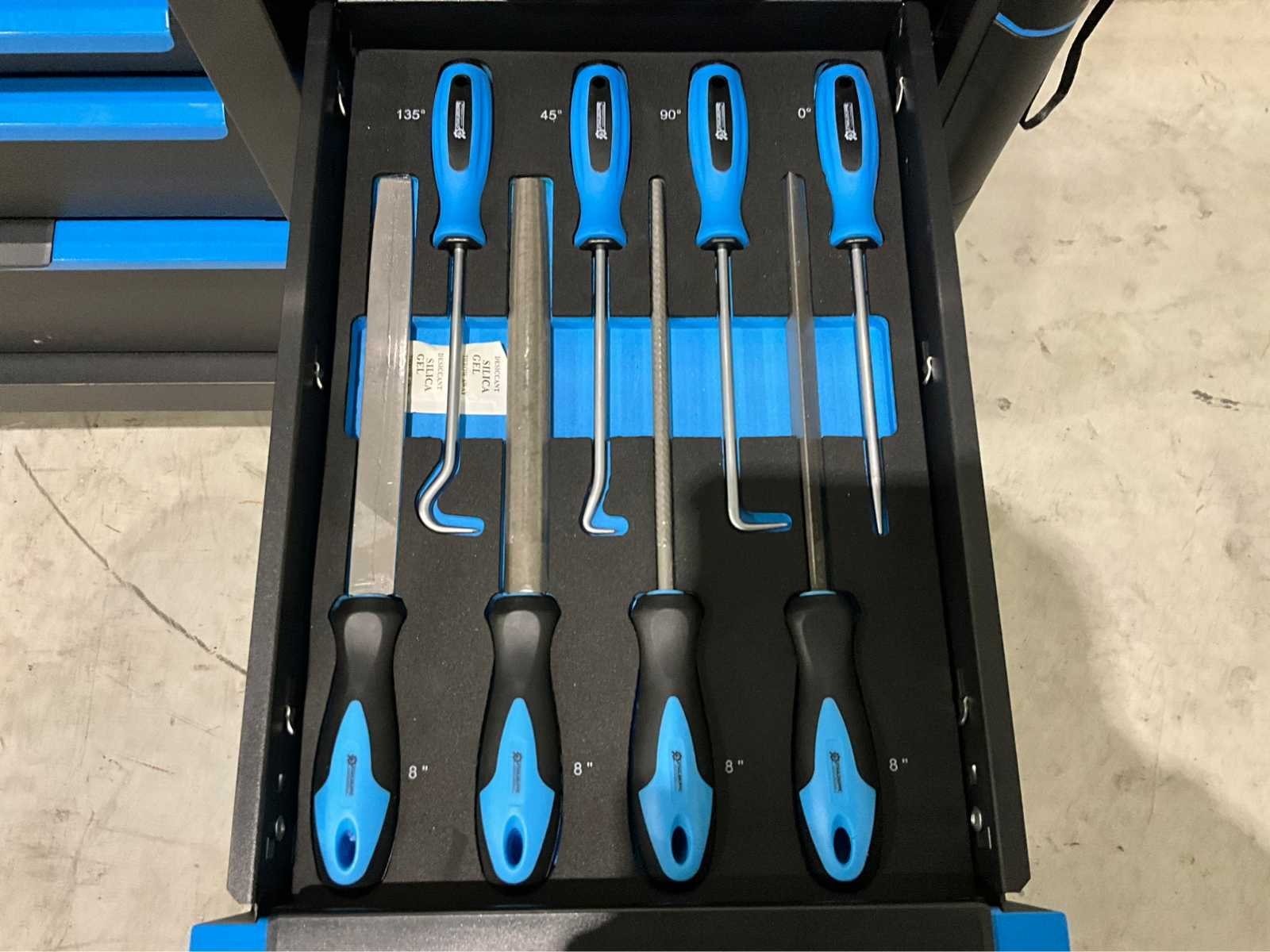 Staat: Ongebruikt, in de originele verpakking Aantal laden: 13 laden Aantal gevulde laden: 10 gevulde laden Gereedschap: Chrome Vanadium gereedschap Inhoud: 2 dopsleutel sets (1/2” & 1/4”) Momentsleutel (40-220 Nm) Impact-doppen (10-22 mm) Ringsteeksleutel set (6-32 mm) Ringratelsleutel set (8-19 mm) Inbussleutel set (1,5-10 mm) Ringsleutel set (6-32 mm) Torx sleutel set (T8-T70) Schroevendraaier set (21 stuks) Tangen set (9 stuks) Beitel en doorslagen set (18 stuks) Vijlen set (5 stuks) T-greep dopsleutel set (7-14 mm) T-greep torx sleutel set (T15-T45) Hamers (3 stuks) VDE gereedschap (3 tangen en 7 schroevendraaiers) Enzovoort... Nee Merk: Stahlgruppe Type: Jumbo Bouwjaar: 2026 Aantal laden: 13 Met inhoud: true Eigen gewicht: 153kg Totale afmeting L: 1150mm Totale afmeting Breedte: 550mm Totale afmeting Hoogte: 1100mm