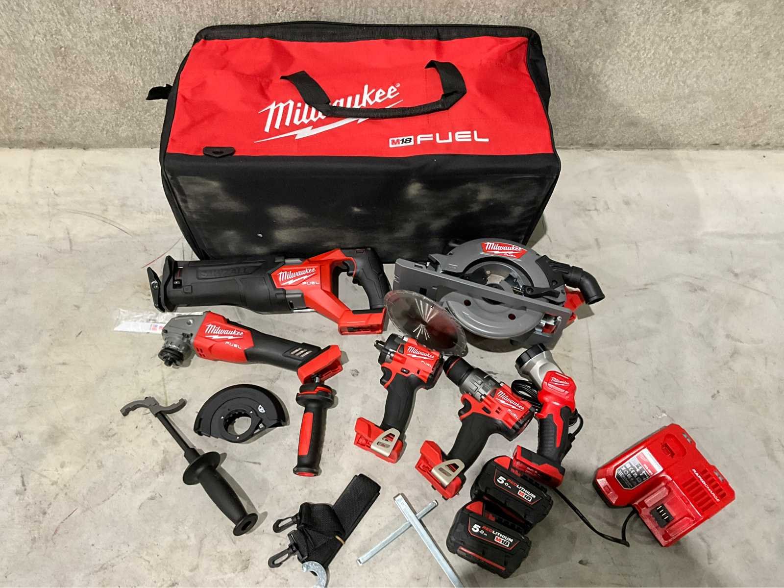 Ongebruikt , M18 boorschroef machine , M18 slagschroevendraaier , M18 cirkelzaagmachine , M18 compactmultitool , M18 reciprozaag , zaklamp ,2 x 5.0AH accu , Milwaukee opberg tas , 2024 Nee Merk: Milwaukee Type: 6 delige accu combiset Bouwjaar: 2026 Kleur: Rood / zwart Accu lader: true Accuspanning: 18V Aantal accu's: 2