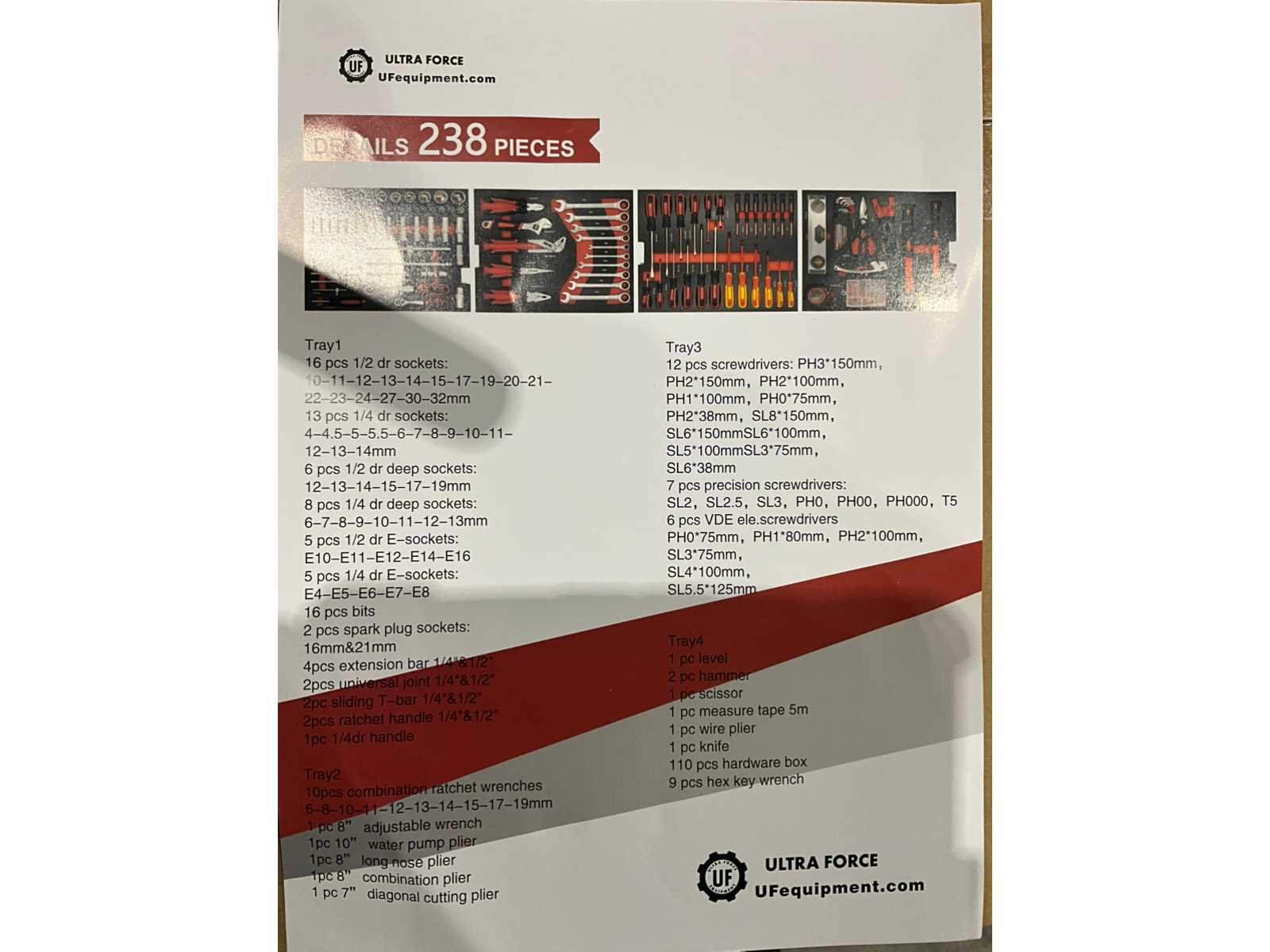 Ongebruikt , 238 delige trolly , inclusief wieltjes , code slot Nee Merk: Ultra Force Equipment Type: 238 stuks Bouwjaar: 2026 Aantal laden: 4 Met inhoud: true Eigen gewicht: 18kg Totale afmeting L: 410mm Totale afmeting Breedte: 30mm Totale afmeting Hoogte: 565mm