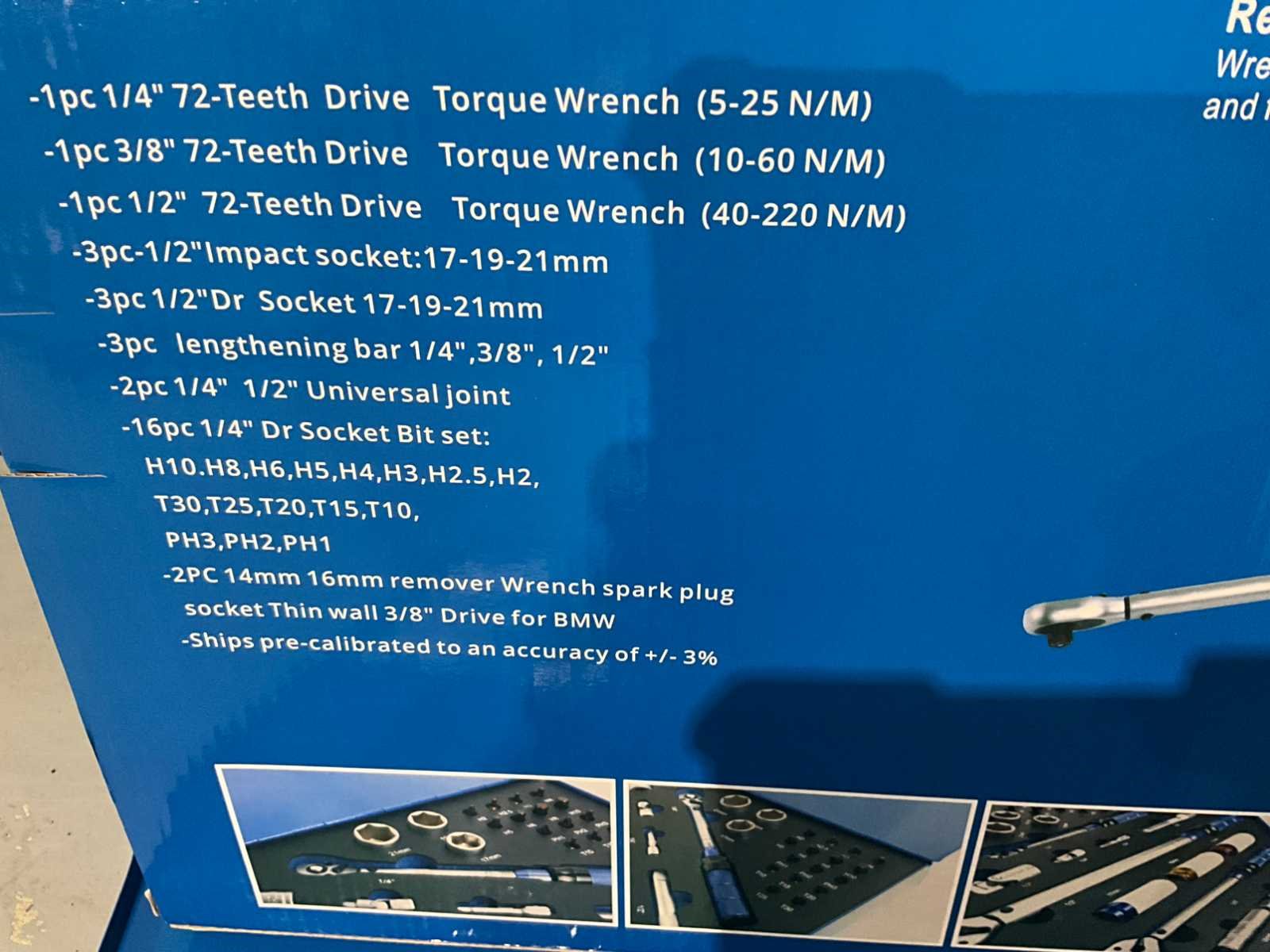 Ongebruikt 1x 1/4" momentsleutel met 72-tands aandrijving (bereik: 5-25 N/M) 1x 3/8" momentsleutel met 72-tands aandrijving (bereik: 10-60 N/M) 1x 1/2" momentsleutel met 72-tands aandrijving (bereik: 40-220 N/M) 3x Impactdoppen (1/2"): 17mm, 19mm, 21mm 3x Dopsleutels (1/2"): 17mm, 19mm, 21mm 3x Verlengstukken: 1/4" x 3", 3/8" x 3", 1/2" x 5" 2x Universele koppelingen (1/4" & 1/2") 16x Bitdoppen (1/4"): PH1, PH2, PH3, T10, T15, T20, T25, T30, H2, H2.5, H3, H4, H5, H6, H8, H10 2x Bougiesleutels (14mm, 16mm) met dunne wand, 3/8" aandrijving voor BMW Nee Merk: Stahlgruppe Type: 32PC Bouwjaar: 2026 Lengte: 45 Breedte: 33 Hoogte: 5