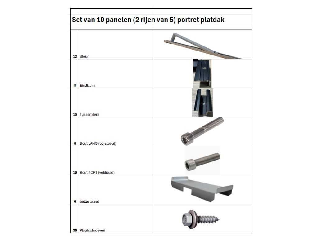 Montageset platdak voor 10 panelen (2 rijen van 5) Bestaande uit: Steunen, Eindklemmen, Tussenklemmen, Bouten, Ballasthouders en plaatschroeven (zie foto's). De benodigde hoeveelheid ballast dient u zelf te bepalen / berekenen, deze is niet inbegrepen. No Merk: Allimex Eigen gewicht: 1kg