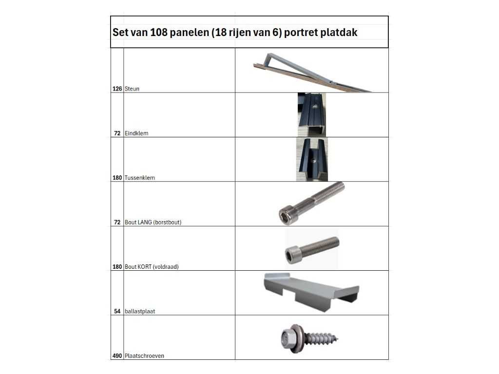 Montageset platdak voor 108 panelen (18 rijen van 6) Bestaande uit: Steunen, Eindklemmen, Tussenklemmen, Bouten, Ballasthouders en plaatschroeven (zie foto's). De benodigde hoeveelheid ballast dient u zelf te bepalen / berekenen, deze is niet inbegrepen. No Merk: Allimex Eigen gewicht: 1kg