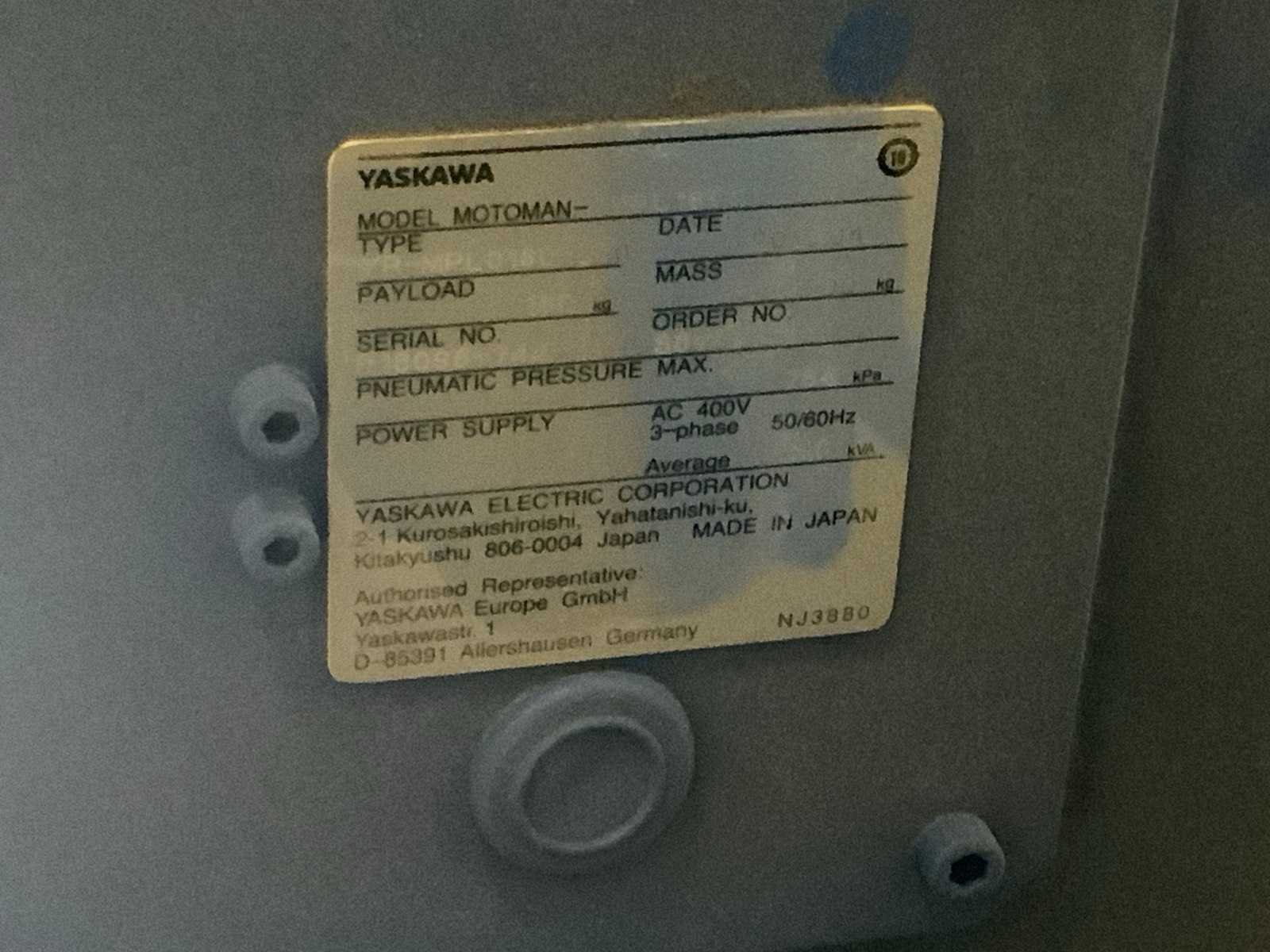 Reikwijdte: 3159mm, draaglast max. 160 kg. inclusief: 1 besturingskast, type: DX200 (2018), bedieningskast, type: JZRCR-YPP21 en bekabeling, 400 volt Nee Merk: Yaskawa Model: Motoman- MPL 160 B Type product: YR-MPL 0160 D Bouwjaar: 2018 Kleur: blauw Gewicht: 17000g Lengte: 2500cm Breedte: 1200cm Hoogte: 2400cm