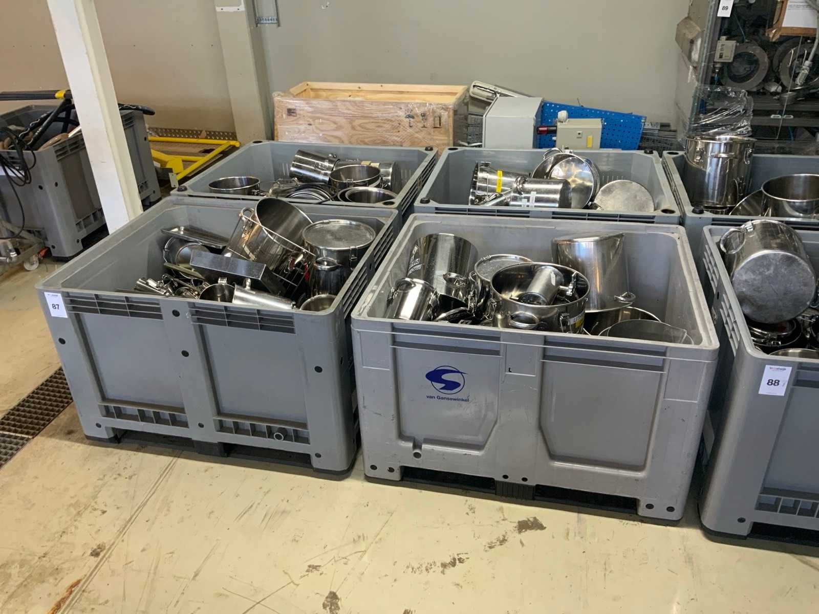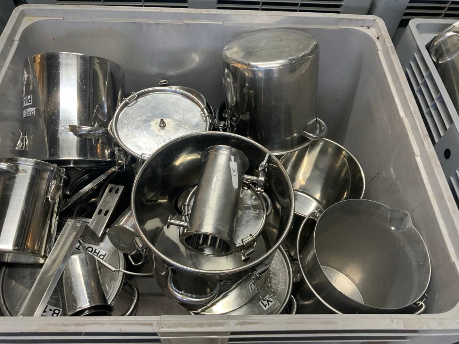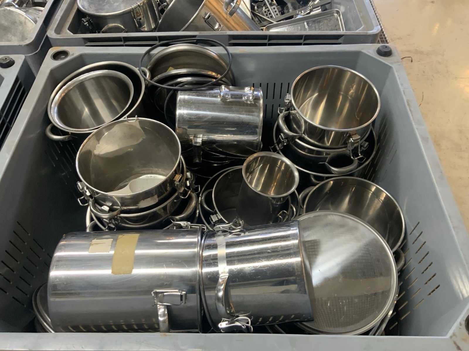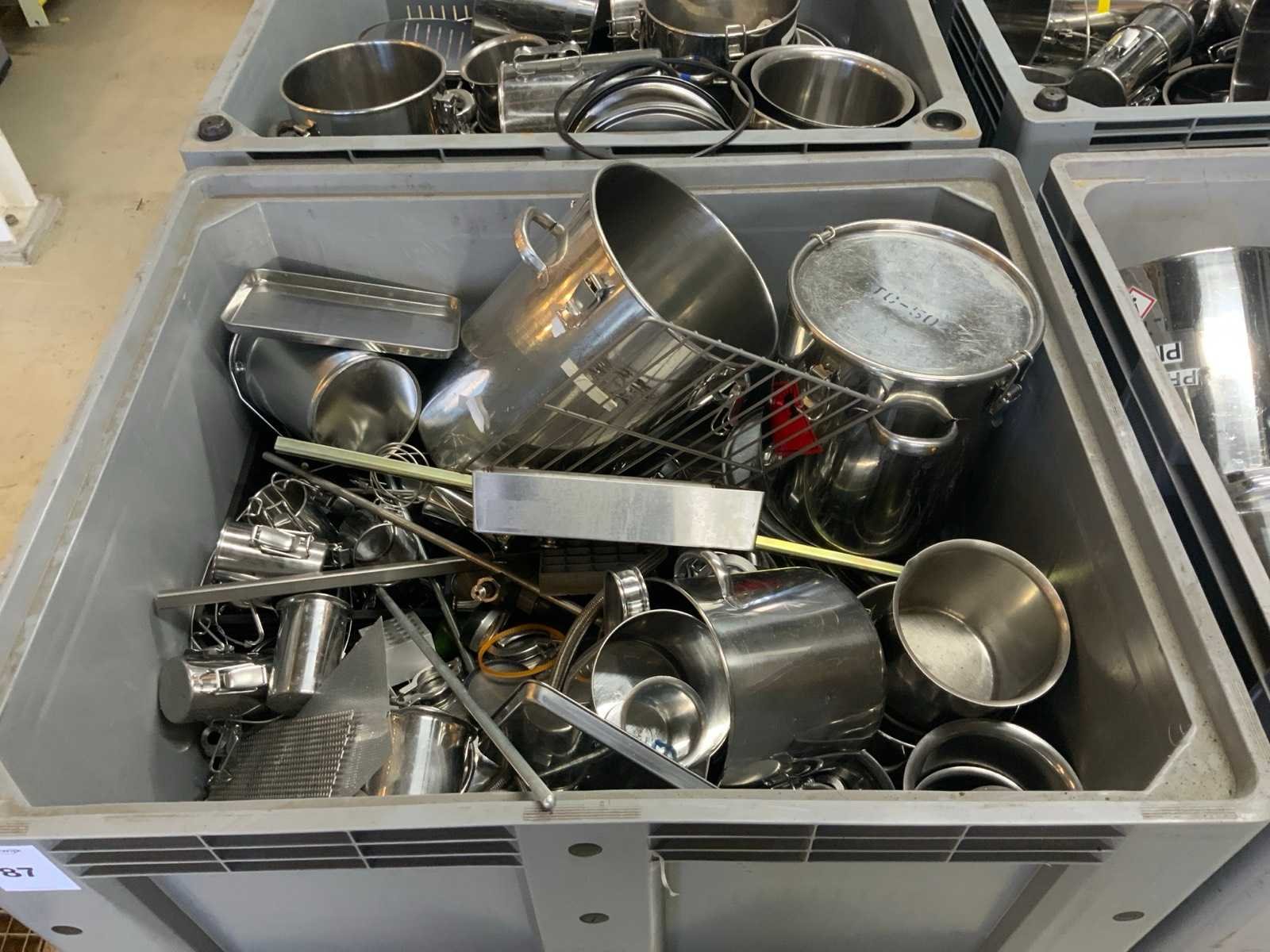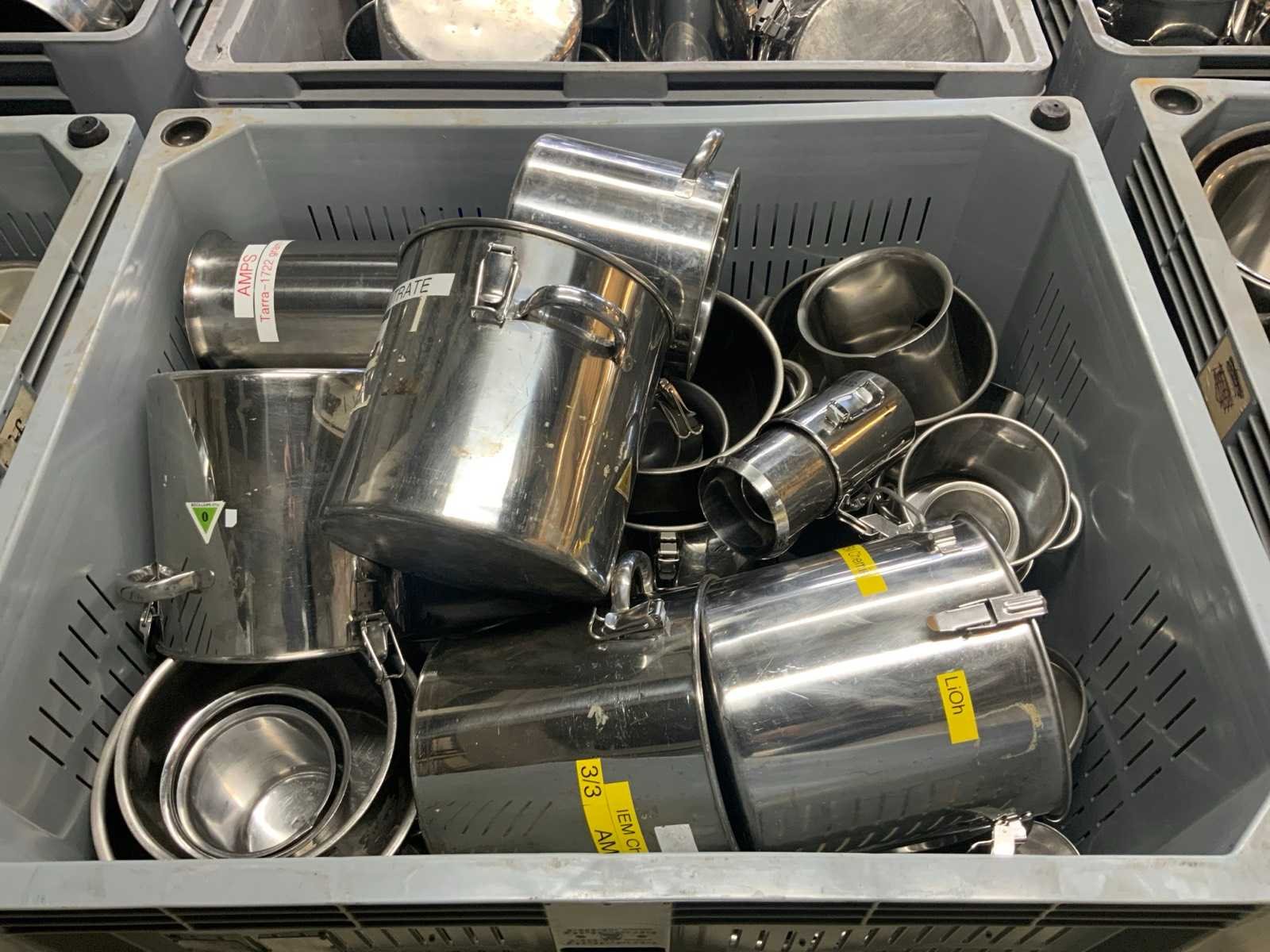 Bak met rvs pannen en divers (4x)