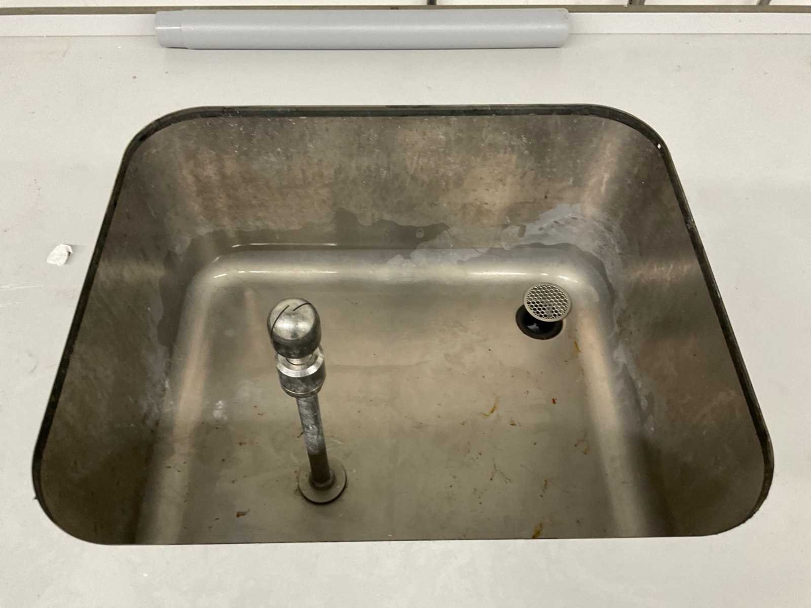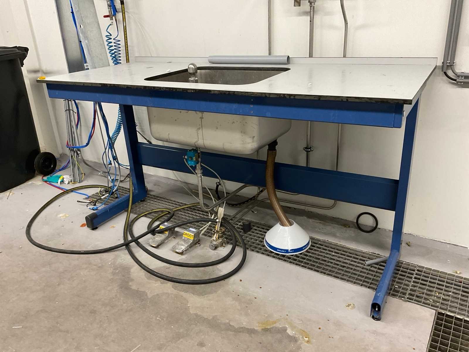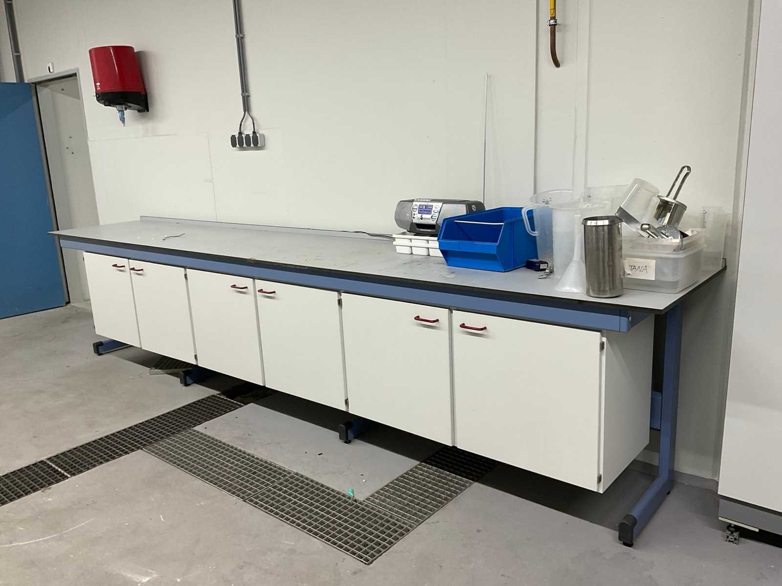 Ruimte bestaande uit onder andere: werktafel met kasten 420x75x94 cm, handdoek dispenser, werkkast 120x40x205 cm bevestigd aan de muur, spoelbak 180x75x94 cm, zonder kranen, handdoek dispenser, items op tafel, kastje 52x55x72 cm. Nee