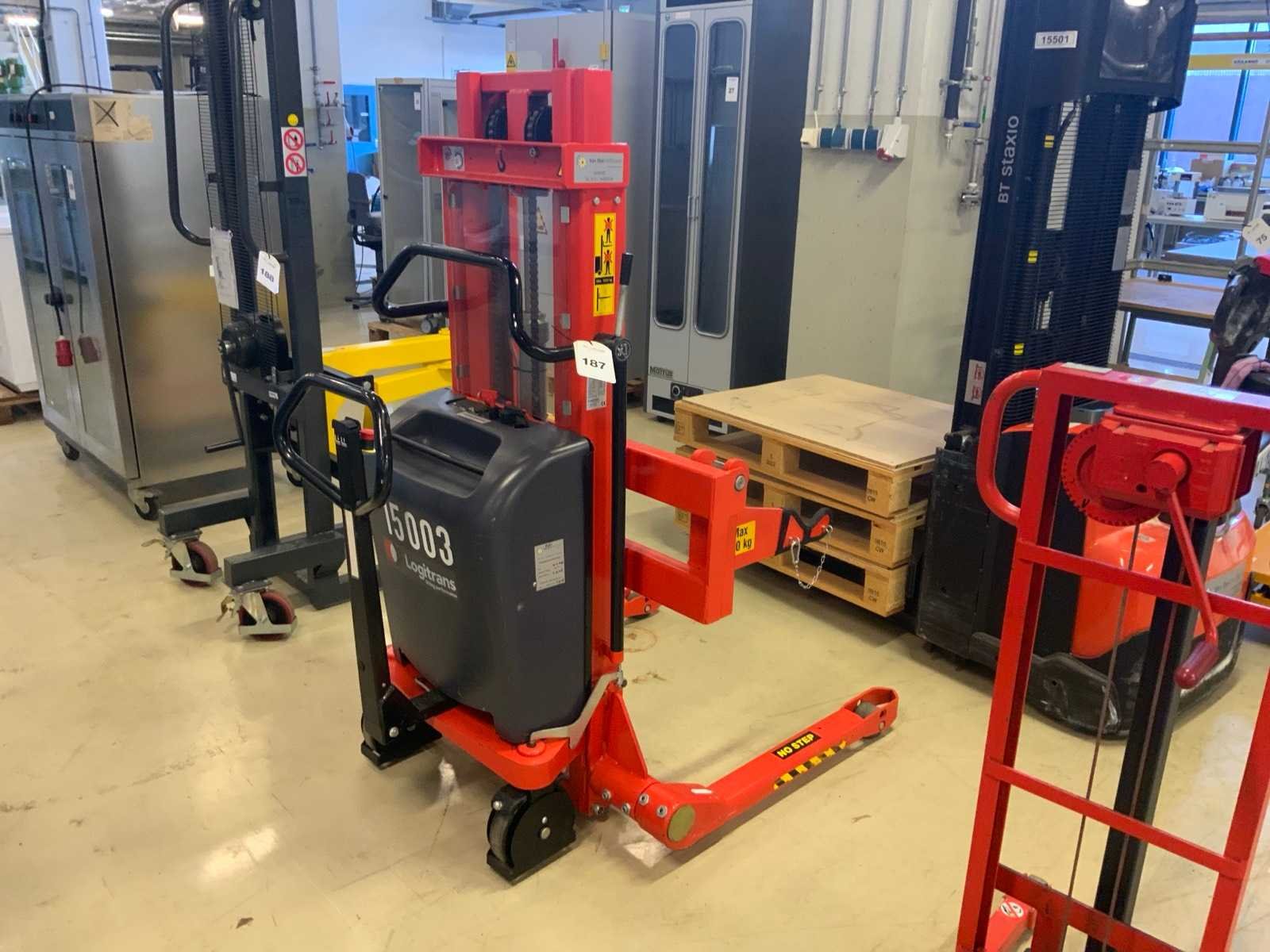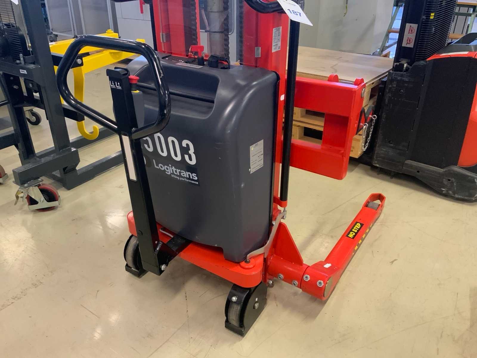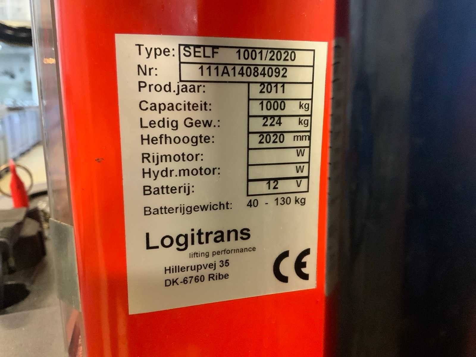Voorzien van rollen hefsysteem, capaciteit max. 350 kg, voorzien van geïntegreerde acculader, aansluit spanning: 230 volt Nee Merk: Logitrans Type: Self 1001/2020 Bouwjaar: 2011 Hefvermogen: 1000kg Hefhoogte: 2020mm Totale afmeting L: 1450mm Totale afmeting Breedte: 1050mm Totale afmeting Hoogte: 1680mm