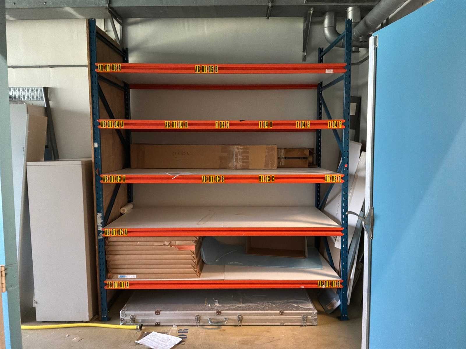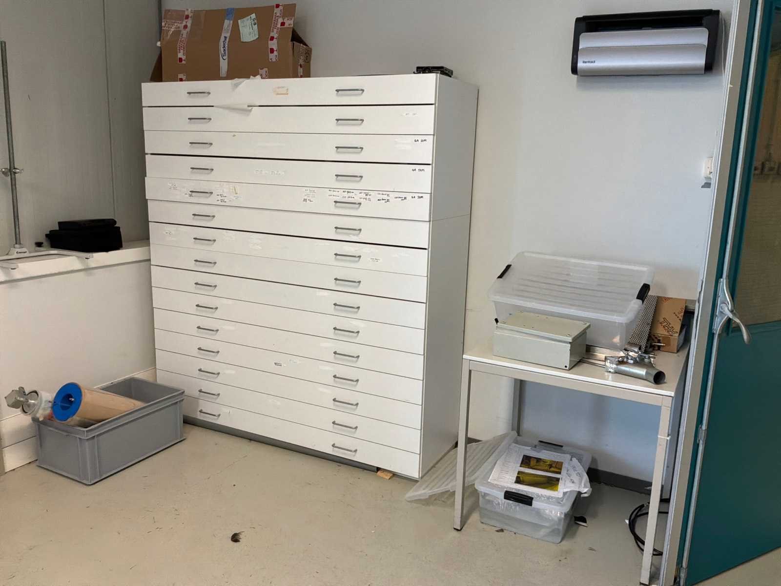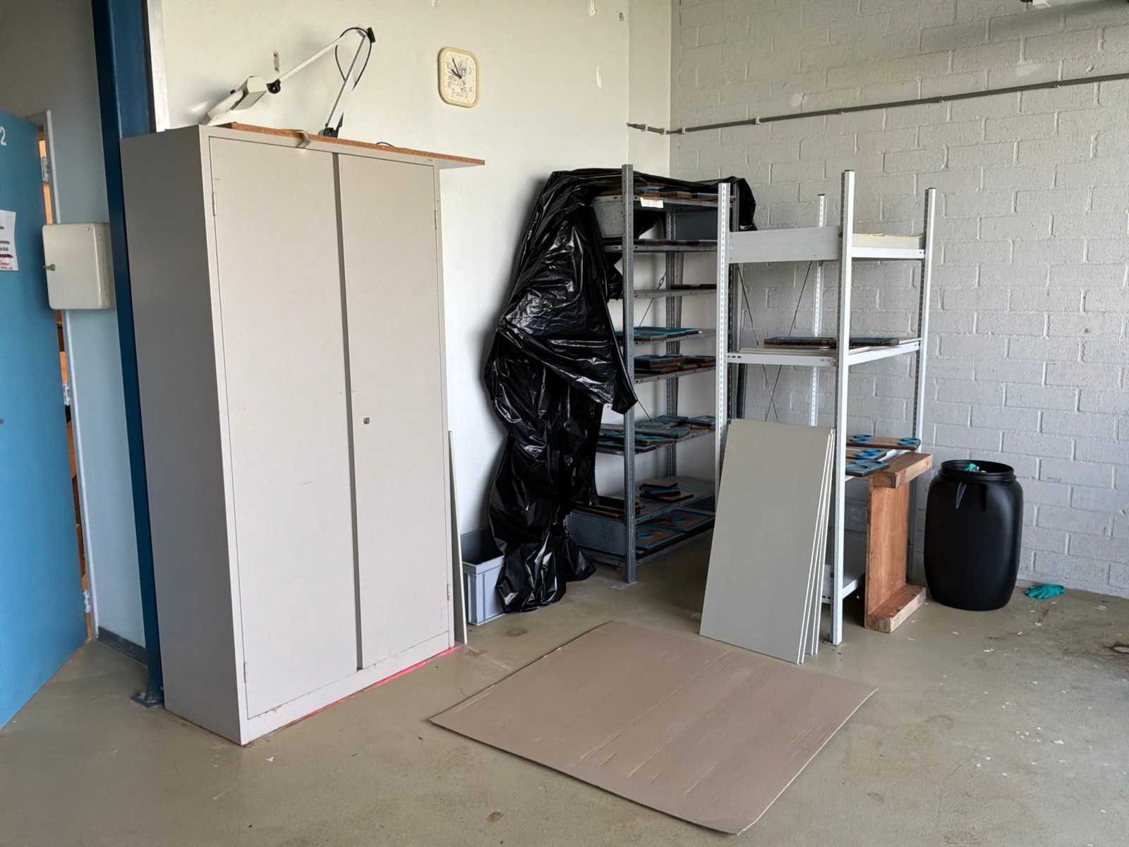 6x legbordstelling, 2 archiefkasten, 1 medicijnenkast, verschillende werkplaatswagens en bureautafels. Nee