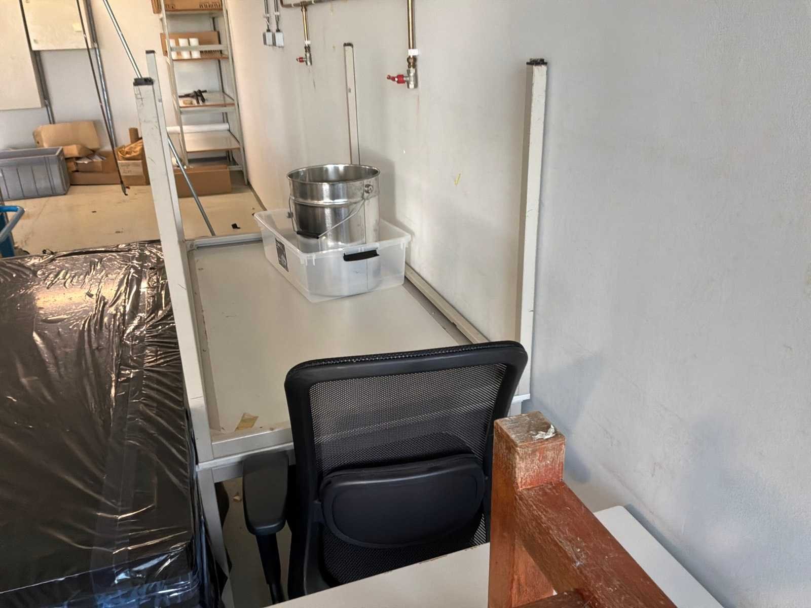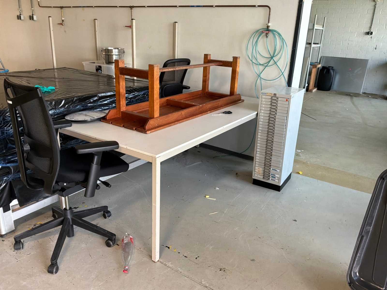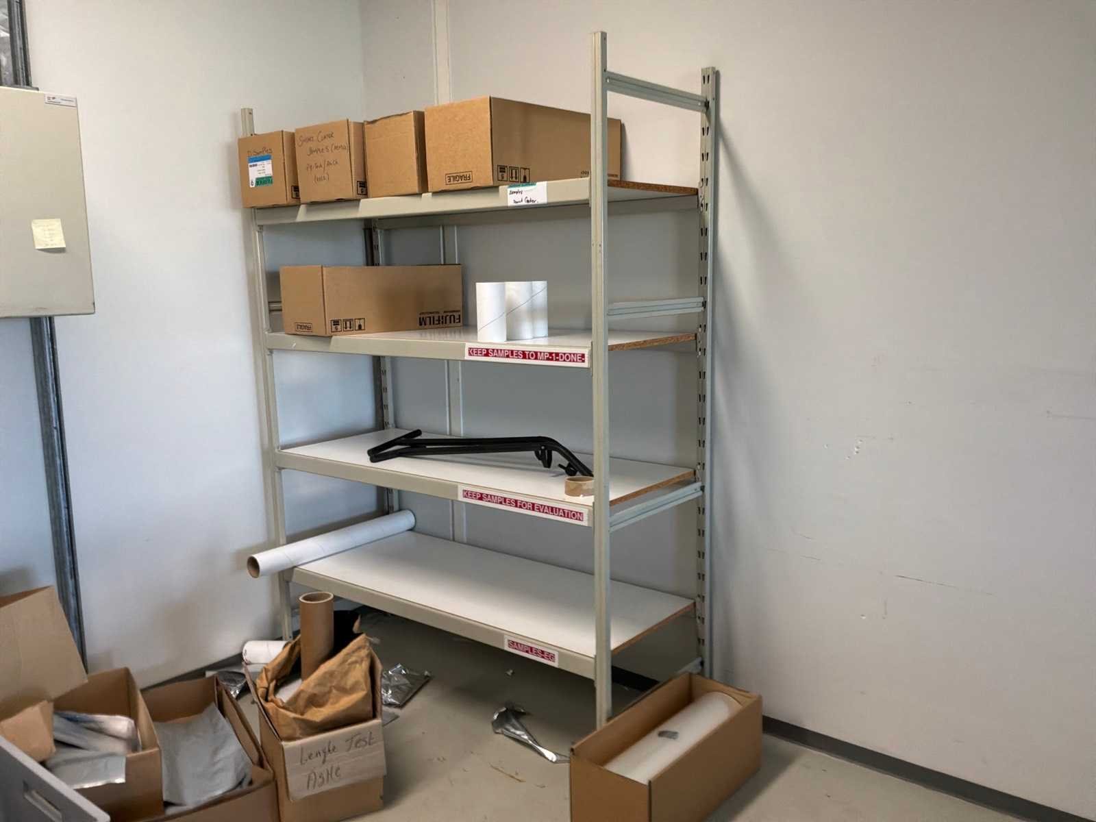 6x legbordstelling, 2 archiefkasten, 1 medicijnenkast, verschillende werkplaatswagens en bureautafels. Nee