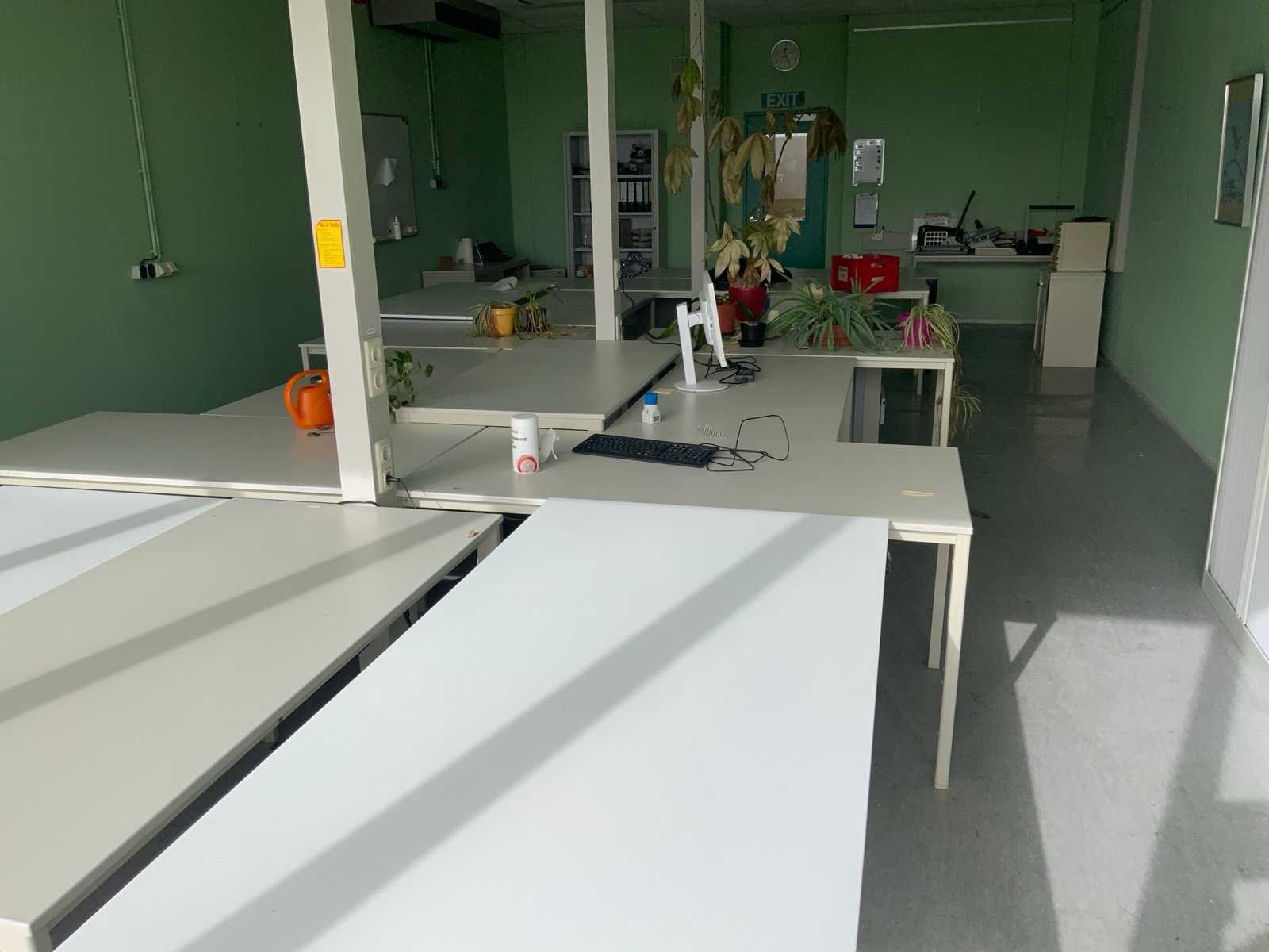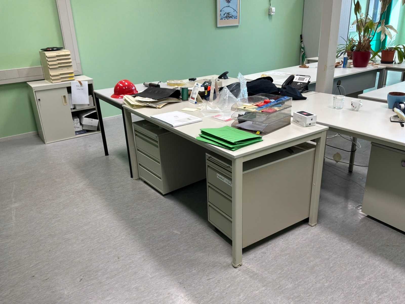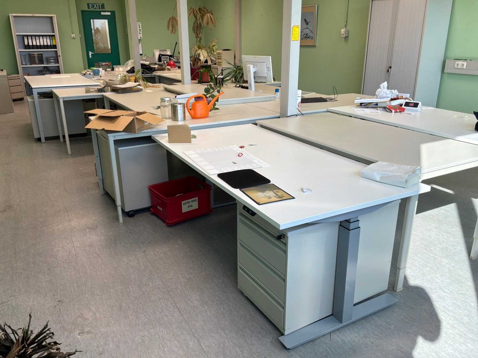14x bureau’s, 3x archiefkast inclusief 5x onderkast, 1x bloembak met plant. Alle inhoud en spullen op tafels niet inbegrepen. Excl. elektrisch equipment zoals monitoren en exclusief in hoogte verstelbare bureau's. No