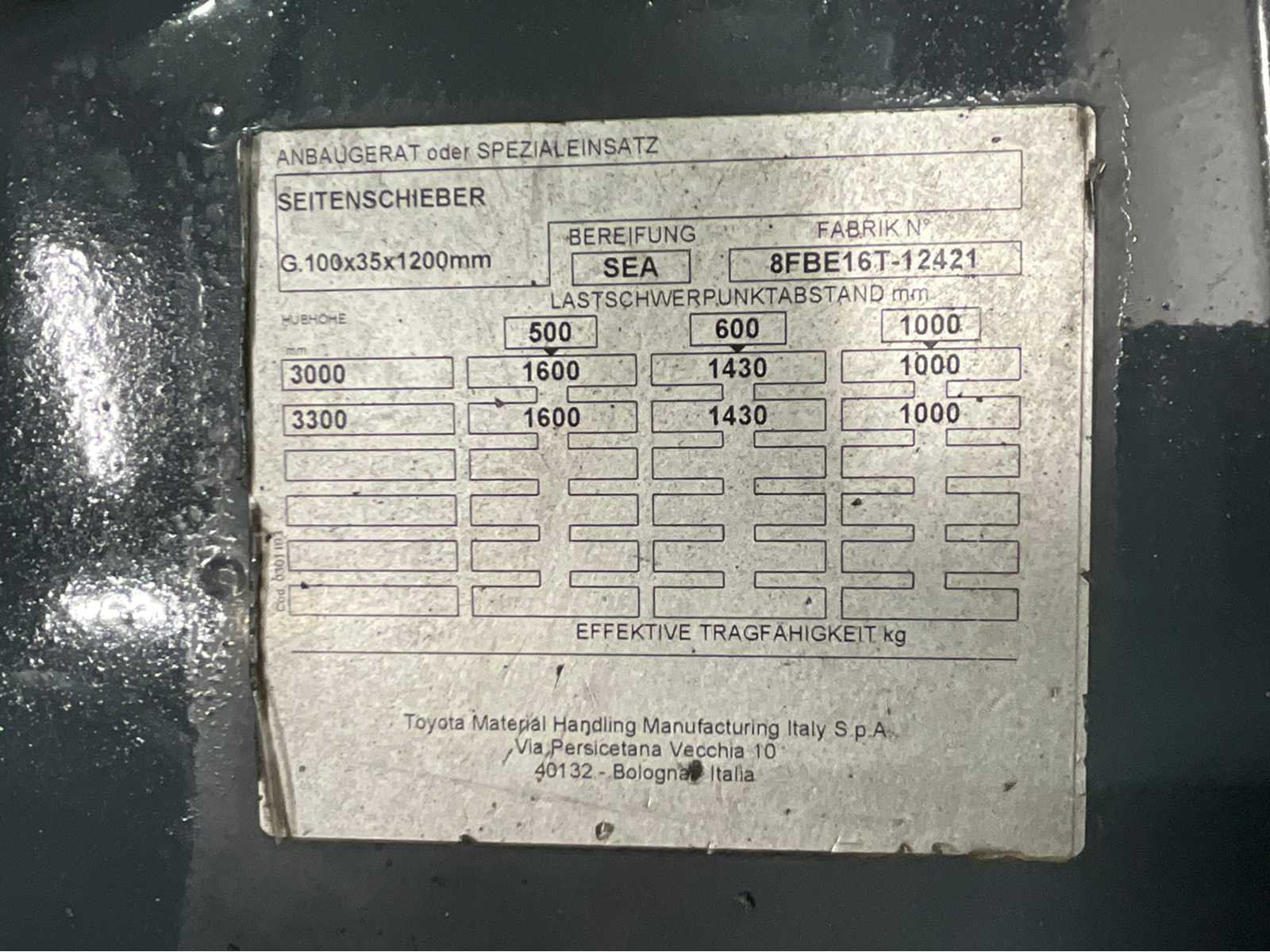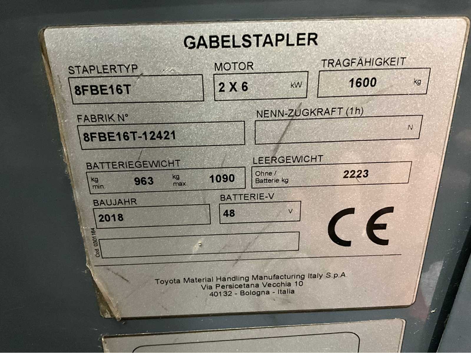 4e functie - accu met automatisch vulsysteem - keyless start - neighoekmeter - snelheidsmeter- stuurhoekmeter -transparant kunststof dak - non marking banden Nee Merk: Toyota Type: 8FBE16T Bouwjaar: 2018 Serienummer: 12421 Brandstof: elektrisch Mast: duplex Soort band: Volrubber banden Aantal wielen: 4 Free-lift: true Side-shift: true Duplex mast: true Eigen gewicht: 3313kg Hefvermogen: 1600kg Lepellengte: 1200mm Max. hefhoogte: 3350mm Hefhoogte: 3350mm Vol rubber banden: true Minimale doorrijhoogte: 2150mm Totale afmeting Breedte: 1200mm Totale afmeting Hoogte: 2150mm