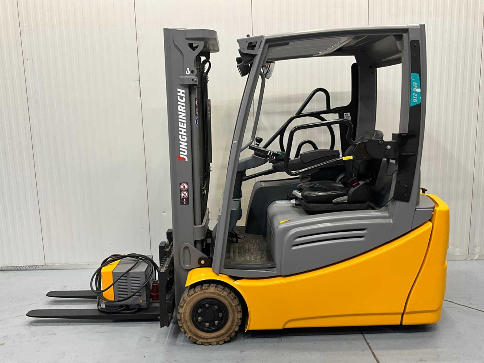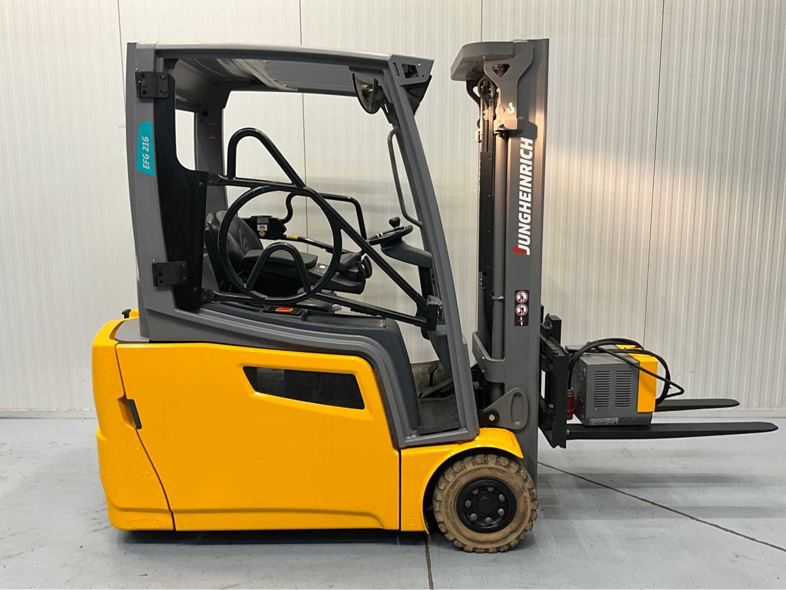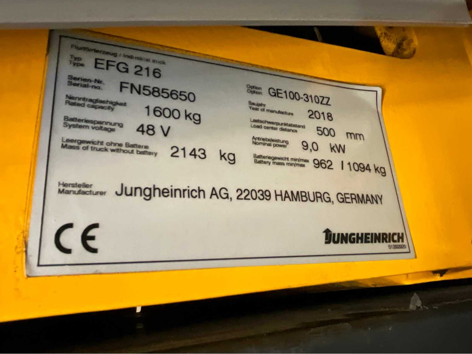Beveiligingssysteem bestuurder, accu van 2021 met automatisch vulsysteem en vergrootte capaciteit. Nee Merk: Jungheinrich Type: EFG216 Bouwjaar: 2018 Serienummer: FN585650 Brandstof: Elektrisch Soort band: Nonmarking banden Aantal wielen: 3 Afgelezen urenstand: 4483 Accu lader: true Free-lift: true Side-shift: true Duplex mast: true Eigen gewicht: 3237kg Hefvermogen: 1600kg Lepellengte: 1200mm Max. hefhoogte: 3300mm Hefhoogte: 3300mm Minimale doorrijhoogte: 2150mm Totale afmeting L: 3200mm Totale afmeting Breedte: 1120mm