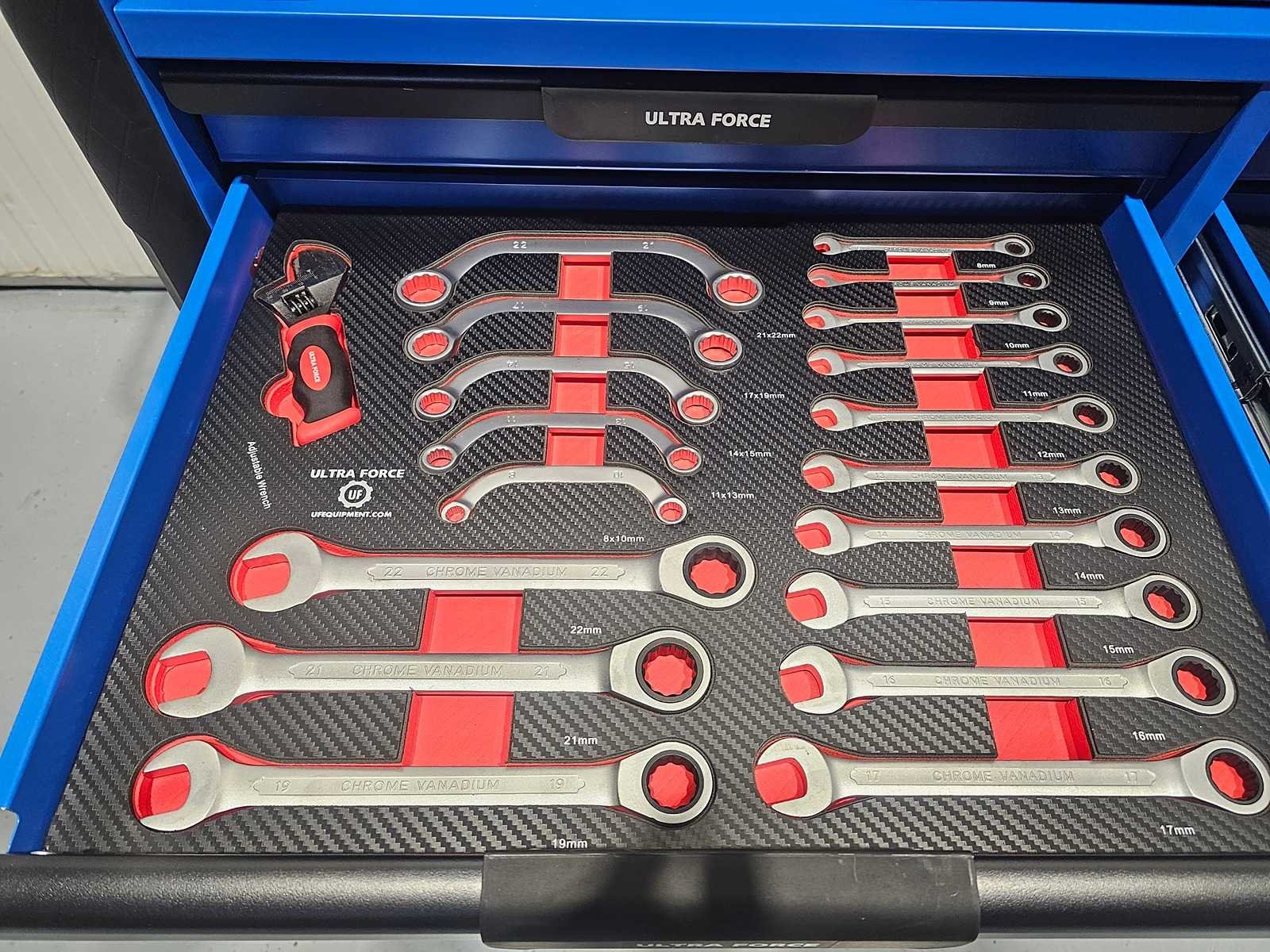 Professionele gereedschapswagen 12 laden, 293 pcs EN een 4 delige accu gereedschap set. Gereedschapswagen 12 laden waarvan 11 gevuld met 293 pcs gereedschap Heavy equipment. 600 kg laadvermogen. Softclose-mechanisme. 2 zwenkwielen en 4 sleutels. En een 4 delige accu gereedschap set: schroefmachine - slagmoersleutel - boormachine en slijper. Inclusief 2 accu's, oplader en diverse accessoires in koffer. Cordless power tools set Nee Merk: Ultra Force Equipment Type: Jumbo Gewicht: 132kg Lengte: 112cm Breedte: 50cm Hoogte: 103cm