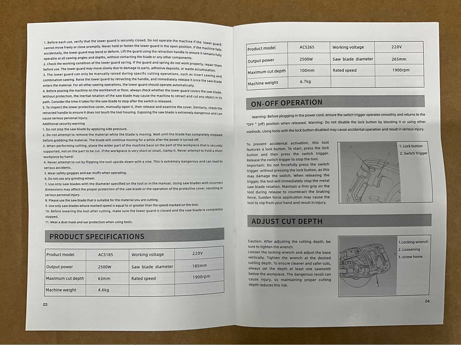 Power 2500w Blade Dia 185 mm Voltagen AC220v Max Cutting size 63mm Constant rpm 1900rpm Nee Merk: Ultra Force Equipment Type: AC5185 Bouwjaar: 2026 Diameter zaagblad: 185mm Eigen gewicht: 5kg