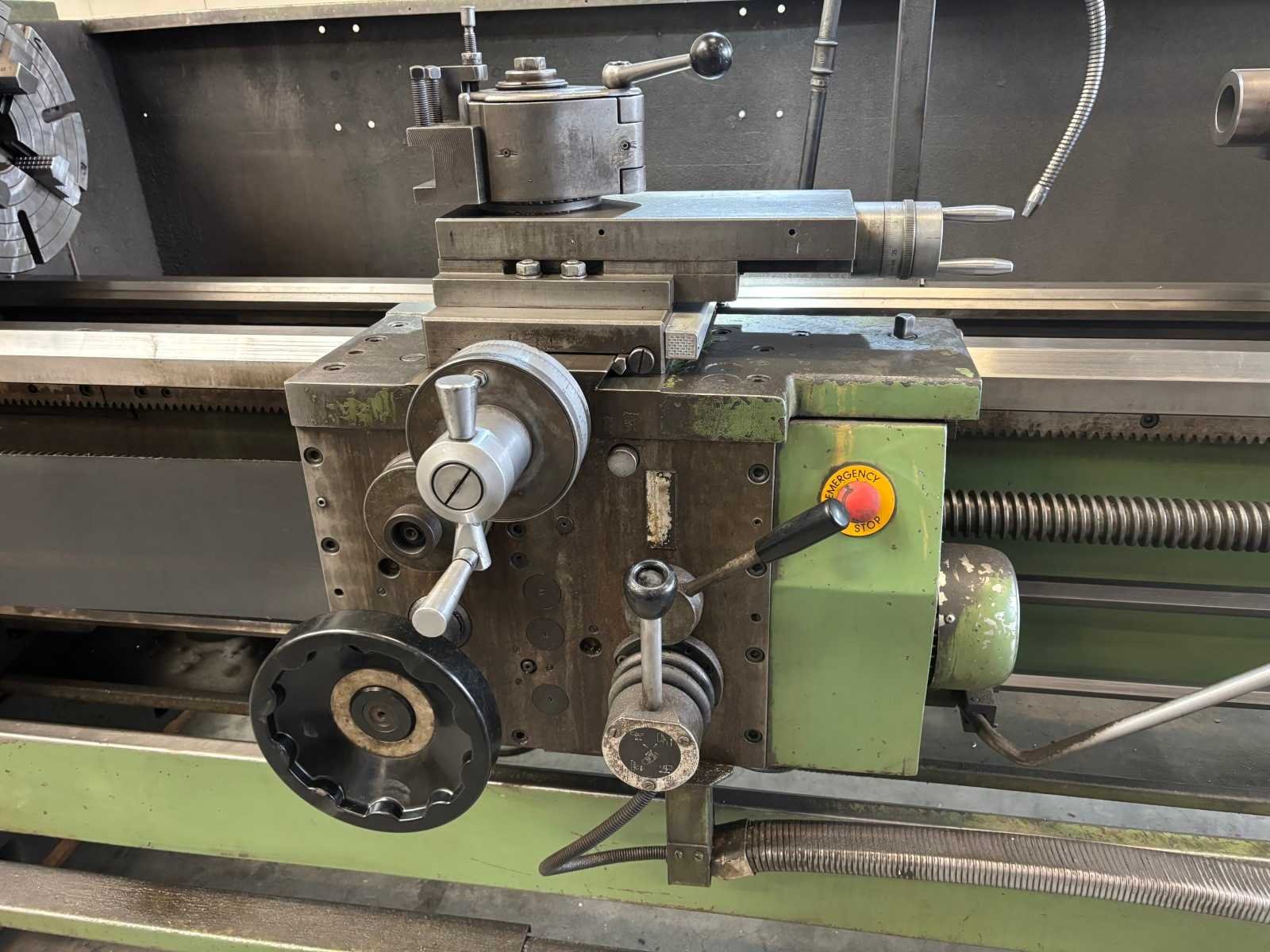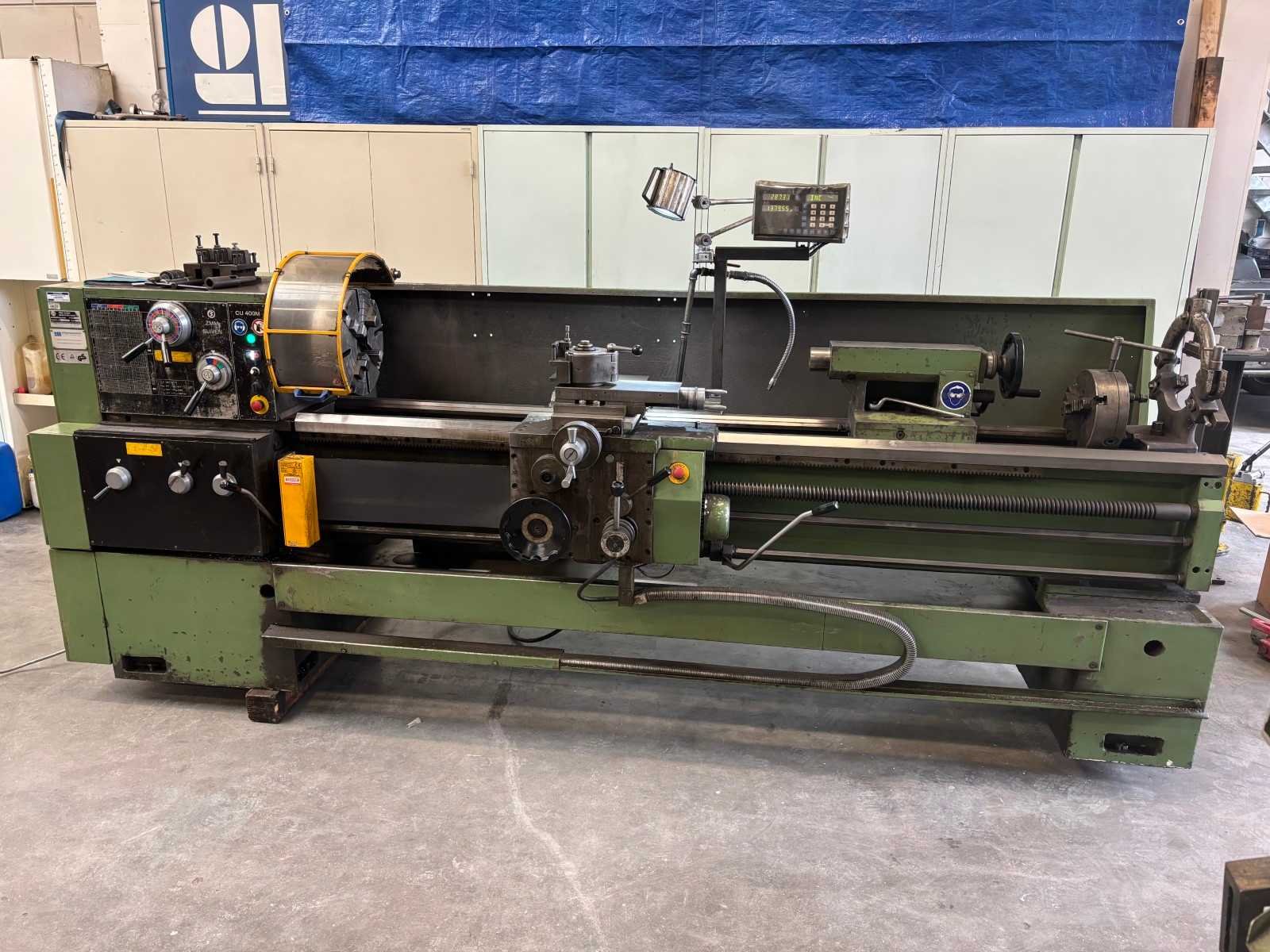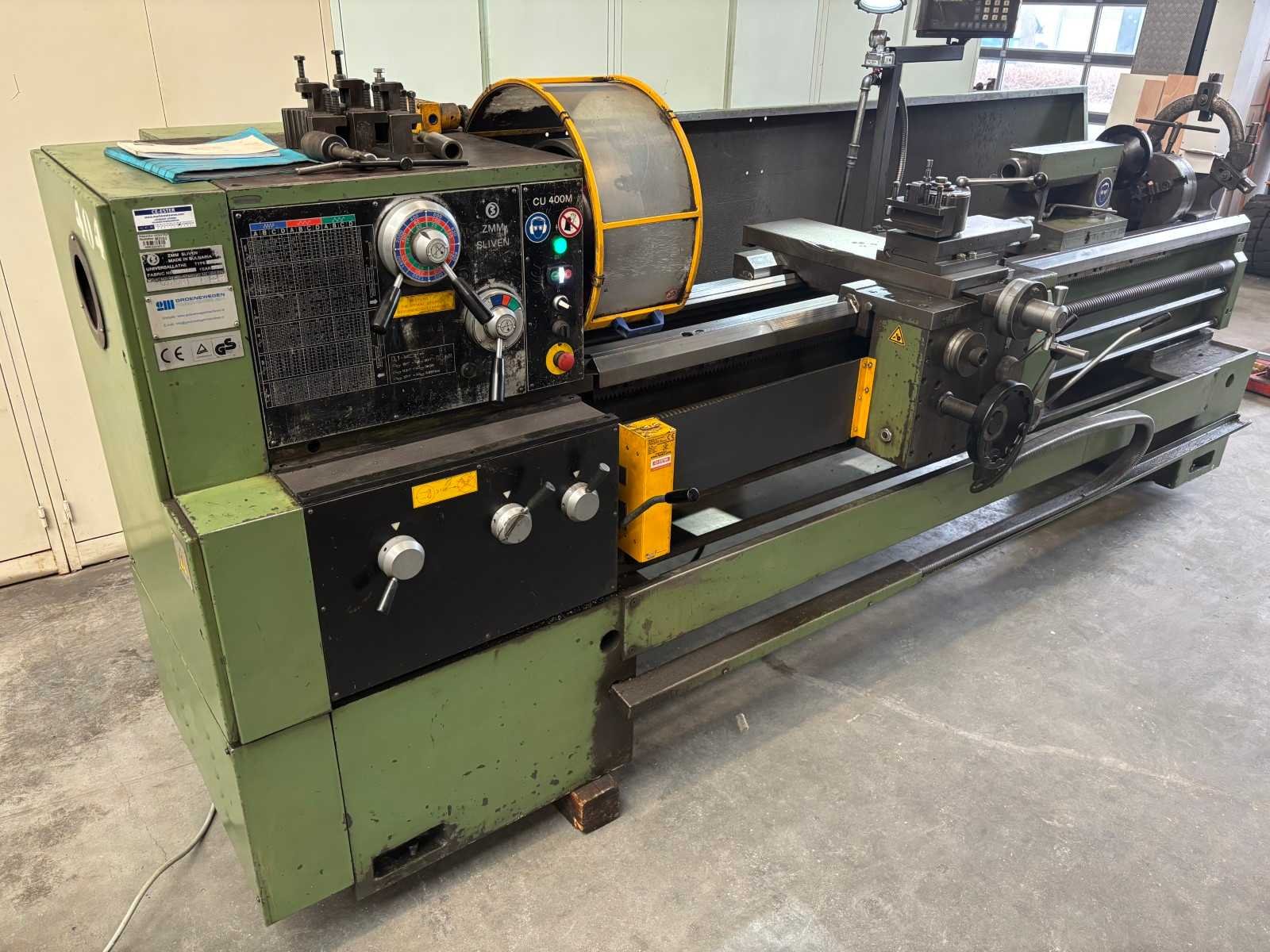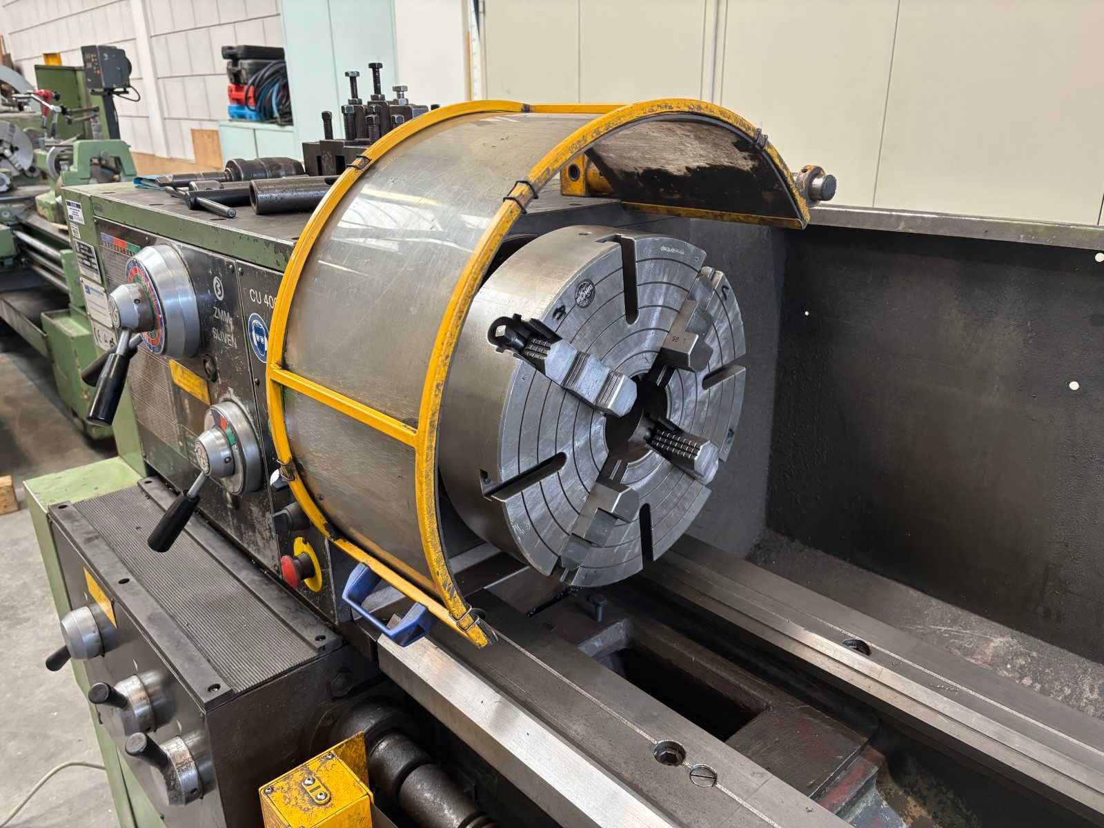 Machine getest op werking Compleet met snelwisselhouder met 4 houders, vaste bril, 3-klauwplaat 300 mm, 3-klauwplaat 250 mm Nee Merk: ZMM Type: CU400 Draailengte: 2000mm Draai: 440mm Holle spil Ø: 80mm Aantal snelheden: 24 Snelheid van n =: 20rpm Snelheid tot n =: 2000rpm Koelmiddelpomp: true Machinegewicht: 2800kg Afmeting l: 3450mm Afmeting b: 1250mm Afmeting h: 1400mm