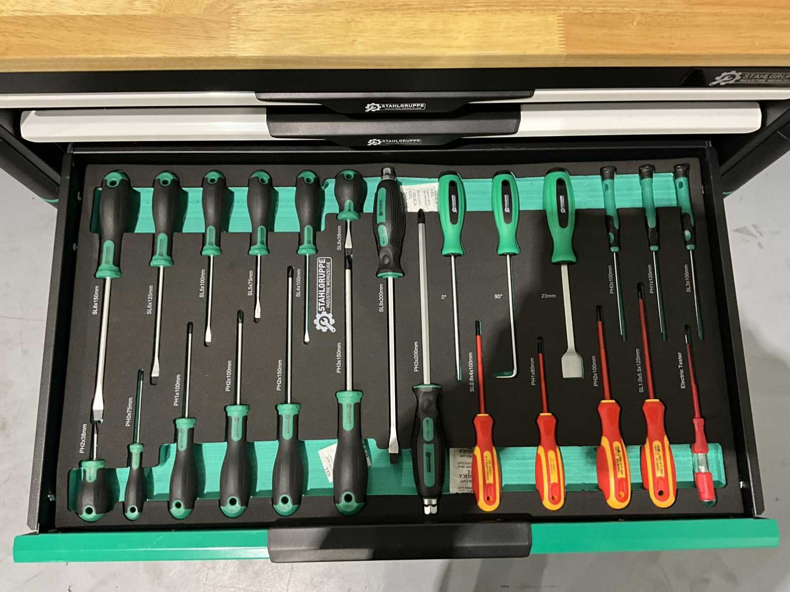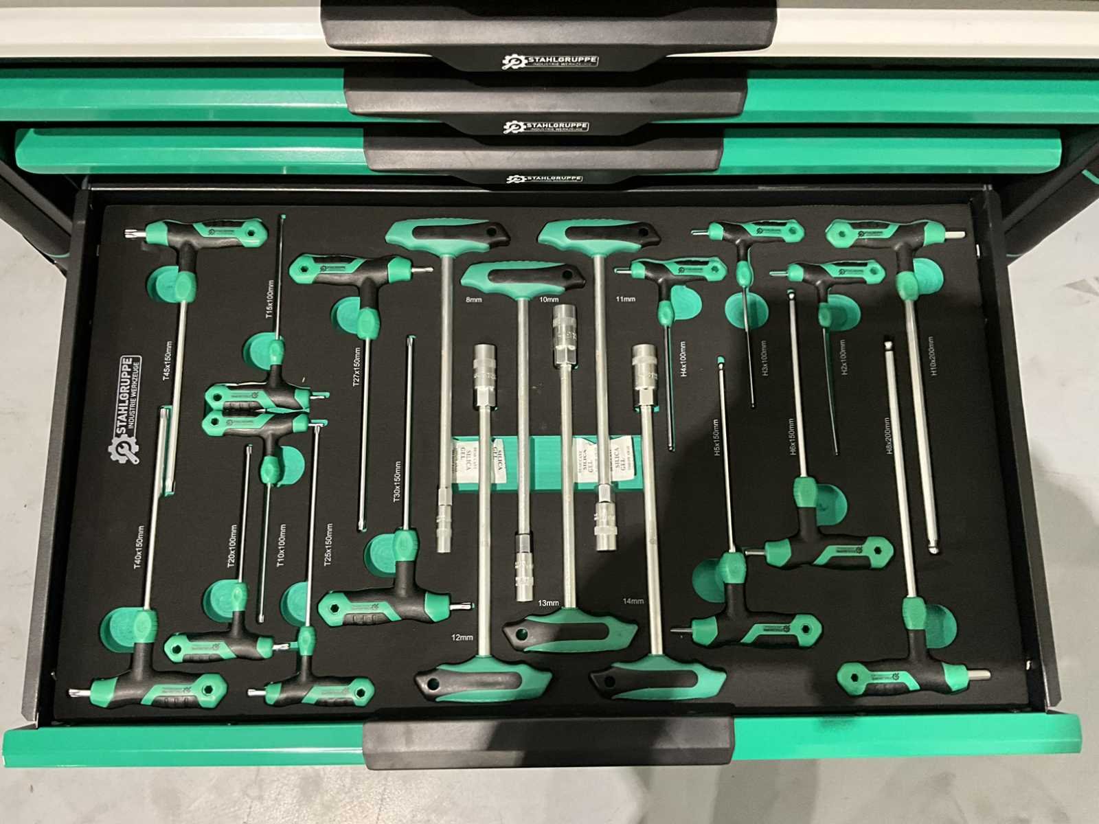 Staat: ongebruikt, in de originele verpakking Merk: Stahlgruppe Aantal laden: 7 laden Aantal gevulde laden: 6 gevulde laden Gereedschap: Chrome Vanadium gereedschap Inhoud: 3 dopsleutelsets (1/2”, 3/8” & 1/4”) ring- steeksleutelset (6-32 mm) ringratel-steeksleutelset (8-19 mm) diverse tangen (12 stuks) schuifmaat (0-150 mm * 0,02 mm) schroevendraaiers (21 stuks) T-greep Torxsleutels (T10-T45) T-greep dopsleutels (8-14 mm) T-greep Inbussleutels (2-8mm) krachtdoppen (10-32 mm) momentsleutel (0-300 Nm) Nee Merk: Stahlgruppe Type: S36 Bouwjaar: 2026 Aantal laden: 7 Met inhoud: true