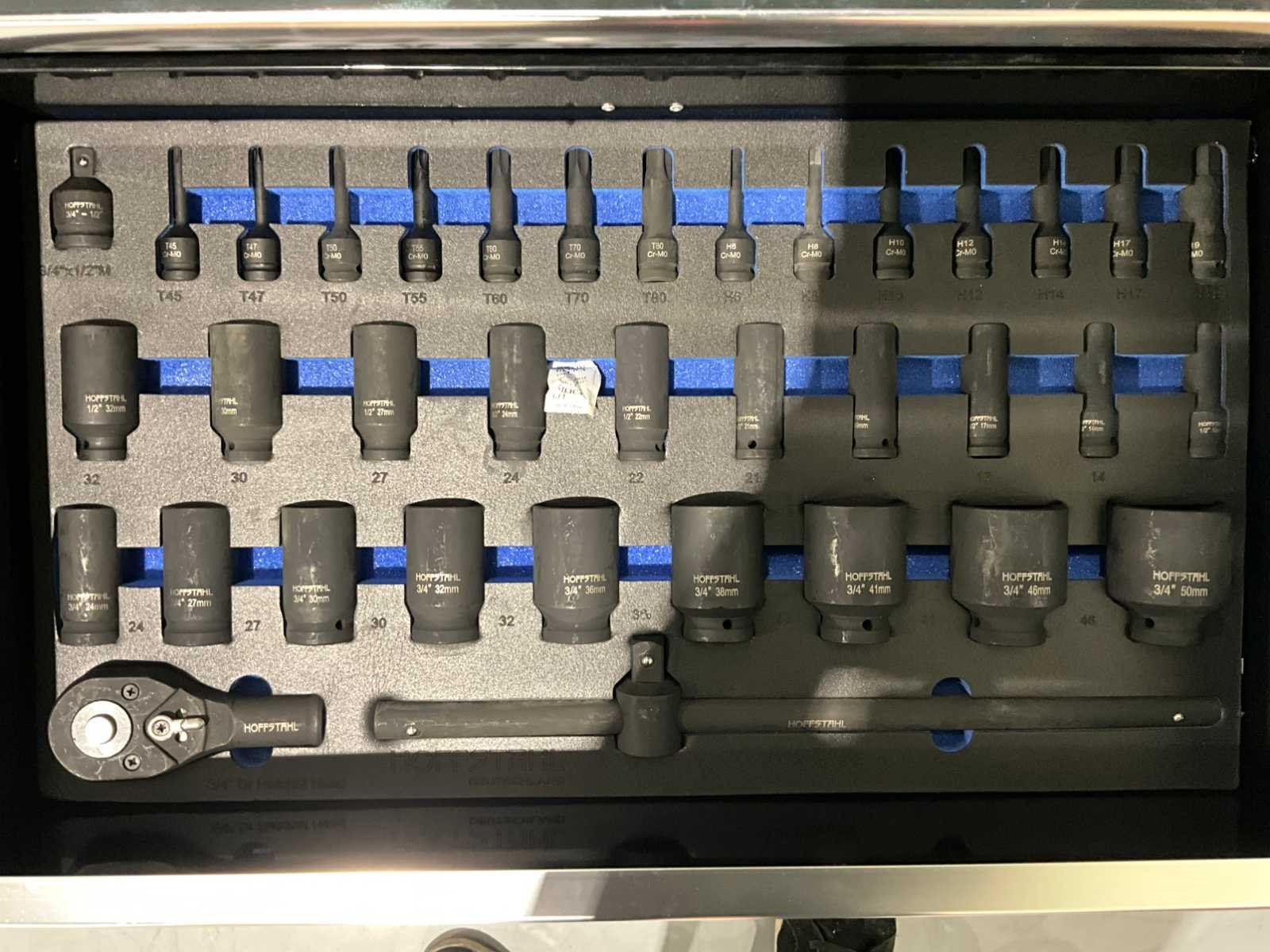 Ongebruikt 4 zwenkwielen rattelset en doppenset tot en met maat 50 386 st Heavy Duty gereedschapswagen gebruik: voor professionals aantal laden: 11 laden aantal gevulde laden: 9 gevulde laden gereedschap: chroom-vanadium gereedschap inhoud: 29-delige ring-steeksleutel set (6 mm - 50 mm) 3 ratelsleutel sets met doppen & bitsen (1/4”, 3/8” & 1/2”) 11-delige ring-ringsleutel set (6*7 mm - 30*32 mm) verstelbanre moersleutel 12-delige tangen set 2 hamers & 4 vijlen puntslag en beitel set 12 schroevendraaiers inbussleutels, Torxsleutels, precisiegereedschap 21-delige T-sleutelset 34-delige krachtdoppen set (12 mm - 50 mm) + Torx & inbus doppen & ratelsleutel 3/4,” LED-lamp, zaag, schaar, mes, meetgereedschappen enzovoort... in de originele verpakking Nee Merk: Hoffstahl Type: Deutschland PRO Bouwjaar: 2026 Aantal laden: 11 Met inhoud: true Eigen gewicht: 180kg Totale afmeting L: 1480mm Totale afmeting Breedte: 520mm Totale afmeting Hoogte: 1110mm