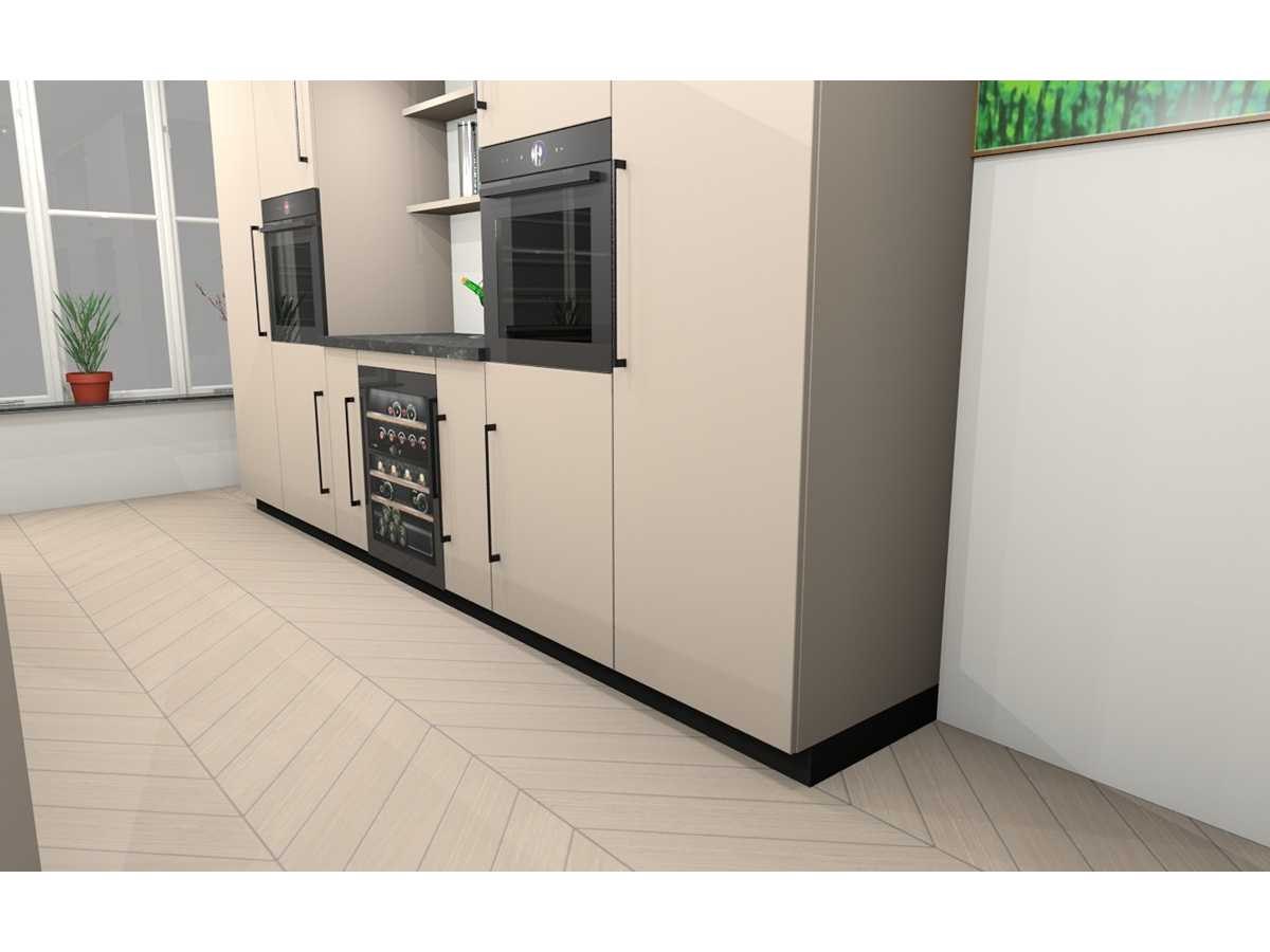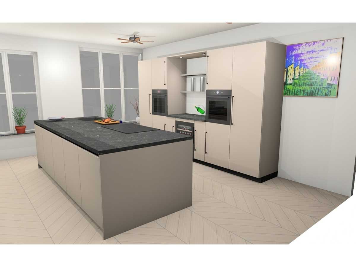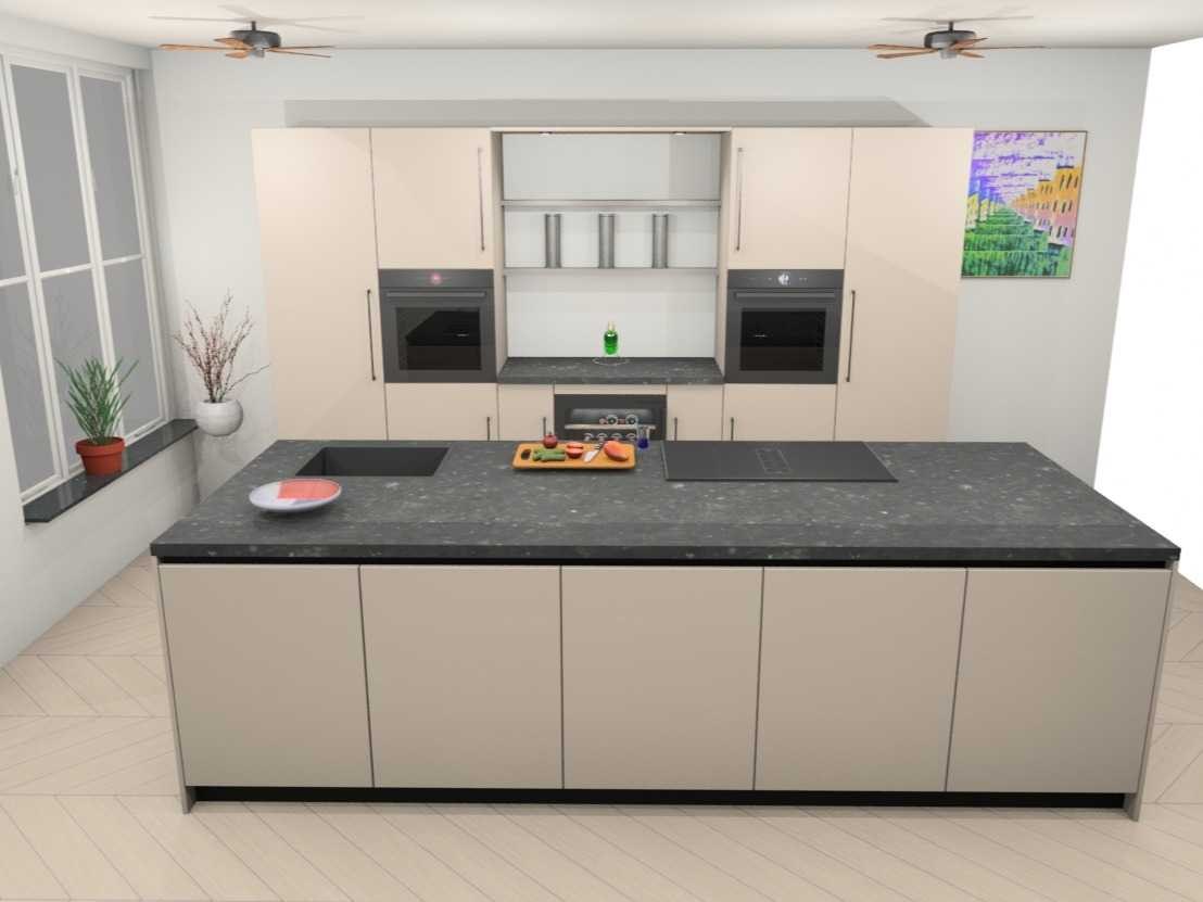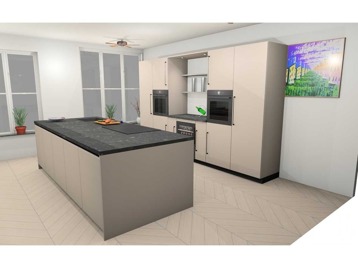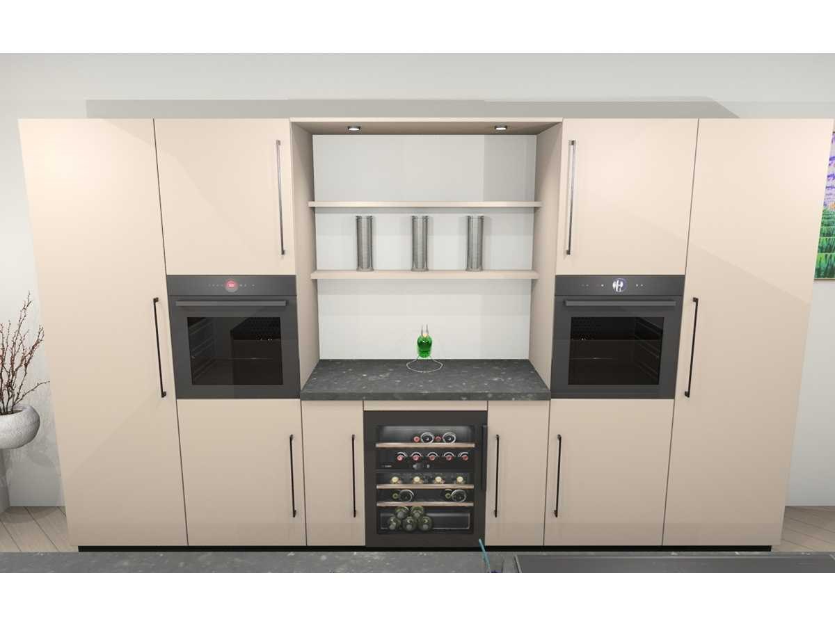 Blad nis. 120x60x4cm Composiet Easy Belgian Rock Honed. Bosch PVS895B16E Inductiekookplaat inclusief afzuigsysteem, 4 kookzones, combiZone, powerBoost-functie voor alle zones. Bosch KUW21AHG0 Onderbouw wijnklimaatkast Serie 6 met dual temperature Zones, powerVentilation, capaciteit 44 flessen. Let op! Keuken staat niet opgesteld, enkel 3D tekening en wordt geleverd ongebruikt in doos. Let op! Aanrecht blad is zwaar, tijdens afhaal dag zorgvuldig meenemen en neem extra krachtige mannen mee! Nee Merk: Häcker Concept130 Model: TOP SOFT-GL kashmir direktlak mat Type keukenopstelling: eiland Lengte: 360cm Breedte: 60cm Hoogte: 218cm Gootsteen: Reginox Houston rvs 50x40cm vlakinleg Werkblad hoogte: 92cm Aanrechtblad: Composiet Easy Belgian Rock Honed, 40mm Magnetron: Bosch HMG936AB1 Multifunctionele oven met magetronfunctie Serie 8, inhoud 67 liter Koelkast: Bosch KIR81SDD0, 178cm, Integreerbare koelkast Serie 6 met softClose deursluiting, inhoud 310 liter, Softclose: true Oven: Bosch HBG934AB1 Multifunctionele oven Serie 8 met 14 verwarmingswijzen, inhoud 71 liter, Vaatwasser: Bosch SMV4HU801E Volledig integreerbare vaatwasmachine serie 4 met 6 programma's, 4 speciale functies, Lengte kookeiland: 304cm Breedte kookeiland: 120cm Hoogte kookeiland: 92cm Plintkleur: kashmir mat Hoofdkleur: kashmir direktlak mat Style: Modern greep en eiland greeploos Kleur: kashmir direktlak mat