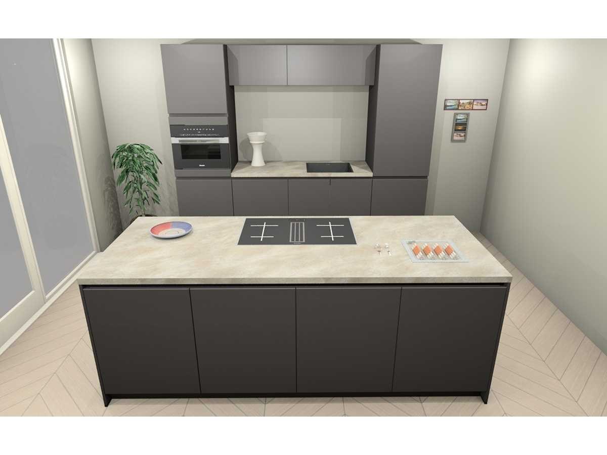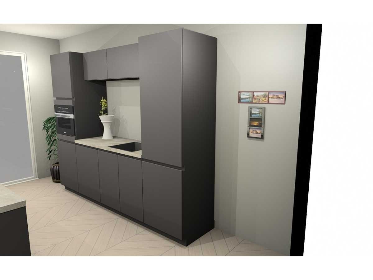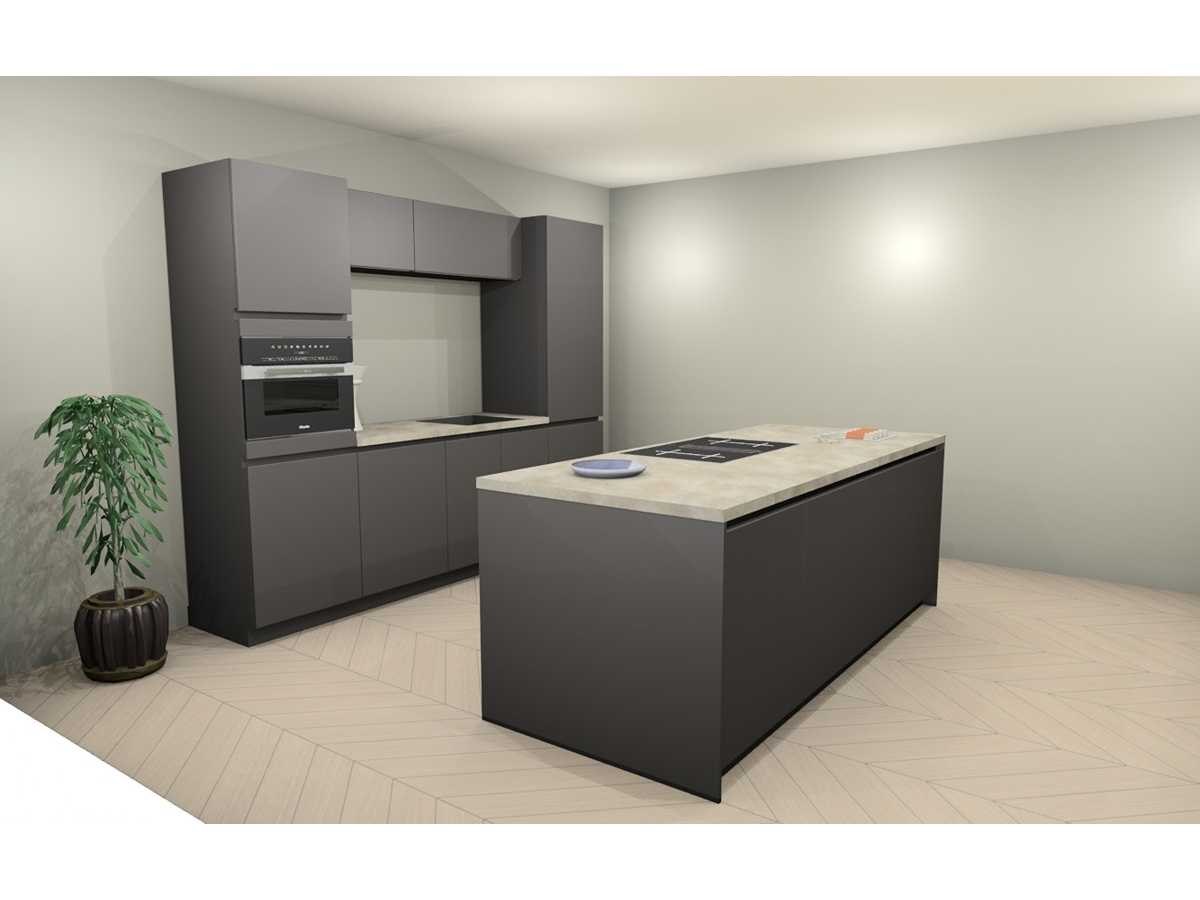 Miele KMDA7473FR-U Inductiekookplaat inclusief afzuigsysteem, 4 kookzones, 2 flex zones, 80cm. Let op! Staat niet opgesteld in de showroom, enkel via 3D tekening; wordt geleverd ongebruikt in doos. Let op! Excl. Kraan en accessoires. Nee Merk: Häcker Concept130 Model: TOP SOFT-GL grafiet mat lak Type keukenopstelling: Eiland Lengte: 270cm Breedte: 60cm Hoogte: 218cm Gootsteen: Reginox amsterdam 50 pure black Pure opbouw Werkblad hoogte: 92cm Aanrechtblad: HPL kalksteen repro (115) 3.8cm Softclose: true Oven: Miele H7240BMCLST Compacte multifunctionele oven met magnetronfunctie PureLine, inhoud 43 liter, nis 45cm Vaatwasser: Miele G5150SCVI Volledig integreerbare vaatwasmachine met 5 reinigingsprogramma's waaronder QuickPowerWash, 3 opties, capaciteit 14 couverts, geluidsniveau 45 dB(A) Lengte kookeiland: 244cm Breedte kookeiland: 100cm Hoogte kookeiland: 92cm Plintkleur: grafiet mat Hoofdkleur: grafiet mat lak Style: Modern greeploos Kleur: grafiet mat lak