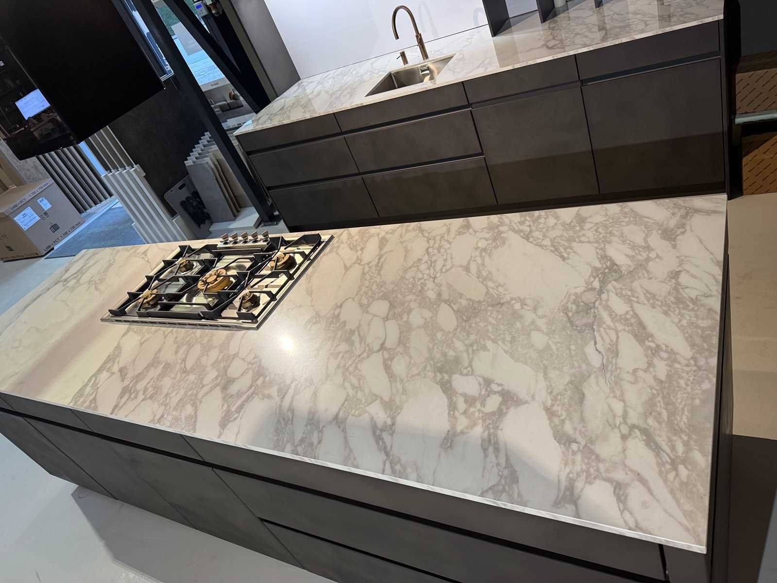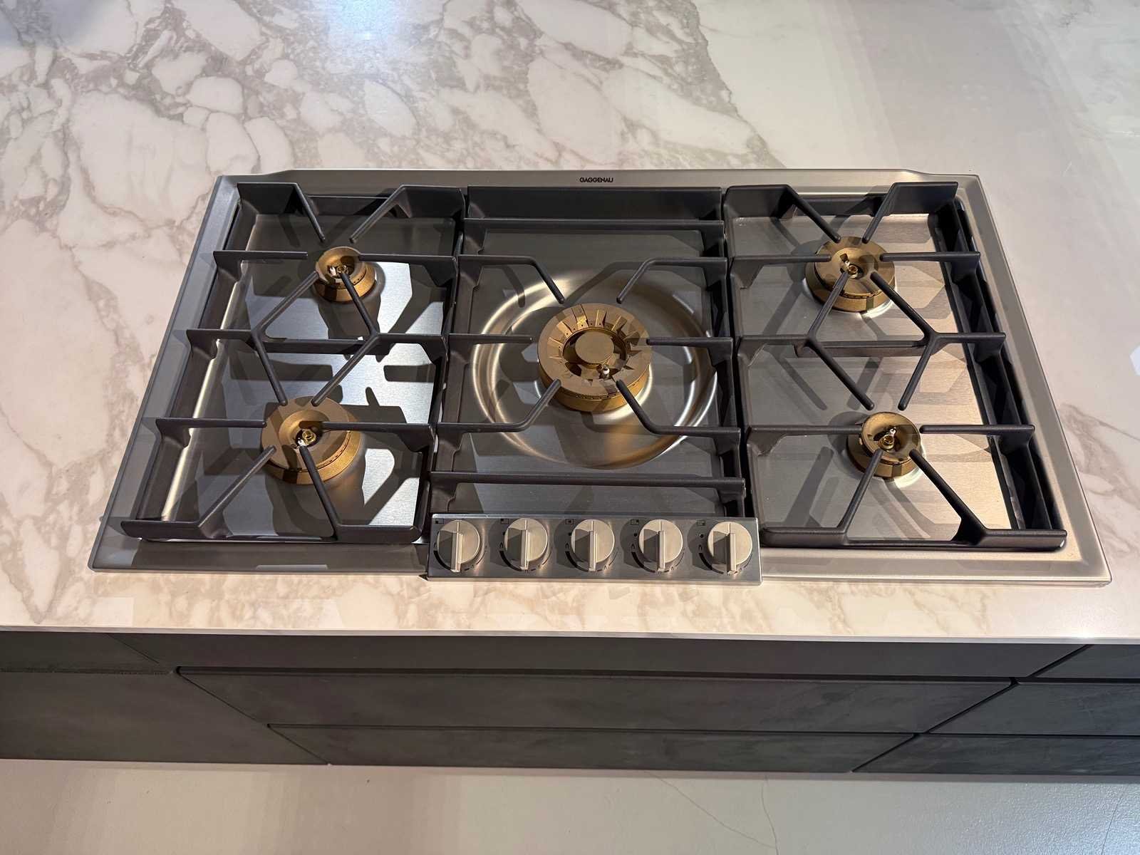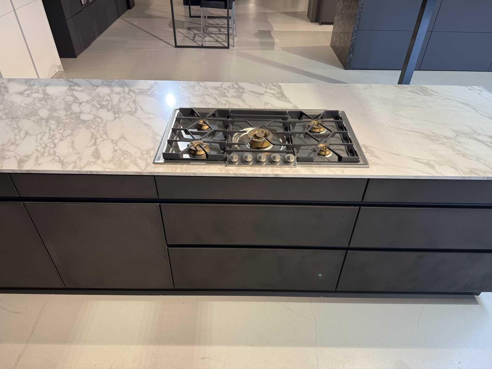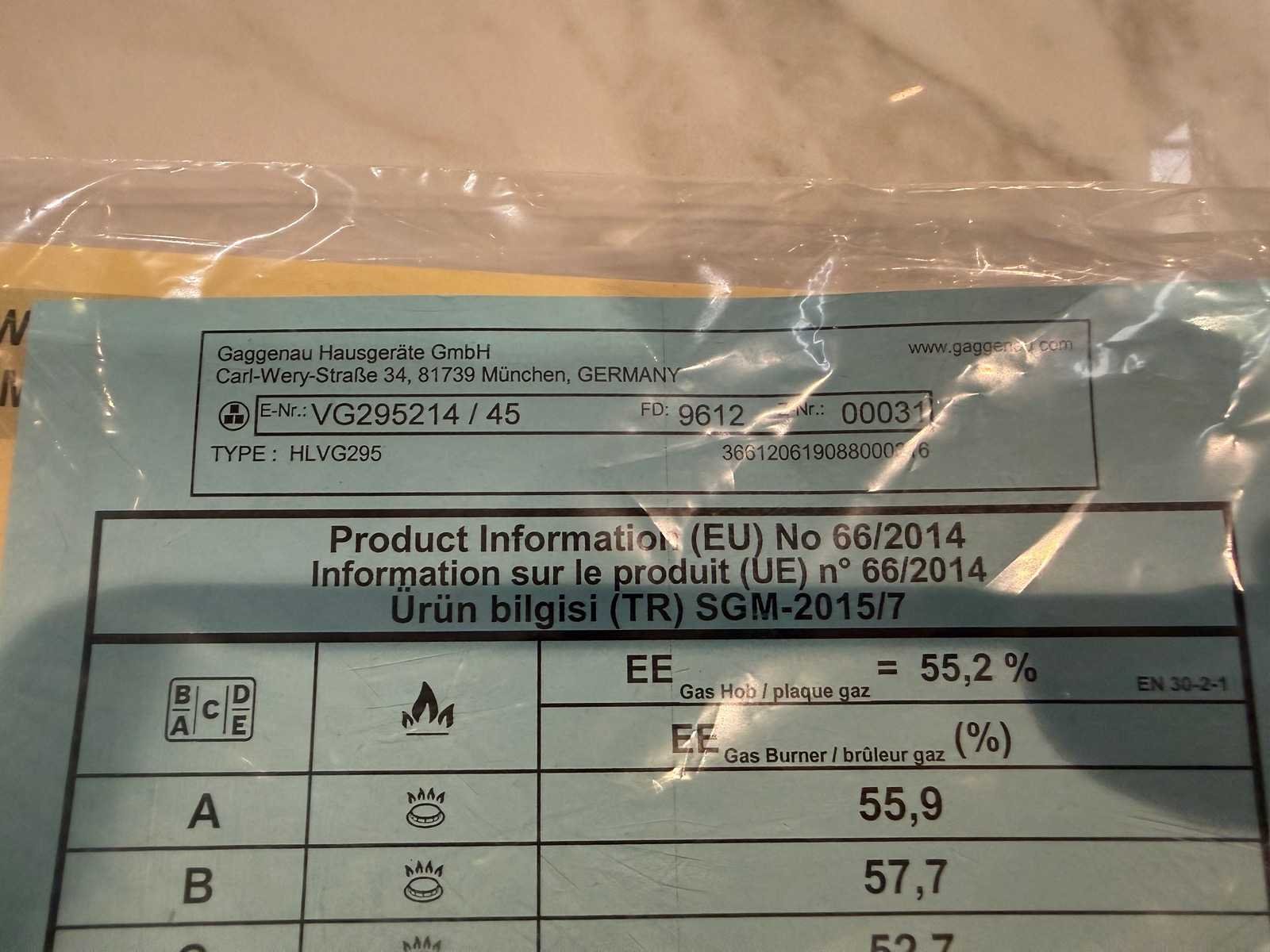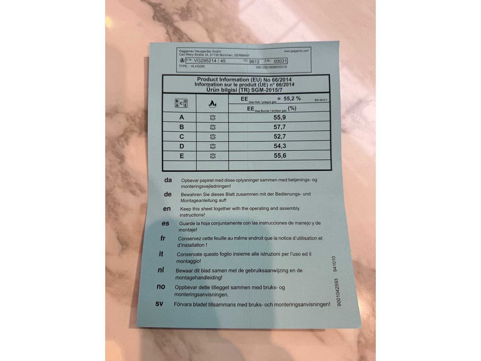 Showroom model; Set verkoop . Keramische aanrecht blad "Miracle" gepolijst. Blad bestaat uit 2 delen. Spoeldeel: afmeting 303x95cm, dikte 2cm. Met een onderbouw RVS Spoelbak van het merk Lavanto. 50x40cm. Kookdeel: afmeting 312x95cm, dikte 2cm, met Gaggenau Gaskookplaat. Zonder Quooker kraan en zeepdispenser, Zonder keuken en accessoires. Klant dient dit zelf te demonteren en te vervoeren. Nee Merk: Gaggenau Model: Gaskookplaat Product type: VG295214 Kleur: RVS Lengte: 91,4cm Breedte: 51cm
