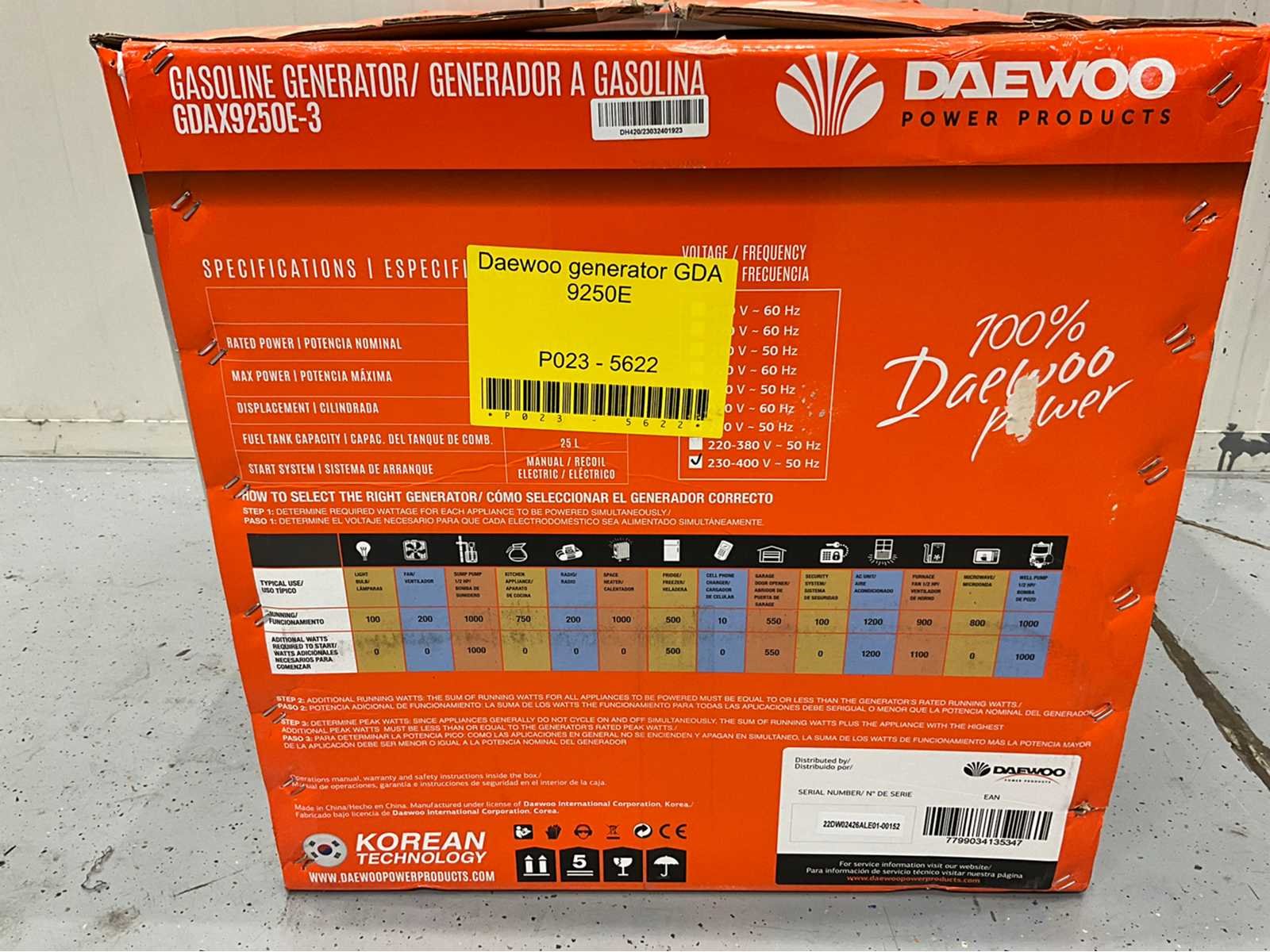 25 liter brandstoftank - Uitgangen: 220/240V; 220/380/415V - Continuvermogen 6000W - Motor: 420cc, 15 pk, 4-takt, 1 cilinder, luchtgekoeld. Elektrische starter voor eenvoudig opstarten Brandstofniveau-indicator voor nauwkeurige controle Krachtige en betrouwbare stroomgenerator met een vermogen van 6,5 kW, perfect voor zowel thuisgebruik als buitenevenementen. Mobiel, 2 wielen. Waarschuwingssysteem bij storingen Nee Merk: Daewoo Type: GDAX9250E-3 Bouwjaar: 2026 Benzine: true Motorvermogen (kW): 6,5kW Mobiel: true Afgelezen urenstand: 0 Handboek aanwezig: true Machinegewicht: 91kg Totale afmeting L: 750mm Totale afmeting Breedte: 700mm Totale afmeting Hoogte: 610mm