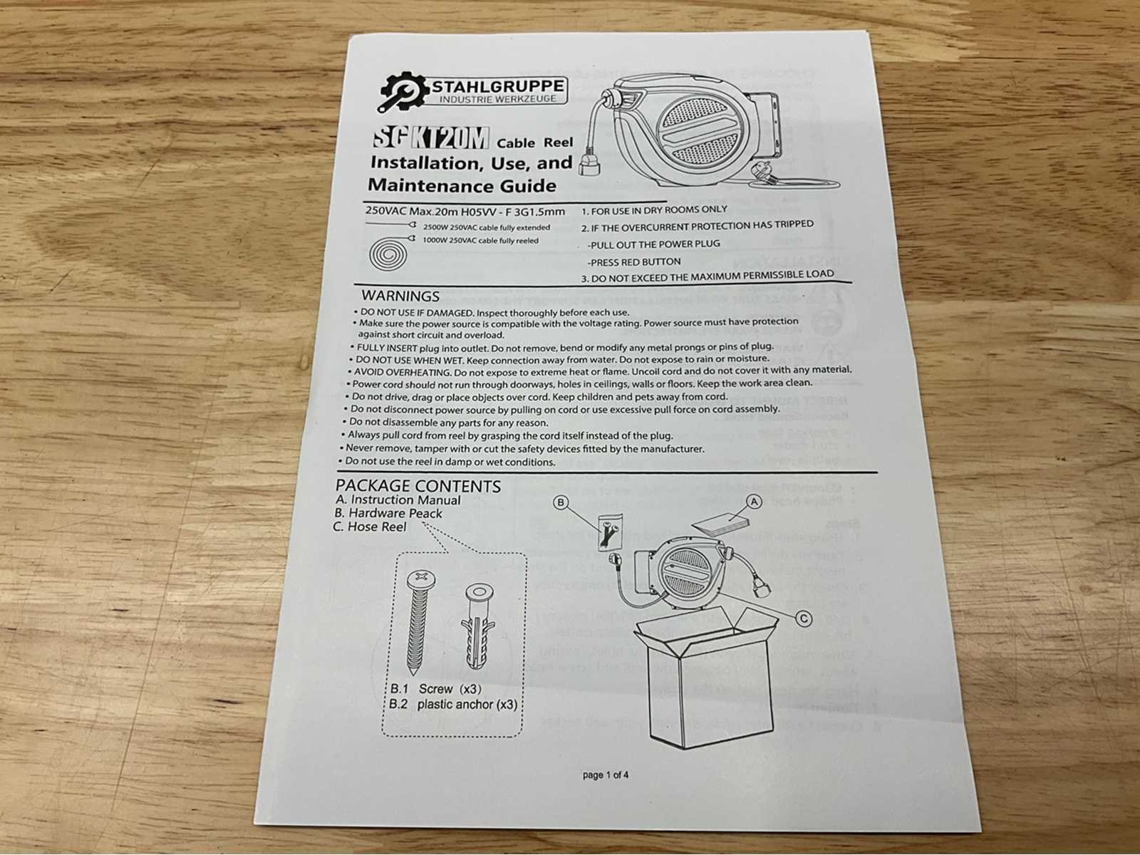 2 M ingaande kabel 20 M uitgaande kabel H 05 VV F 3G1.5mm 2500W volledig uitgerold 1000W volledig opgerold Verstelbare stop bal Overbelasting beveiliging Duurzame materialen Automatisch oprolsysteem Montagemateriaal inbegrepen Nee Merk: Stahlgruppe Type: SGKT20M Bouwjaar: 2026 Aansluiting: 220V