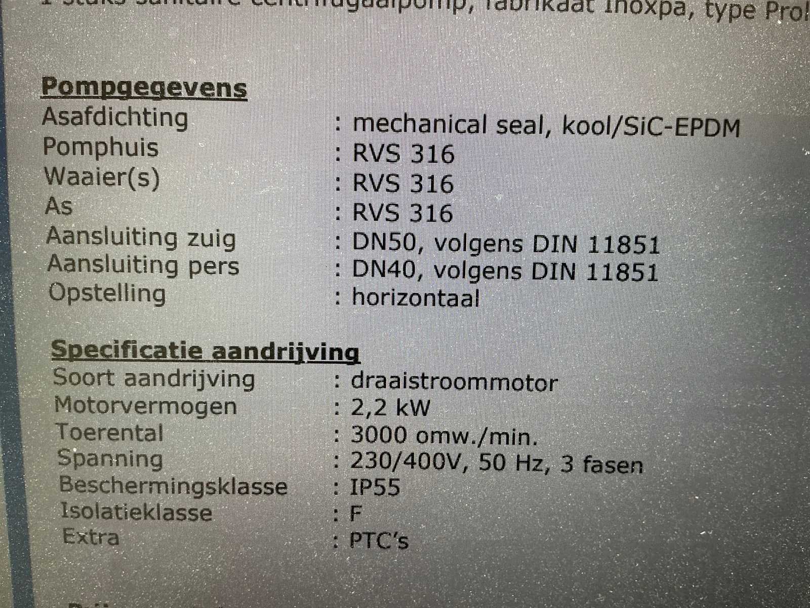 Nee Merk: Inoxpa Type: Prolac S-20 Bouwjaar: 2008 Serienummer: T031200 Centrifugaal: true Aansluiting: 400V Totale afmeting L: 500mm Totale afmeting Breedte: 280mm Totale afmeting Hoogte: 350mm
