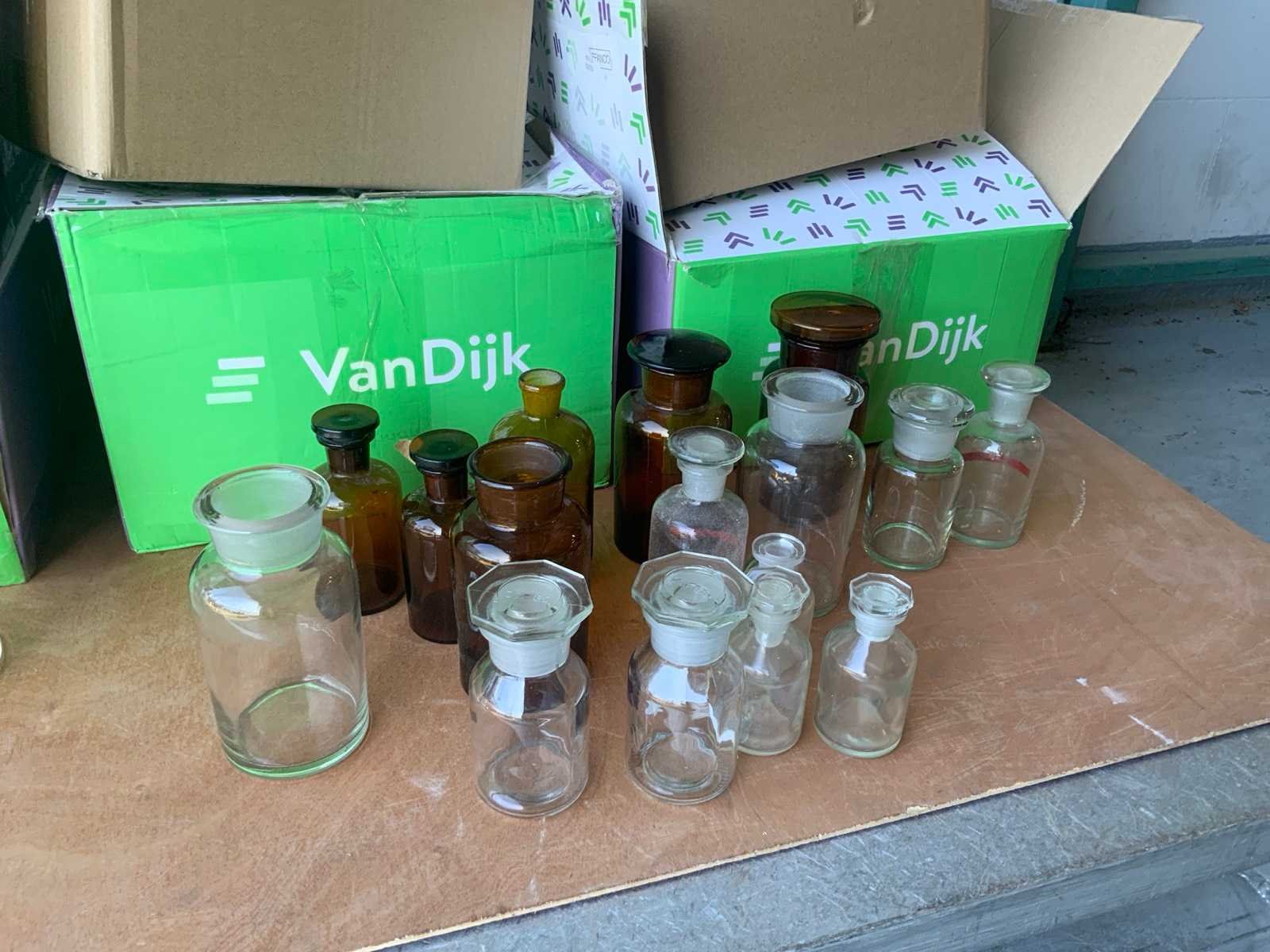 Circa: 100 stuks, diverse afmetingen, in totaal 6 dozen. Met geslepen glazen stoppen. Nee