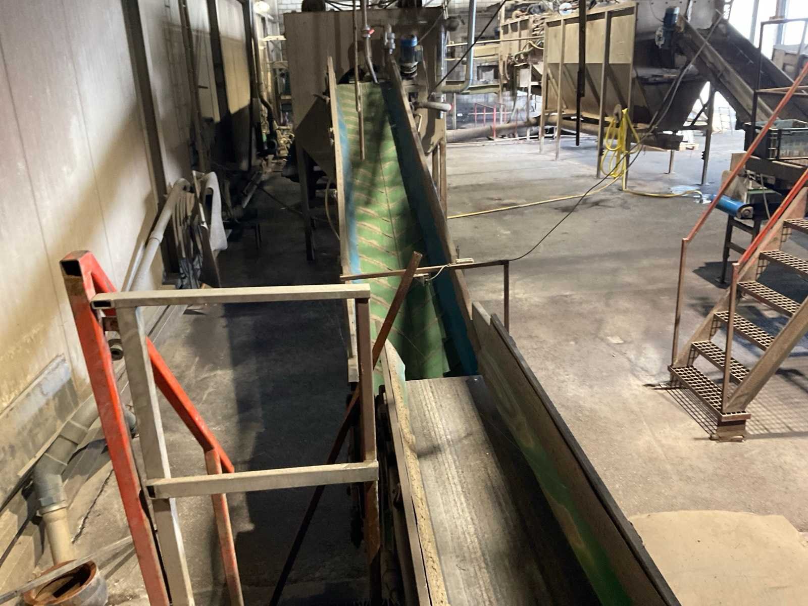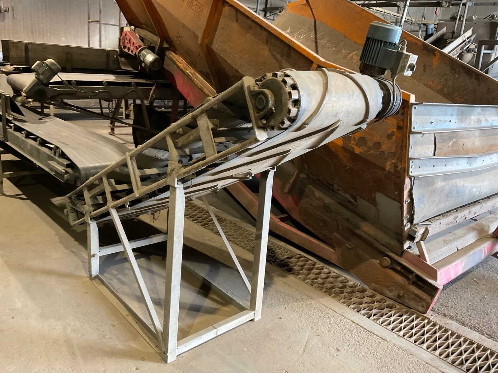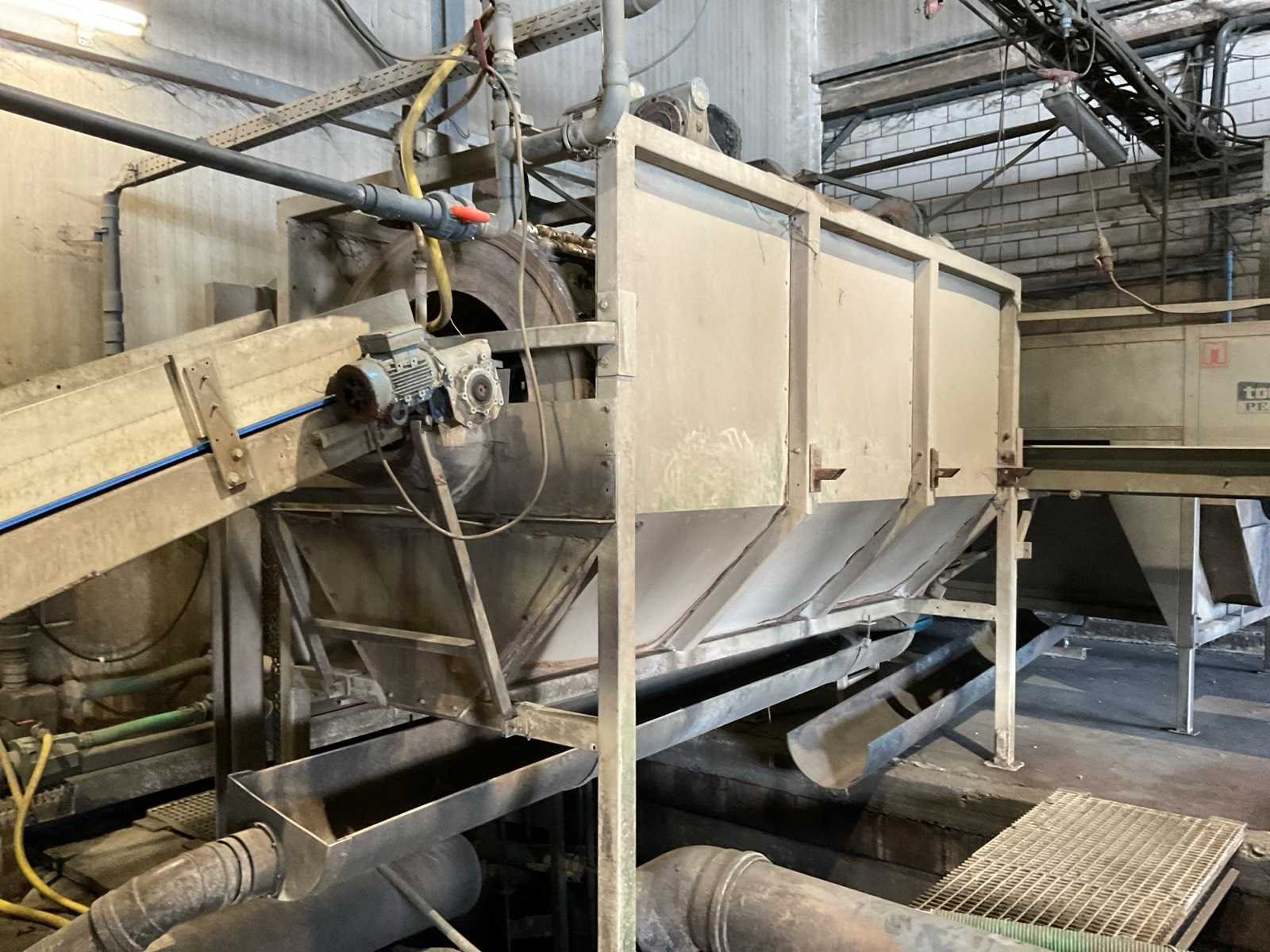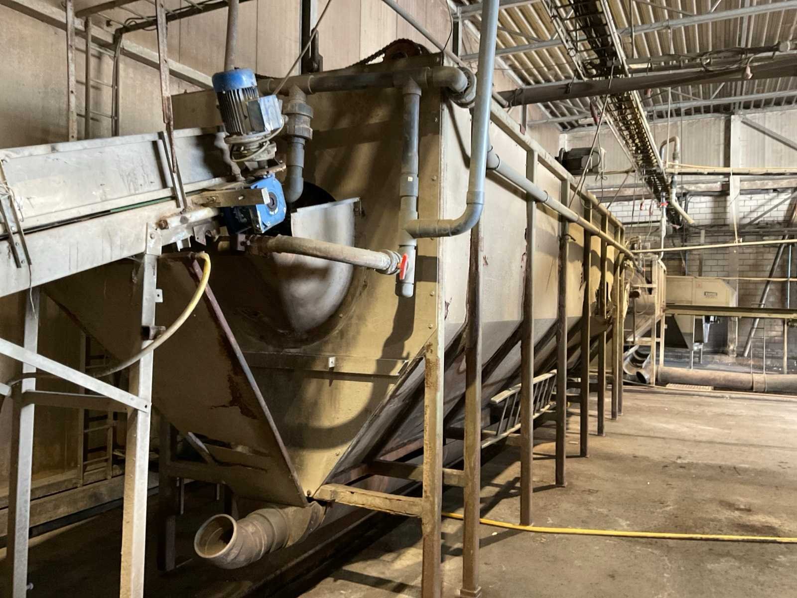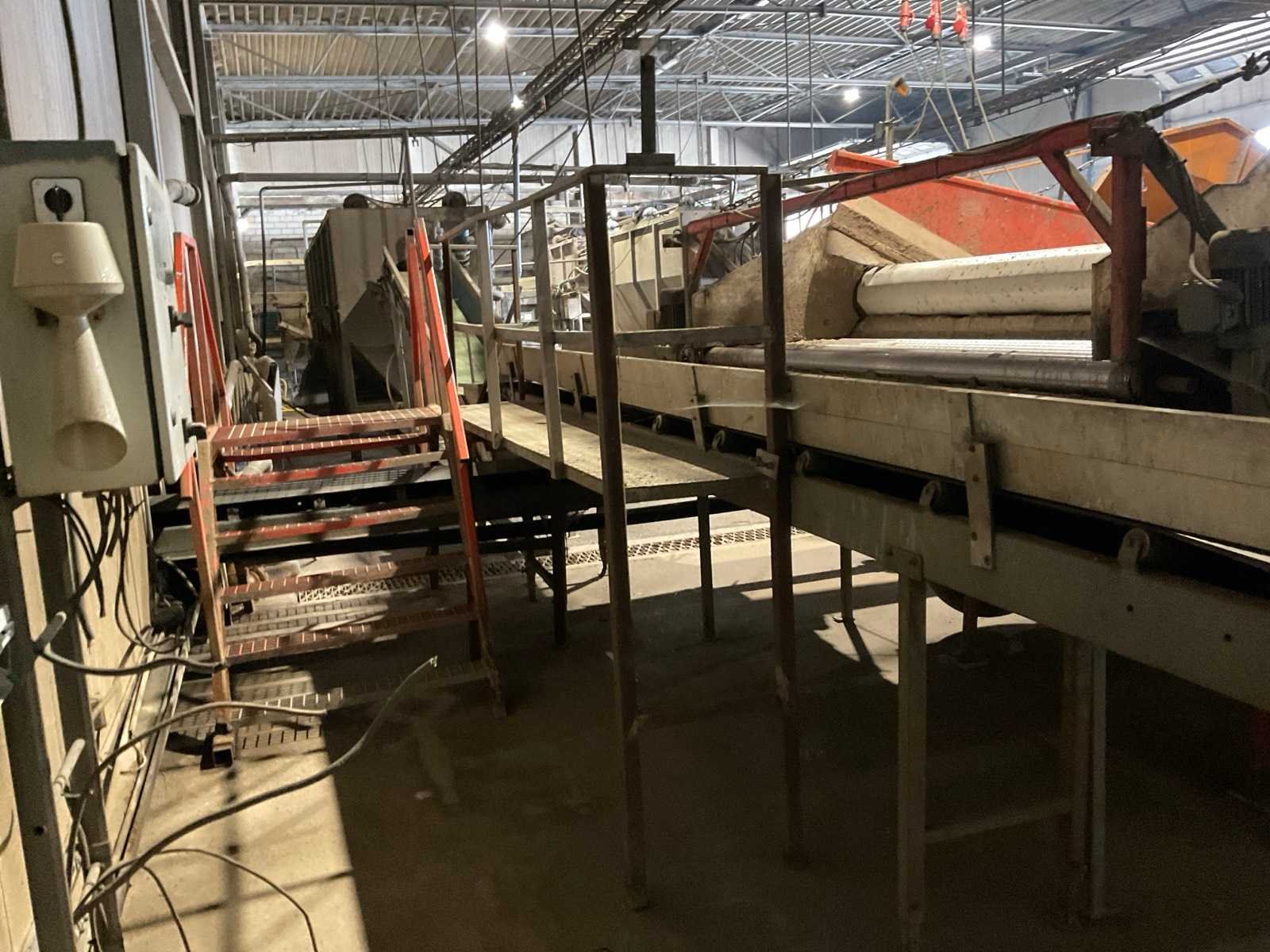 Bestaande uit: verrijdbare Amac BL120 stortbak, circa 10 m2, 1 transportband grond, circa 420 cm, transportband product 625 cm, bordestrap met extra platform, transportband product 800 cm, opvoerband product 240 cm, opvoerband 550 cm, trommelwasser (afmetingen circa 800x180 cm lengte x diameter) totale afmetingen 900x200x340 cm, aan- en afvoer water, opvoerband 280 cm, stukken trommel (afmetingen circa 300x150 cm lengte x diameter), totale afmetingen 350x175x300 cm, transportband 400 cm, opvoerband 210 cm, opvoerband 270 cm, Martin Maq Lavad Pul schud borstelmachine bouwjaar 2006. Borstel afmetingen circa 300x50 cm. Aansluiting 400 volt. No