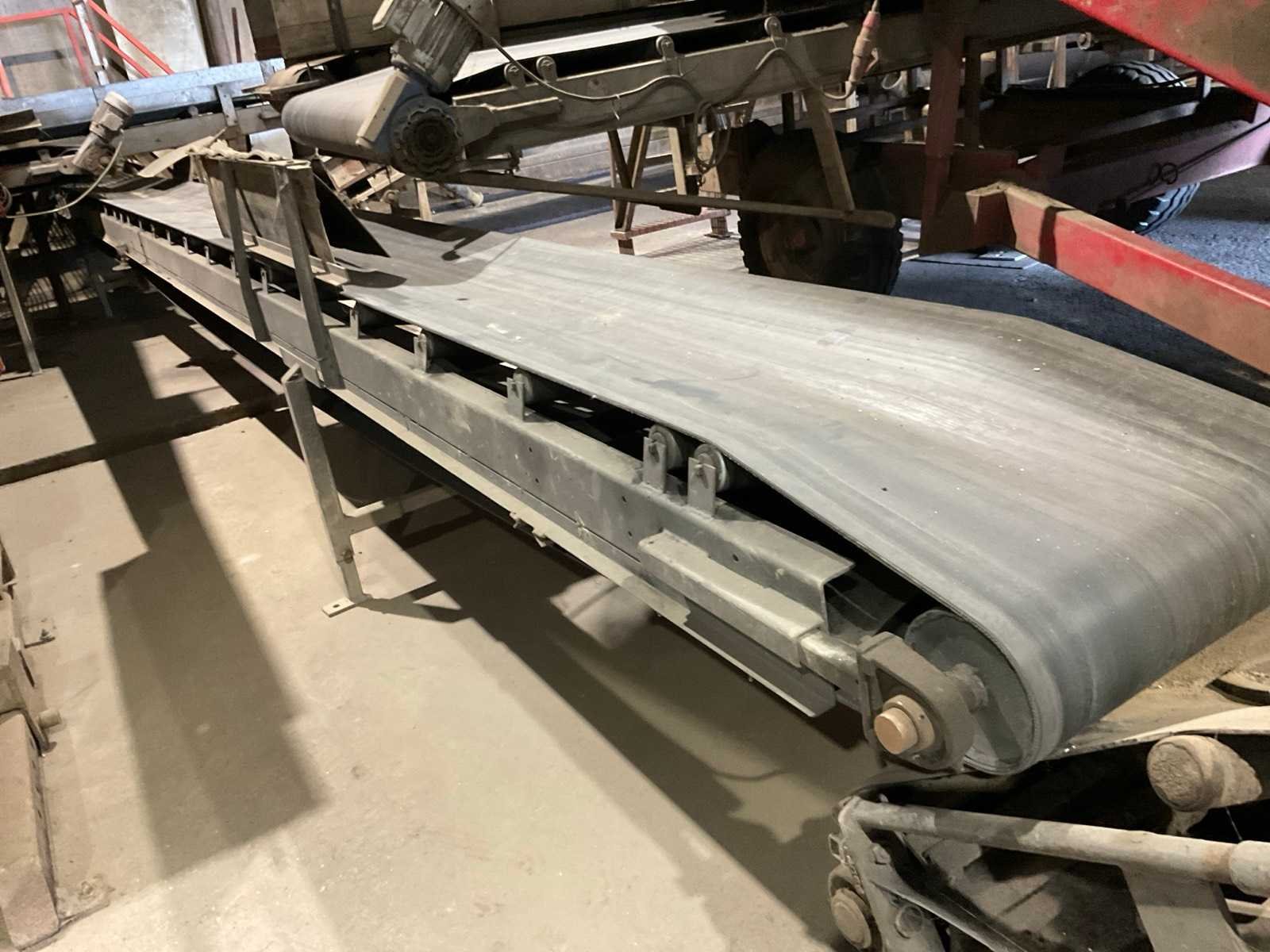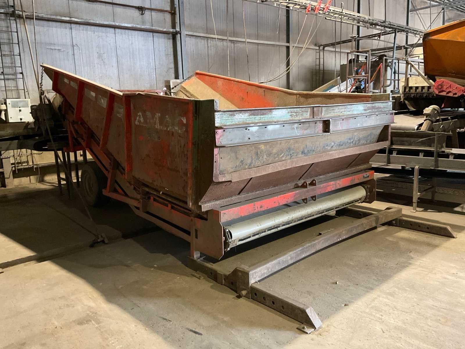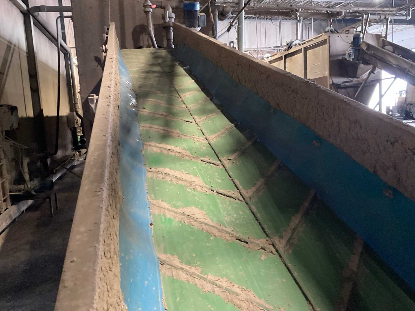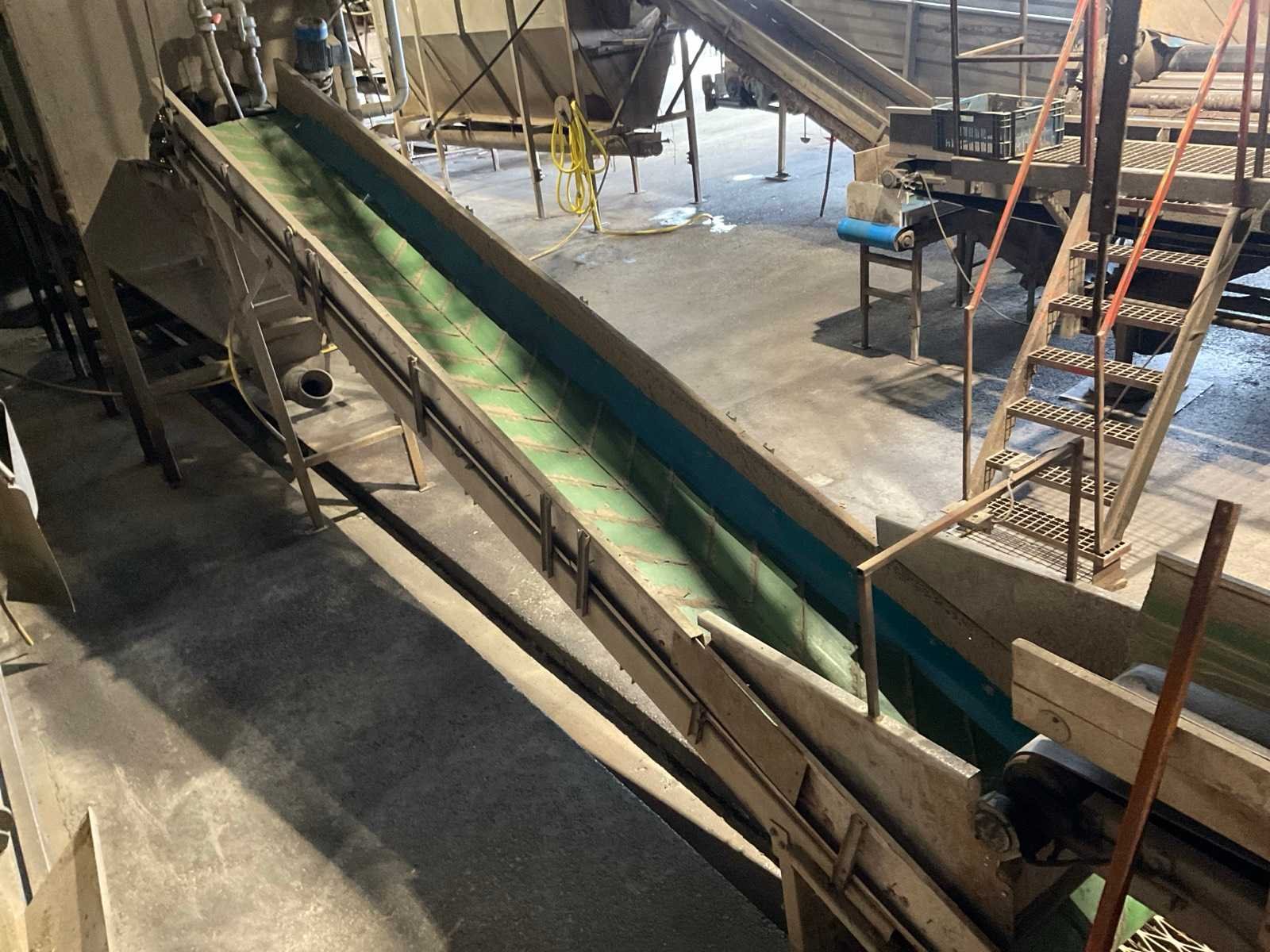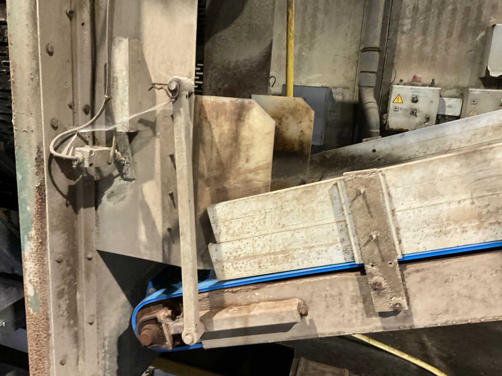 Bestaande uit: verrijdbare Amac BL120 stortbak, circa 10 m2, 1 transportband grond, circa 420 cm, transportband product 625 cm, bordestrap met extra platform, transportband product 800 cm, opvoerband product 240 cm, opvoerband 550 cm, trommelwasser (afmetingen circa 800x180 cm lengte x diameter) totale afmetingen 900x200x340 cm, aan- en afvoer water, opvoerband 280 cm, stukken trommel (afmetingen circa 300x150 cm lengte x diameter), totale afmetingen 350x175x300 cm, transportband 400 cm, opvoerband 210 cm, opvoerband 270 cm, Martin Maq Lavad Pul schud borstelmachine bouwjaar 2006. Borstel afmetingen circa 300x50 cm. Aansluiting 400 volt. No