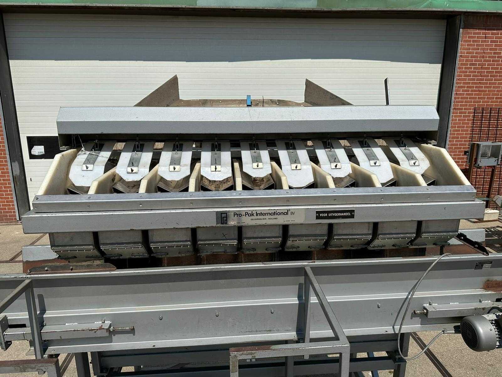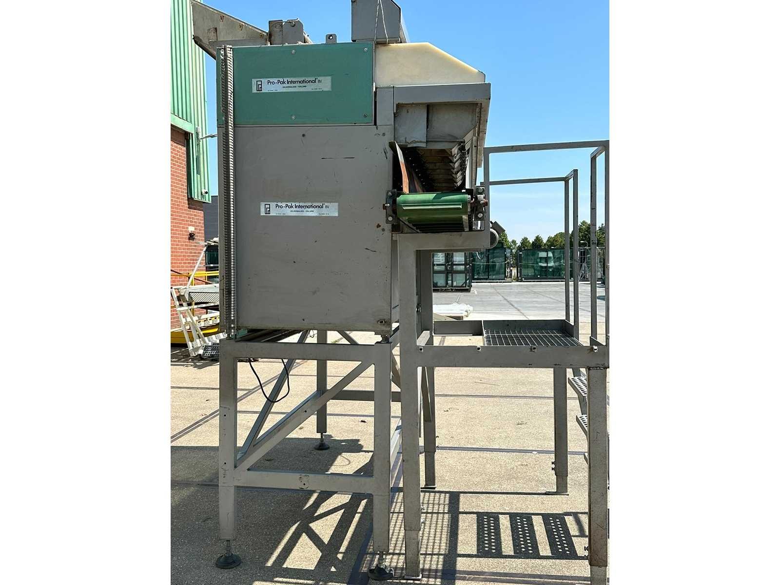 Inclusief: Afvoerband No Merk: Pro-Pak Type: CW9-V Bouwjaar: 1991 Serienummer: 502-090 Aantal koppen: 9 Aansluiting: 400V Totale afmeting L: 2600mm Totale afmeting Breedte: 2000mm Totale afmeting Hoogte: 3150mm