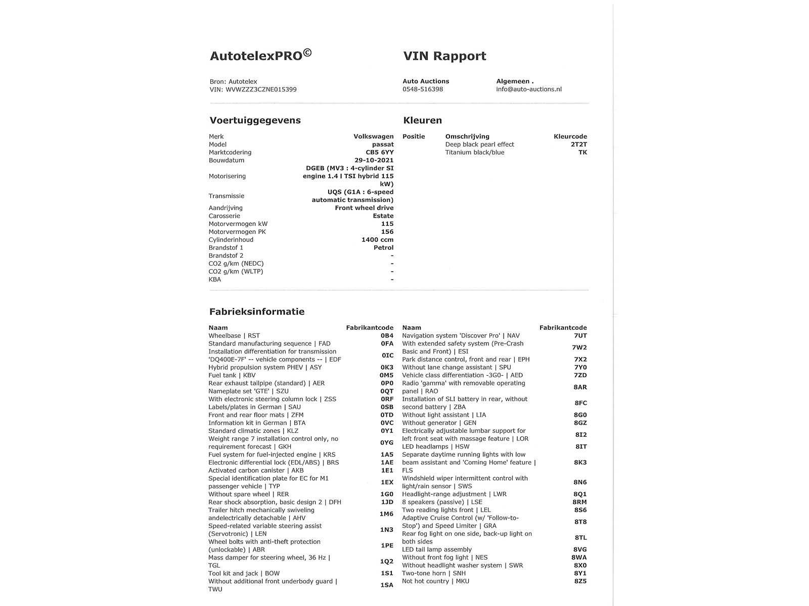 Duitse kenteken papieren. Indien gewenst kunnen wij het gehele import proces voor u verzorgen, RDW invoer, BPM taxatie, Douane afwikkeling, stalling etc. Voor deze auto zijn de totale invoerkosten inclusief de BPM €1.195.- Dus voor €1.195.- boven op uw aankoopprijs verzorgen wij het NL kenteken voor u. (This option is only for Dutch buyers) Voor vragen kunt u mailen naar info@auto-auctions.nl Nee Kenteken: Duitse Kenteken Papieren Merk: Volkswagen Model: Passat Variant Type: GTE 1.4 TSI PHEV Afgelezen kilometerstand: 91901km Cilinderinhoud: 1395cc Vermogen (kW): 160kW Brandstof: Benzine Hybride Chassisnummer: WVWZZZ3CZNE015399 Datum eerste toelating: 11-11-2021 Vermogen (pk): 218hp Aantal zitplaatsen: 5 Kleur: Zwart Transmissie: Automaat Aantal deuren: 5 Aantal sleutels: 2 Aantal cilinders: 4 Carrosserie: Stationwagen Nationaliteit documenten: Duitse Kenteken Papieren Onderhoudshistorie: Digitaal Volledig Aanwezig Start en rijdt: Ja