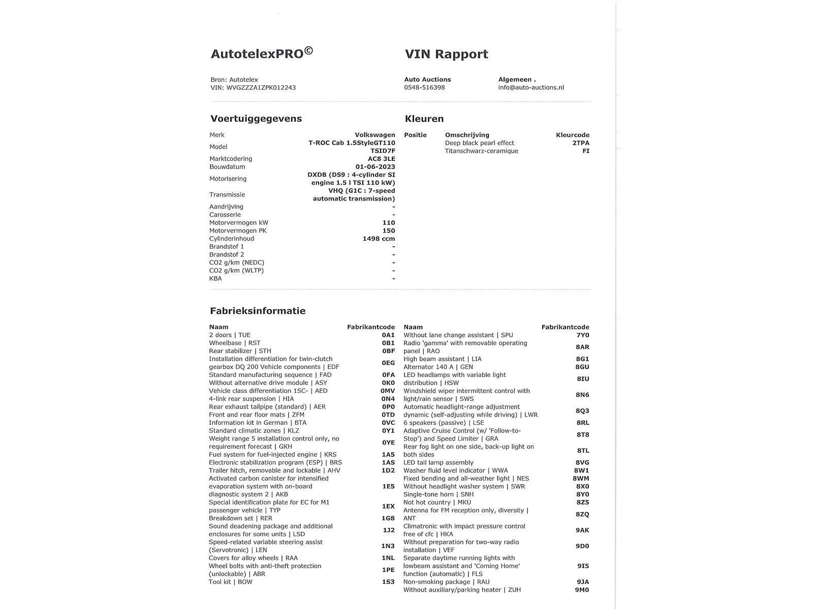 Duitse kenteken papieren. Indien gewenst kunnen wij het gehele import proces voor u verzorgen, RDW invoer, BPM taxatie, Douane afwikkeling, stalling etc. Voor deze auto zijn de totale invoerkosten inclusief de BPM €4.450.- Dus voor €4.450.- boven op uw aankoopprijs verzorgen wij het NL kenteken voor u. (This option is only for Dutch buyers) Voor vragen kunt u mailen naar info@auto-auctions.nl Nee Kenteken: Duitse Kenteken Papieren Merk: Volkswagen Model: T-Roc Cabriolet Type: 1.5 TSI Afgelezen kilometerstand: 28772km Cilinderinhoud: 1498cc Vermogen (kW): 110kW Brandstof: Benzine Chassisnummer: WVGZZZA1ZPK012243 Datum eerste toelating: 21-02-2024 Vermogen (pk): 150hp Aantal zitplaatsen: 5 Kleur: Deep Black Pearl Effect Transmissie: Automaat Aantal deuren: 5 Aantal sleutels: 2 Velgmaat: 17 Aantal cilinders: 4 Carrosserie: Cabriolet Nationaliteit documenten: Duitse Kenteken Papieren Onderhoudshistorie: Digitaal Volledig Aanwezig Start en rijdt: Ja
