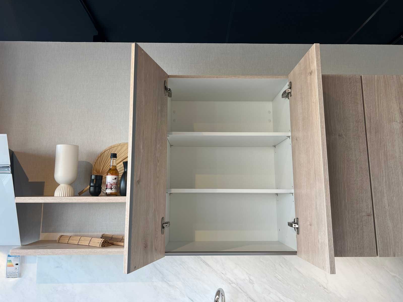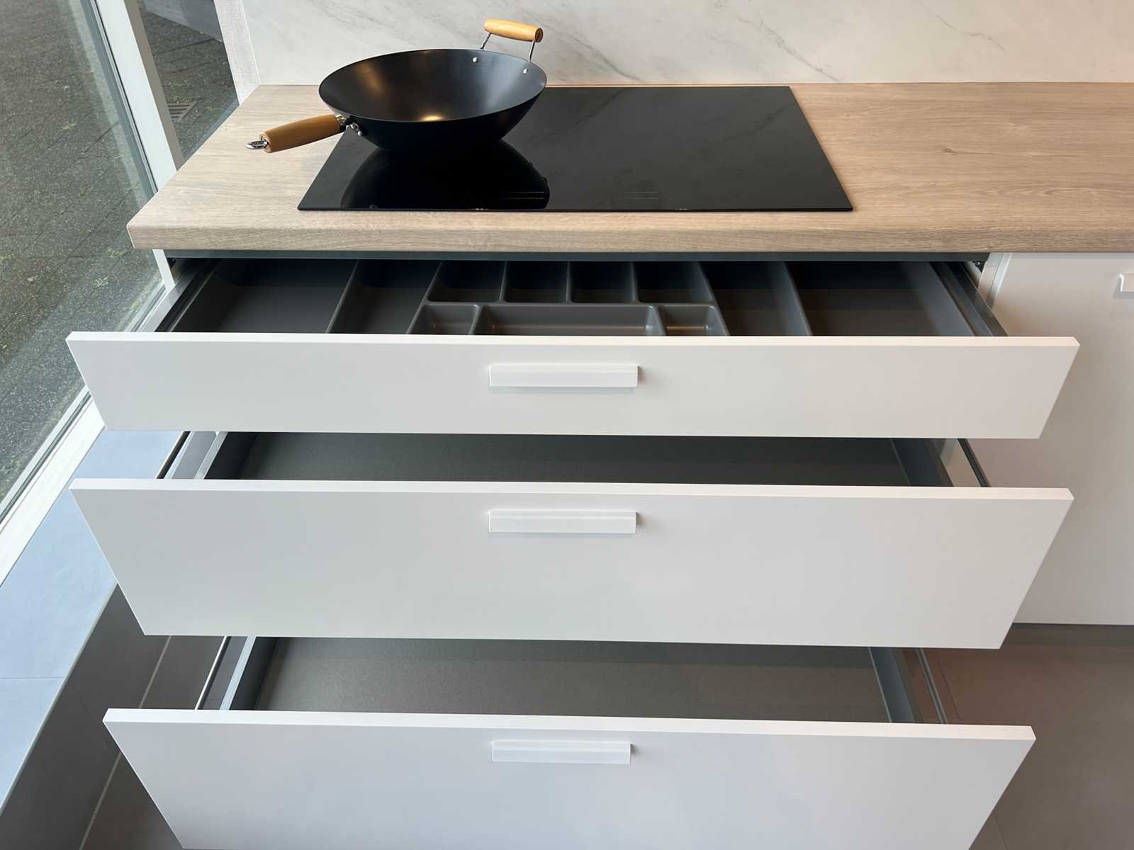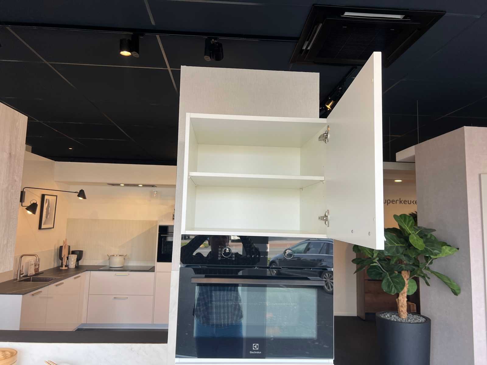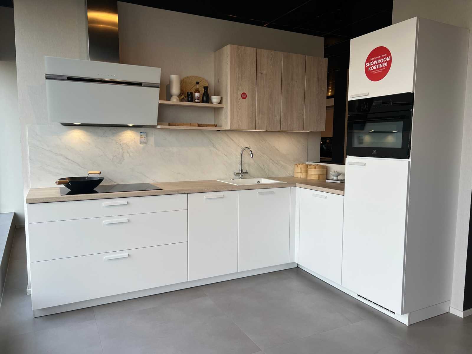 Afmetingen linkerdeel circa 295x60x93 cm; afmetingen rechterdeel circa 185x60x226 cm; reeds gedemonteerd en ingepakt op pallets. (afstapelen, omruilen of statiegeld per pallet); pallets zijn niet inbegrepen; statiegeld betalen bij afhalen, of pallets afstapelen; werkblad niet ingepakt op pallets (26-SKV-03797) Nee Merk: Schüller Type keukenopstelling: Hoek Kraan: Ja Gootsteen: Elleci Aanrechtblad: Kunststof Fornuis: Etna Koelkast: Electrolux EFB33AE10S1 Softclose: true Oven: Electrolux CVL6E46Z Afzuigkap: Elica E077XXI-168-503 Vaatwasser: Electrolux EES47320L Kleur: Alpinwit en Eiken Montreal