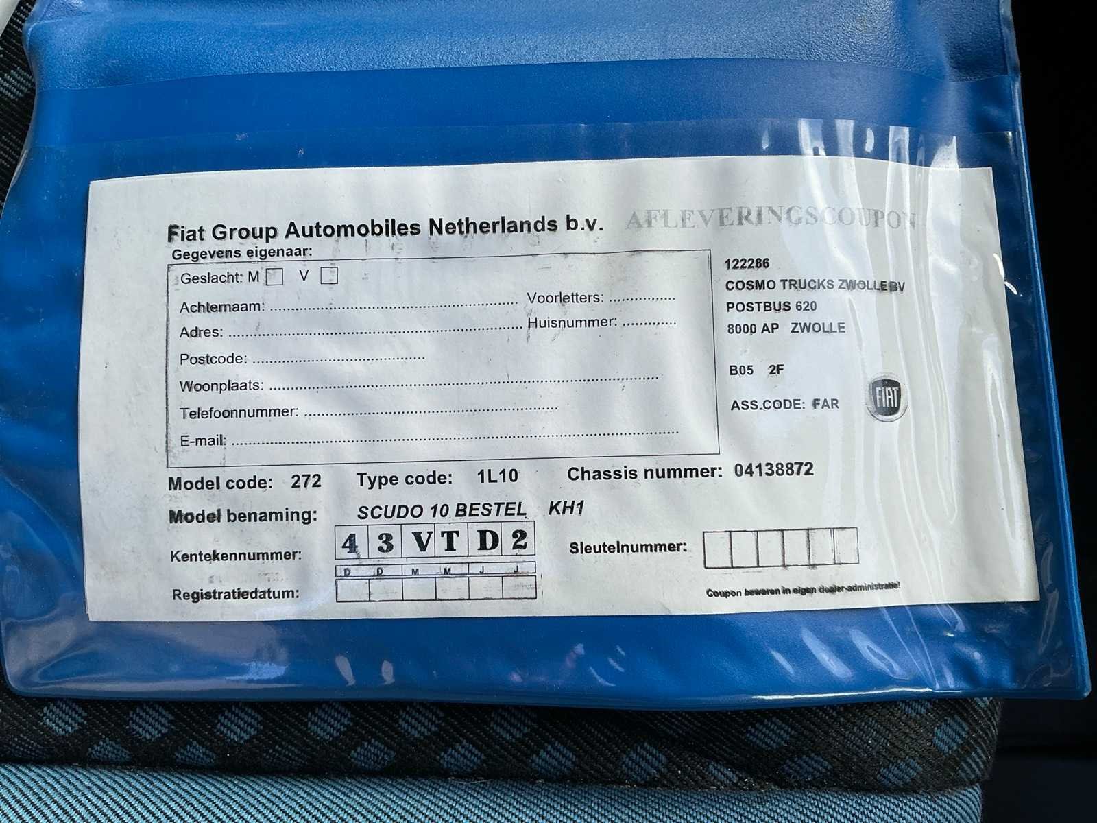 Voorzien van 4 cilinder 1.6 MulitiJet dieselmotor, audio installatie, elektrisch bedienbare ramen voor, 'Kingalu' imperial, lat-om-lat betimmering / zijbeplating, schuifdeur rechts, trekhaak, tweezitsbank, laadruimte met diverse opbergruimte No Kenteken: 43-VTD-2 Merk: Fiat Type: 1.6 MultiJet KH1 Model: Scudo Bouwjaar: 2008 Chassisnummer: ZFA27000064138872 Afgelezen kilometerstand: 164191km Cilinderinhoud: 1560cc Vermogen (kW): 66kW Brandstof: diesel Datum eerste toelating: 2008-07-05 Datum eerste toelating (NL): 2008-07-05 APK vervaldatum: 2026-03-31 Transmissie: Handgeschakeld Aantal zitplaatsen: 3 Kleur: `Witr Bruto BPM (NL): 7520 Rest BPM: 0 Ledig gewicht: 1636kg Laadvermogen: 1025kg Vermogen (pk): 90 Aantal cilinders: 4 Carrosserie: Gesloten opbouw Emissieklasse: 4 Kentekenpapieren compleet?: true Boorddocumenten aanwezig?: true Maximaal trekgewicht ongeremd: 750 Self drive export possible : true