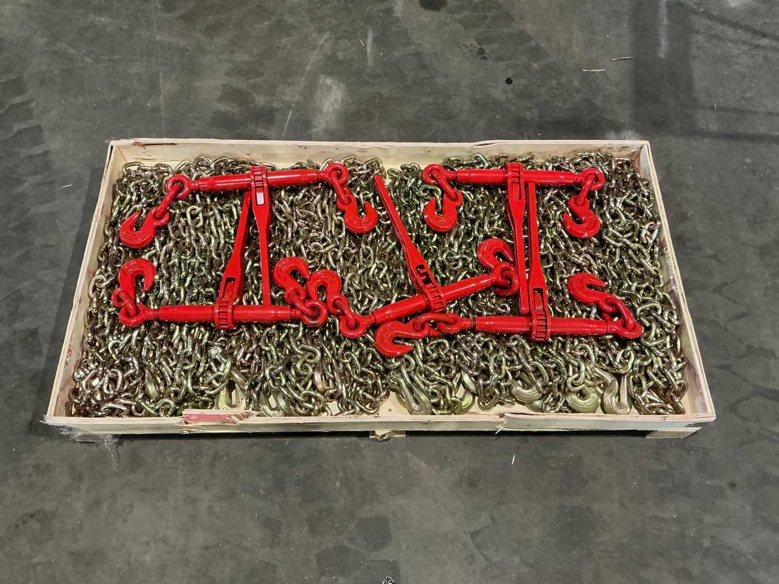 Inhoud pallet: 5 stuks ratelspanner met een draagvermogen van 4,17 ton; 10 stuks transportketting (grade 70), lengte 6,10 meter, dikte 3/8'' -1/2". Productkenmerken: * Zware ratelspanners met een werklastlimiet van 2450 kg, ontworpen voor veilig en efficiënt vastzetten van ladingen. * Grade 70 kettingen van 6,1 meter lang, gemaakt van hoogwaardig staal voor betrouwbare ladingzekering. * Ideaal voor gebruik op opleggers, vrachtwagens en bij het vervoeren van zwaar materieel. Toepassingen: Perfect voor professioneel transport, bouwlogistiek, landbouw en andere zware span- en zekeringstoepassingen. No