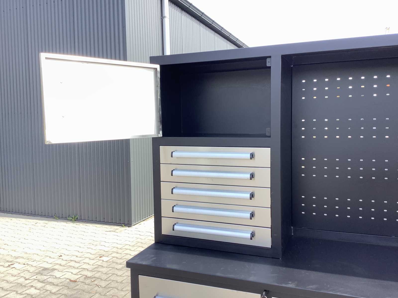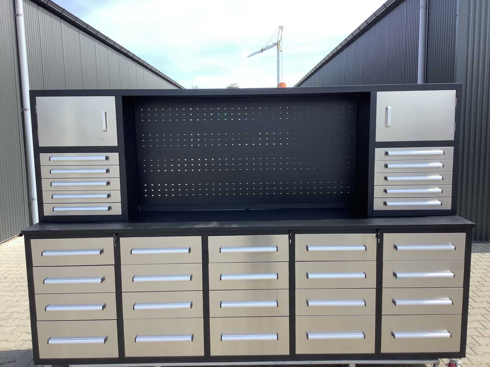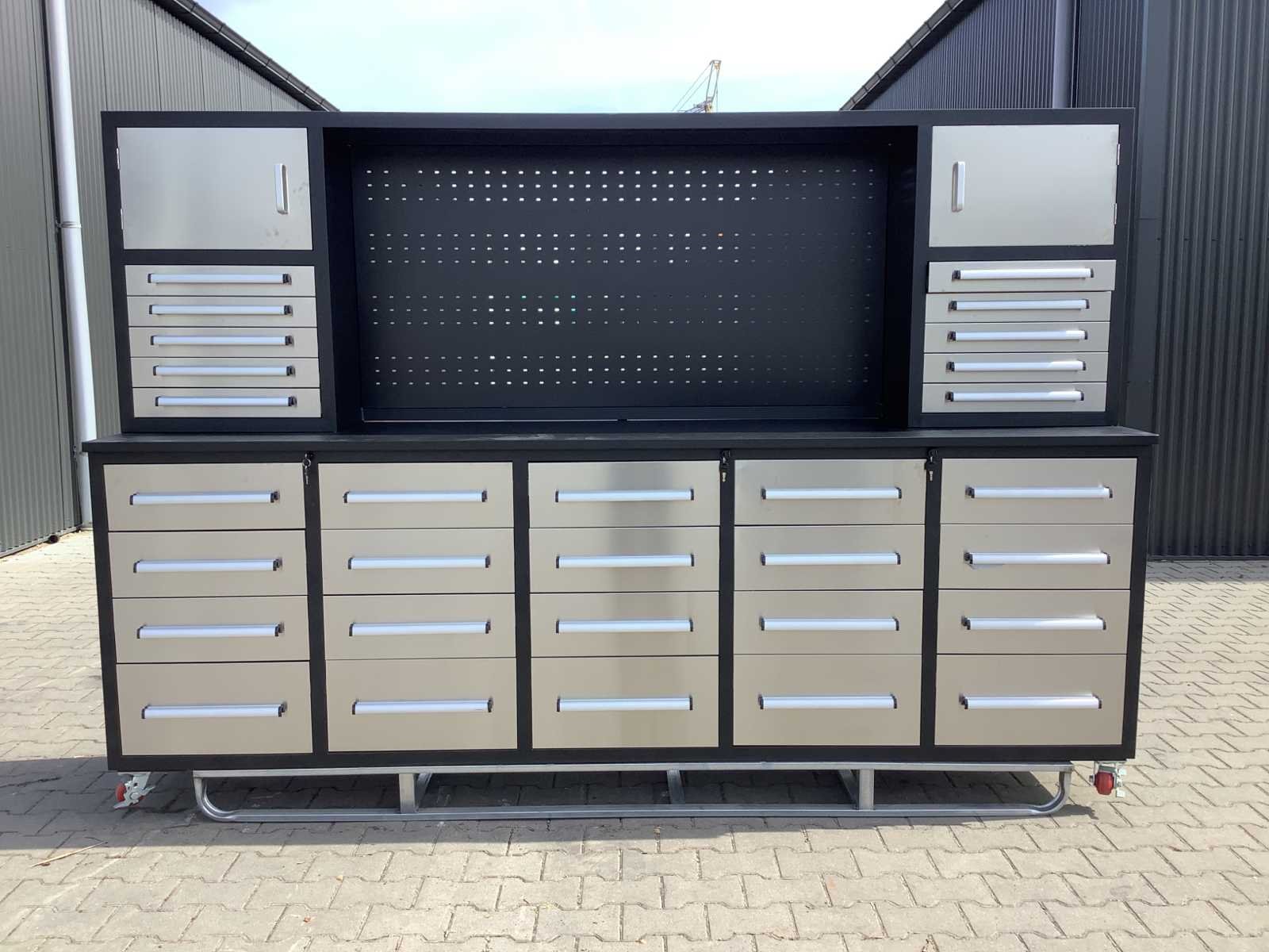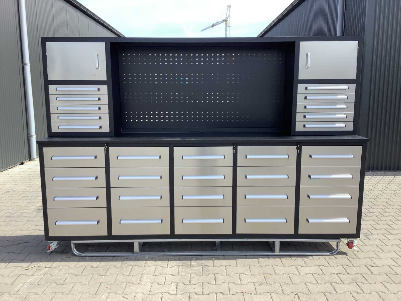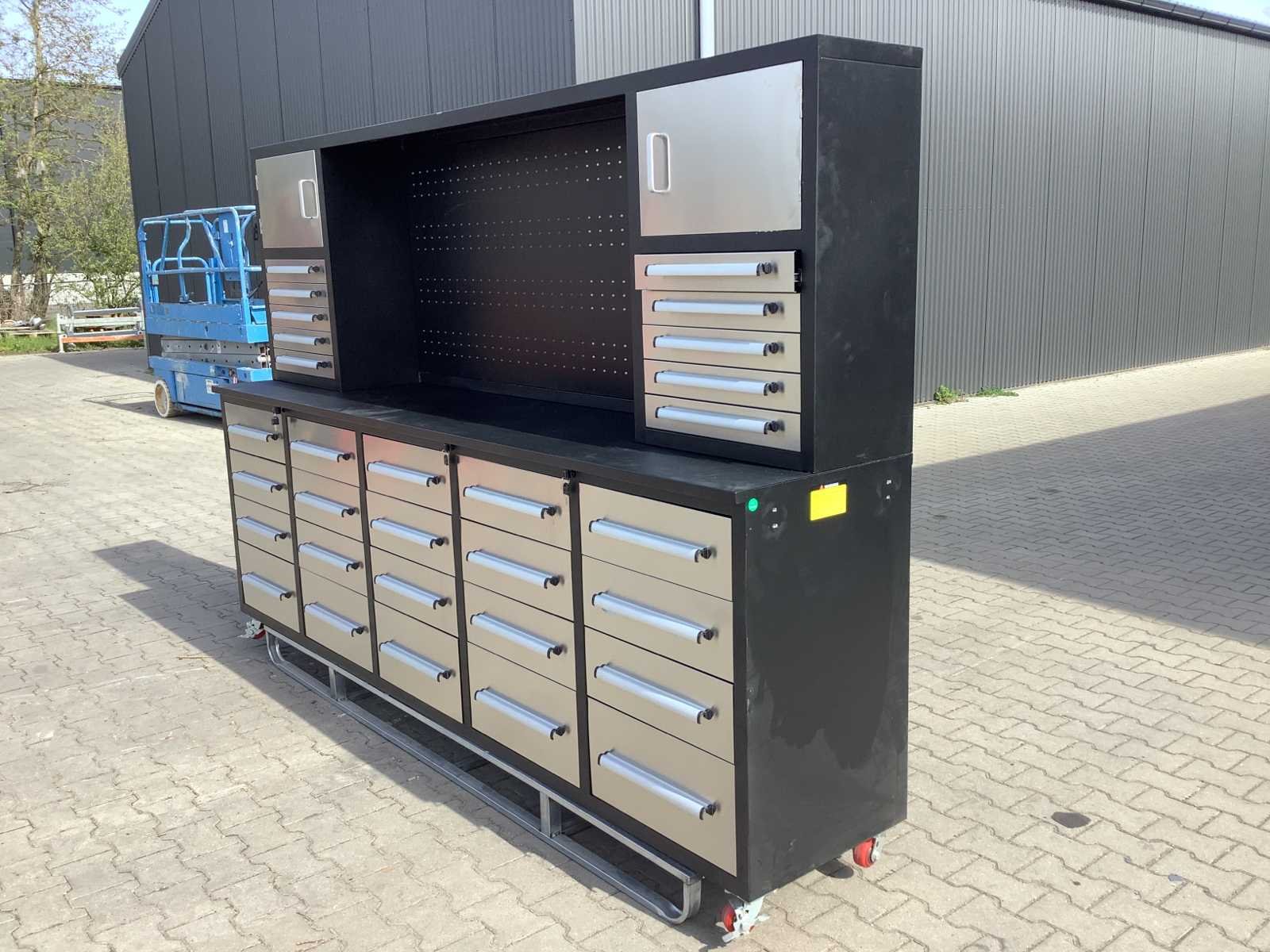 Modulair, 2-delig, verrijdbaar: voorzien van metalen werkblad, achterwand, 2 kasten, 30 schuifladen, onderste 20 laden afsluitbaar (2 sleutels mee inbegrepen) No Merk: Field Model: H10FT-30D-01C Breedte: 2840mm Lengte: 585mm Hoogte: 1900mm Materiaal: RVS / Stainless steel