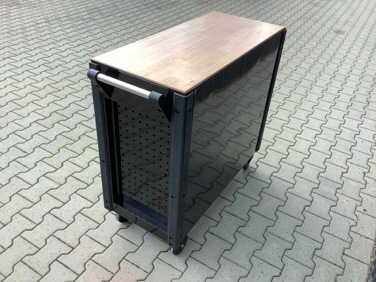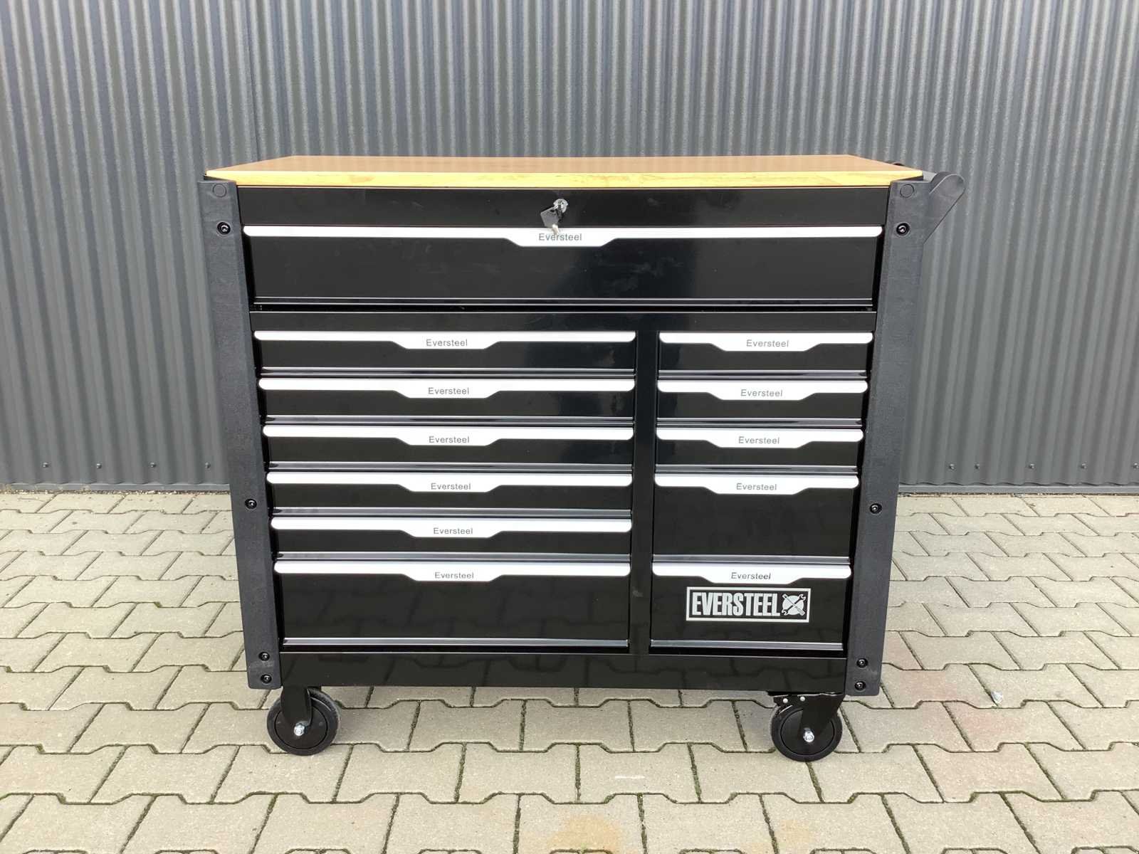 Voorzien van 12 laden; 10 laden gevuld met diverse gereedschappen en accessoires, lades en wielen voorzien van kogellagers, houten bovenblad (voor gebruik als werkbank), circa 1 meter werkhoogte; ongebruikt in doos No Merk: Eversteel Type: Jumbo XXXL 12/10 Professional Gewicht: 122kg Lengte: 108cm Breedte: 105cm Hoogte: 100cm Materiaal: Metaal & hout