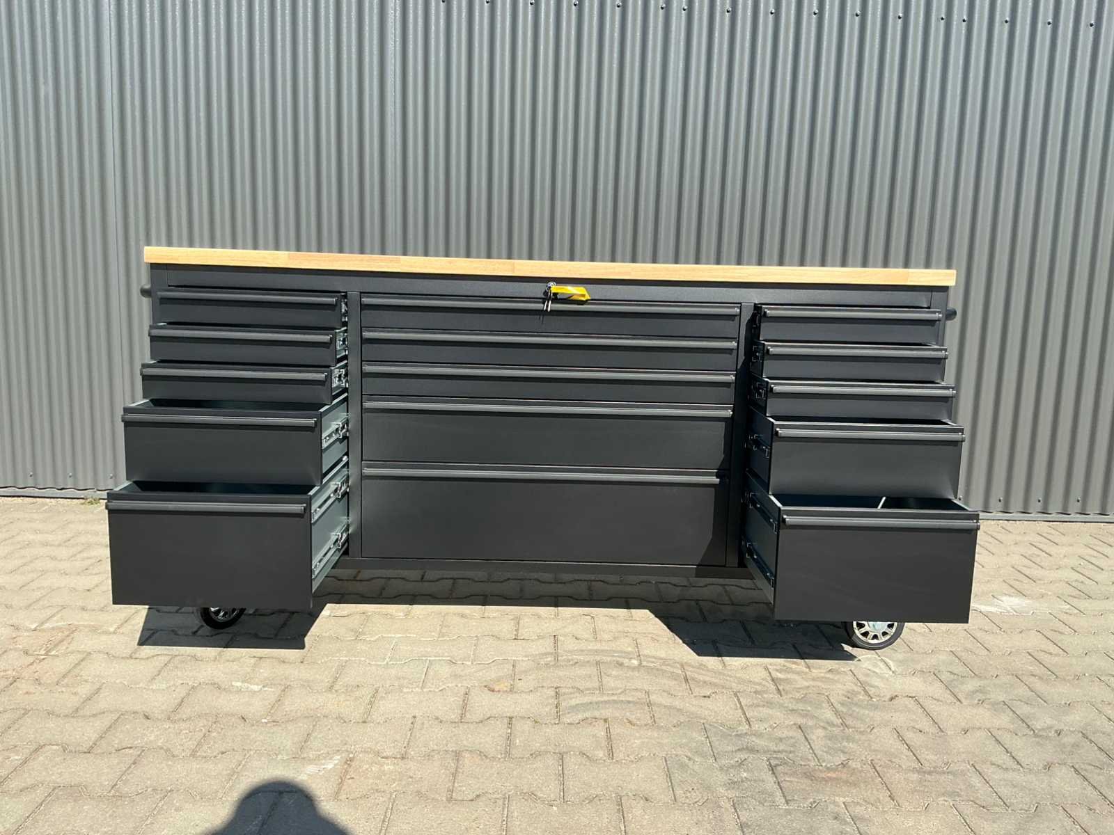 Breedte 180 cm Voorzien van poedercoating, luxe afgewerkt rubberhouten werkblad, 15 laden, 4 zwenkwielen (2 voorzien van rem), ongebruikt in doos. No Merk: Field Type: 7215 Black Premium Bouwjaar: 2025
