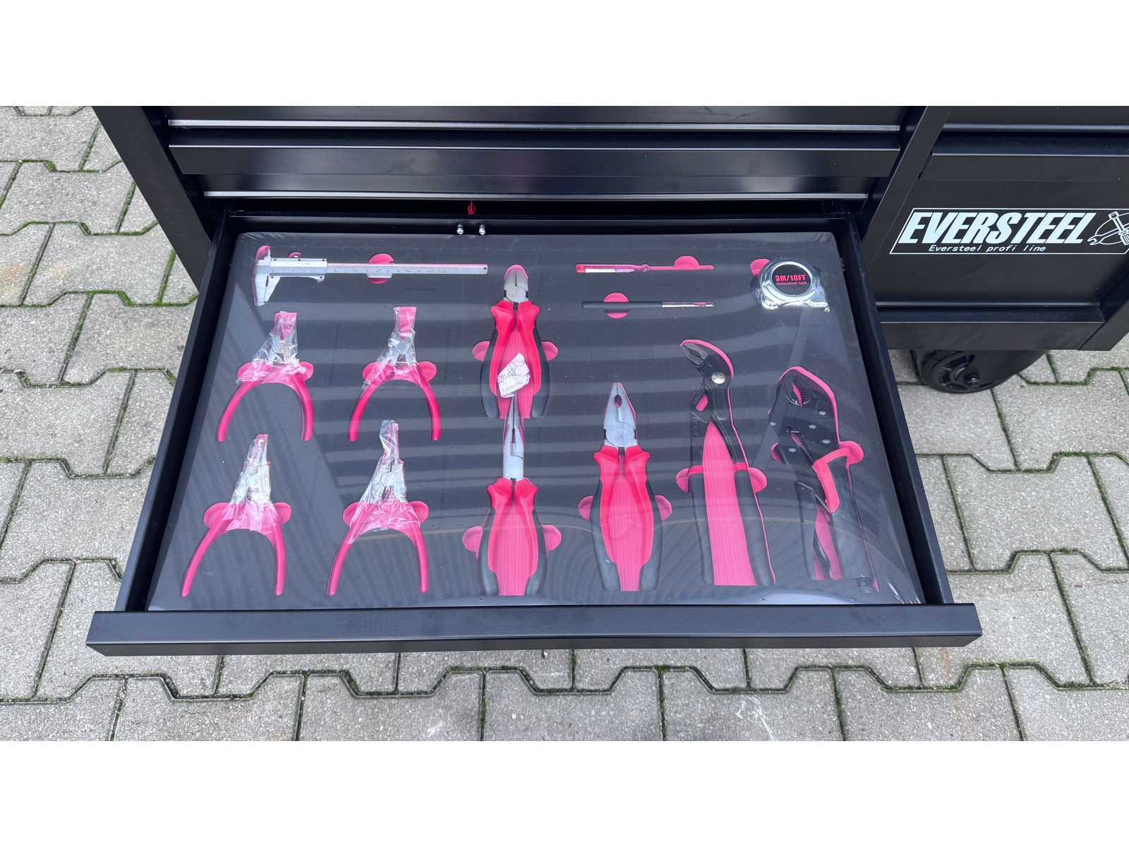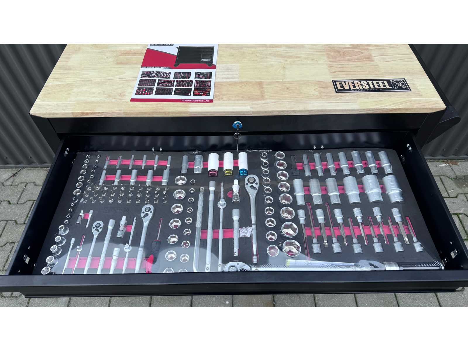 Voorzien van houten blad, gevuld met diverse gereedschappen. No Merk: Eversteel Model: 14/11 Materiaal: Metaal & hout