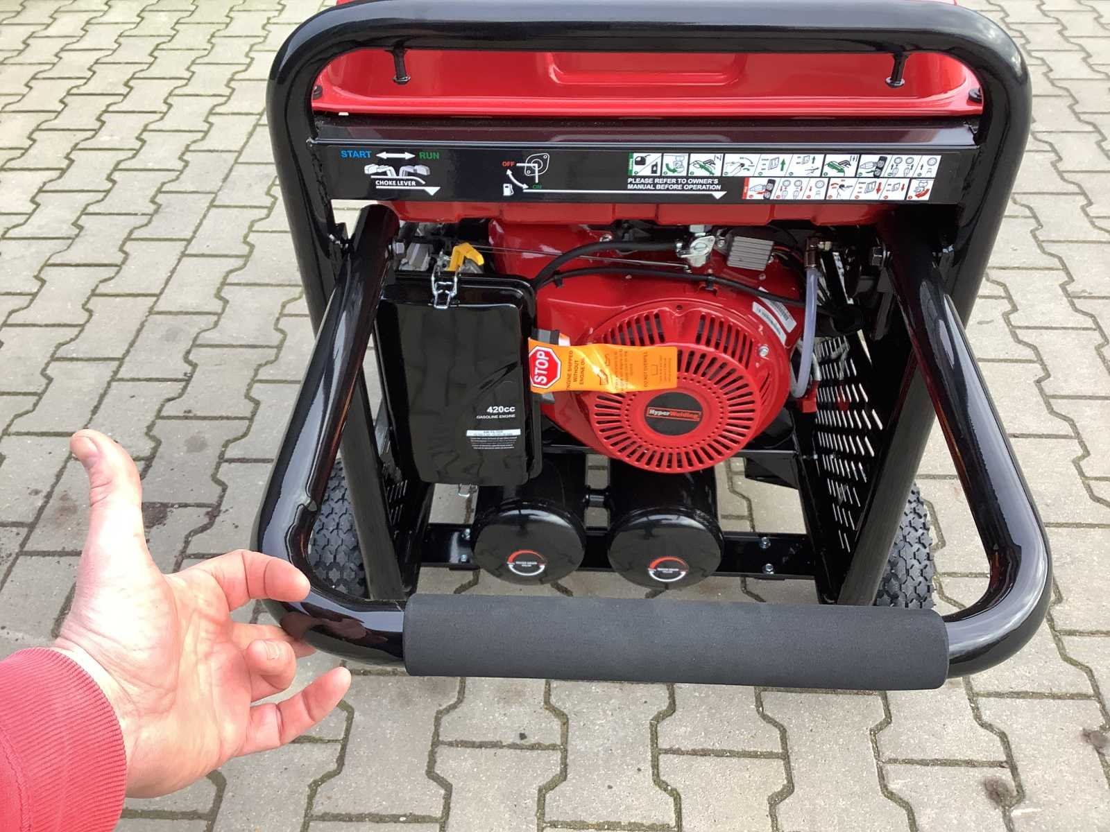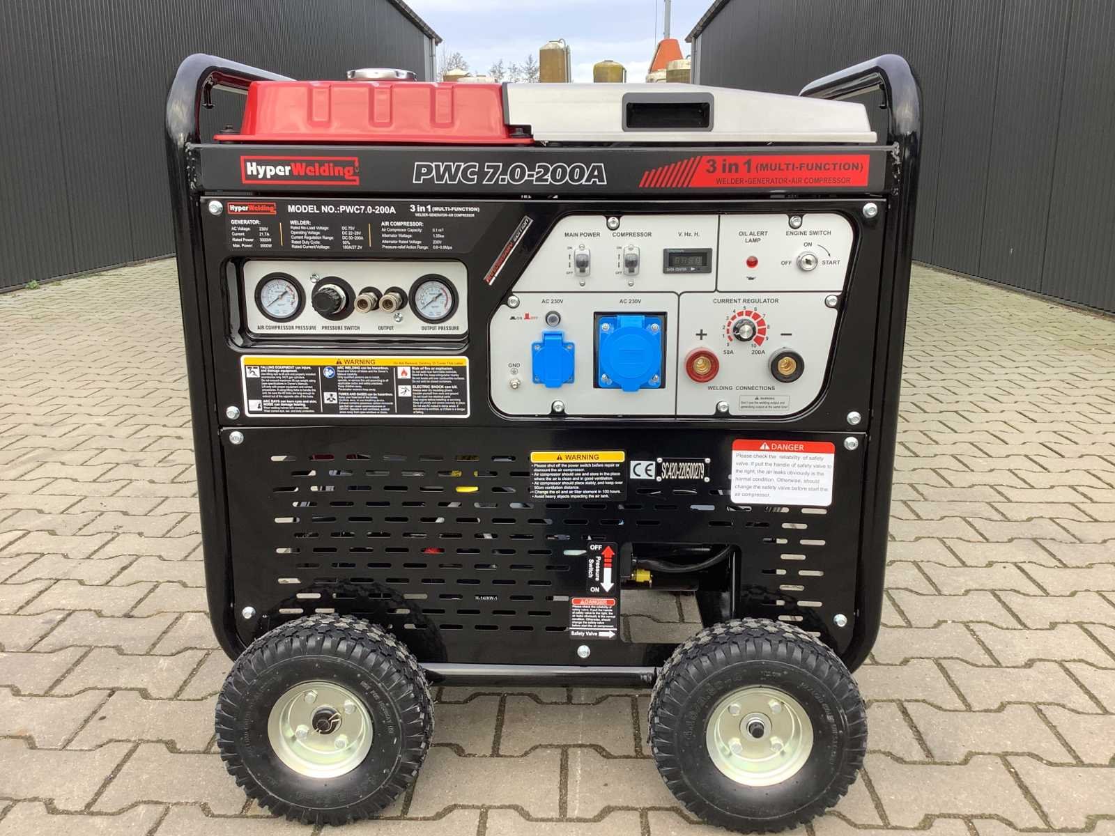 3-in-1 mobiel werkstation met 5,5 kVA stroomgenerator met 230 Volt outlet, klein/groot (= functie 1), lasapparaat met 200 Ampère stroomsterkte (= functie 2); 1,35 kW luchtcompressor, 10 liter tankinhoud, 8 Bar (= functie 3). voorzien van 420 cm3 benzinemotor; elektrische start + trekstart; wordt geleverd inclusief 12 Volt startaccu; diverse toebehoren; handboek; ongebruikt No Merk: Hyper Welding Type: PWC 7.0-200A Multi-Function Bouwjaar: 2025 Handboek aanwezig: true