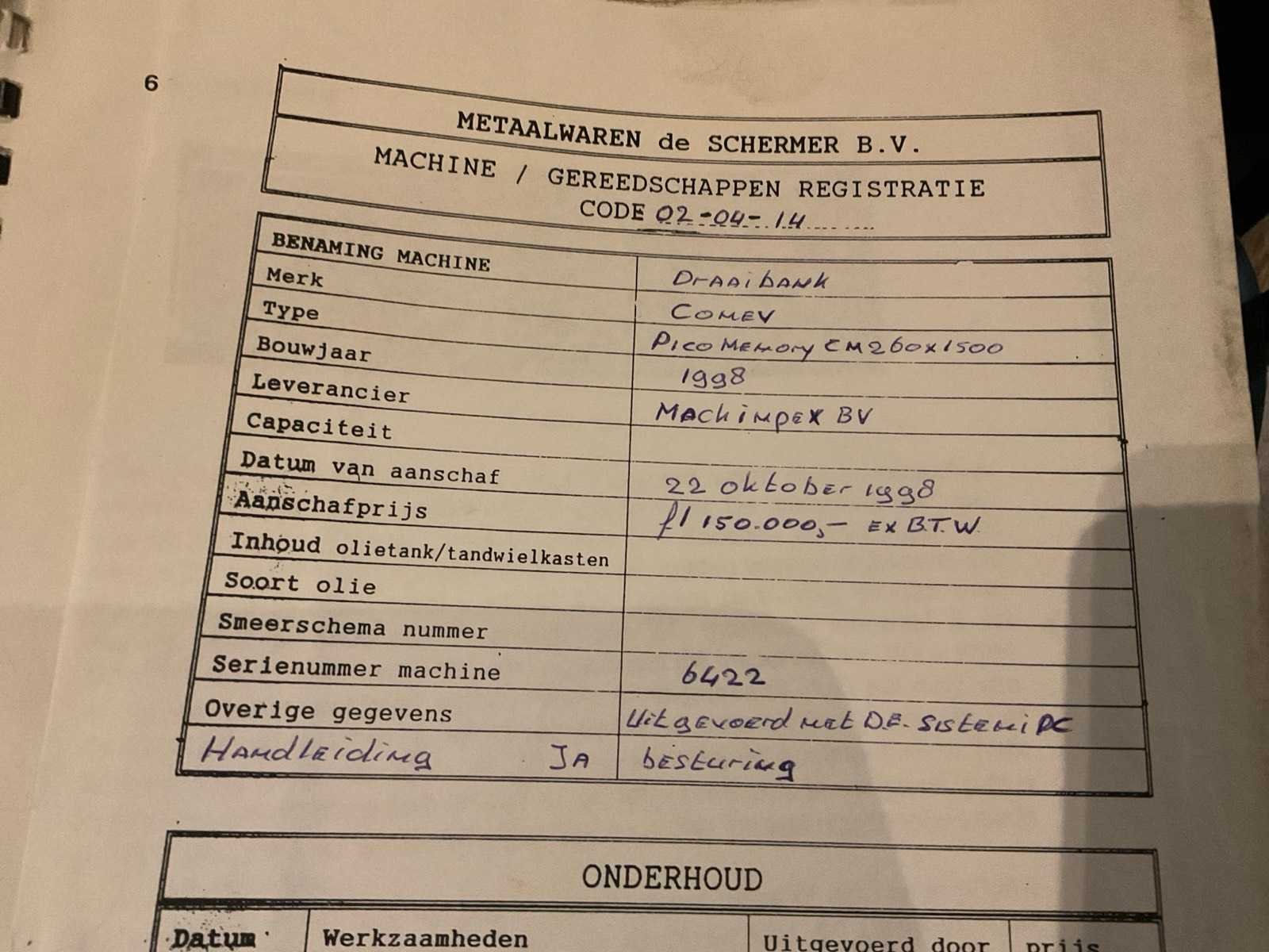 Nee Merk: Comev pico Type: 260/1500 Draailengte: 1500mm Holle spil Ø: 110mm Koelmiddelpomp: true Aansluiting: 380V Machinegewicht: 4000kg Afmeting l: 3000mm Afmeting b: 1700mm Afmeting h: 1900mm Leveringsvoorwaarden: Geladen op vrachtwagen